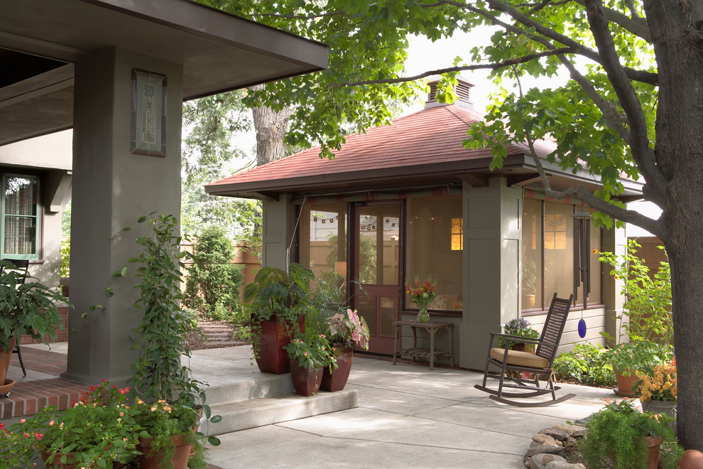 - Meio aberto. Está localizado na varanda. Por um lado, tem uma parede, os outros três estão completamente abertos ou equipados com um corrimão. Também não é abafado, mesmo no calor, mas chegar até a casa principal é muito mais fácil - isso é importante se a eletricidade, por exemplo, estiver apenas nela.