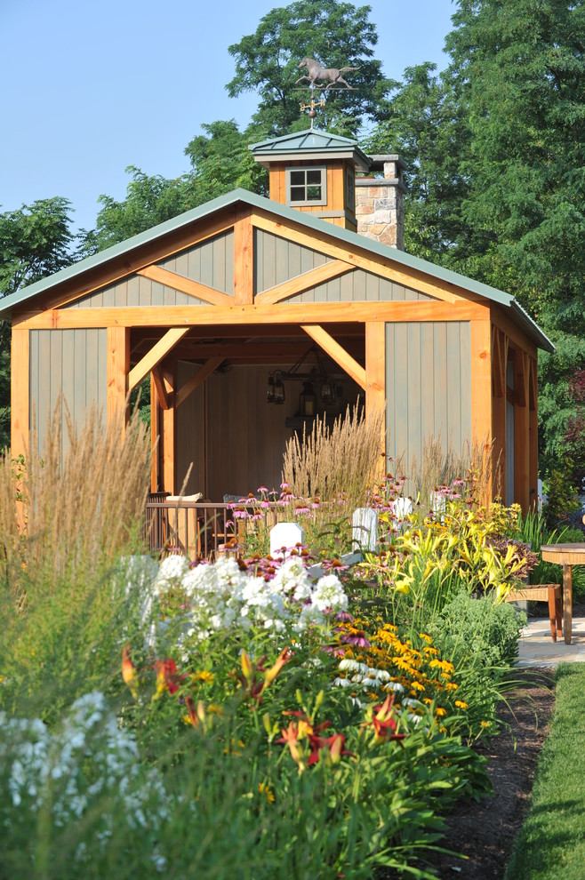 Se você tem um caramanchão ou varanda de madeira, esse estilo é mais adequado. Tudo deve ser de madeira, até o chão. A mesa é enorme. Em vez de cadeiras - bancos.O conjunto deve parecer mais ou menos trabalhado, e o azulejo deve estar disfarçado de fogão (ou você pode fazer um forno de verdade). No chão - um tapete de tecido, nos postes - feixes de cebola, alho, ervas. No canto - um baú com alguns móveis de cozinha úteis. Pratos - com uma pintura tradicional. As cores principais são simples - madeira, branco, vermelho, amarelo.