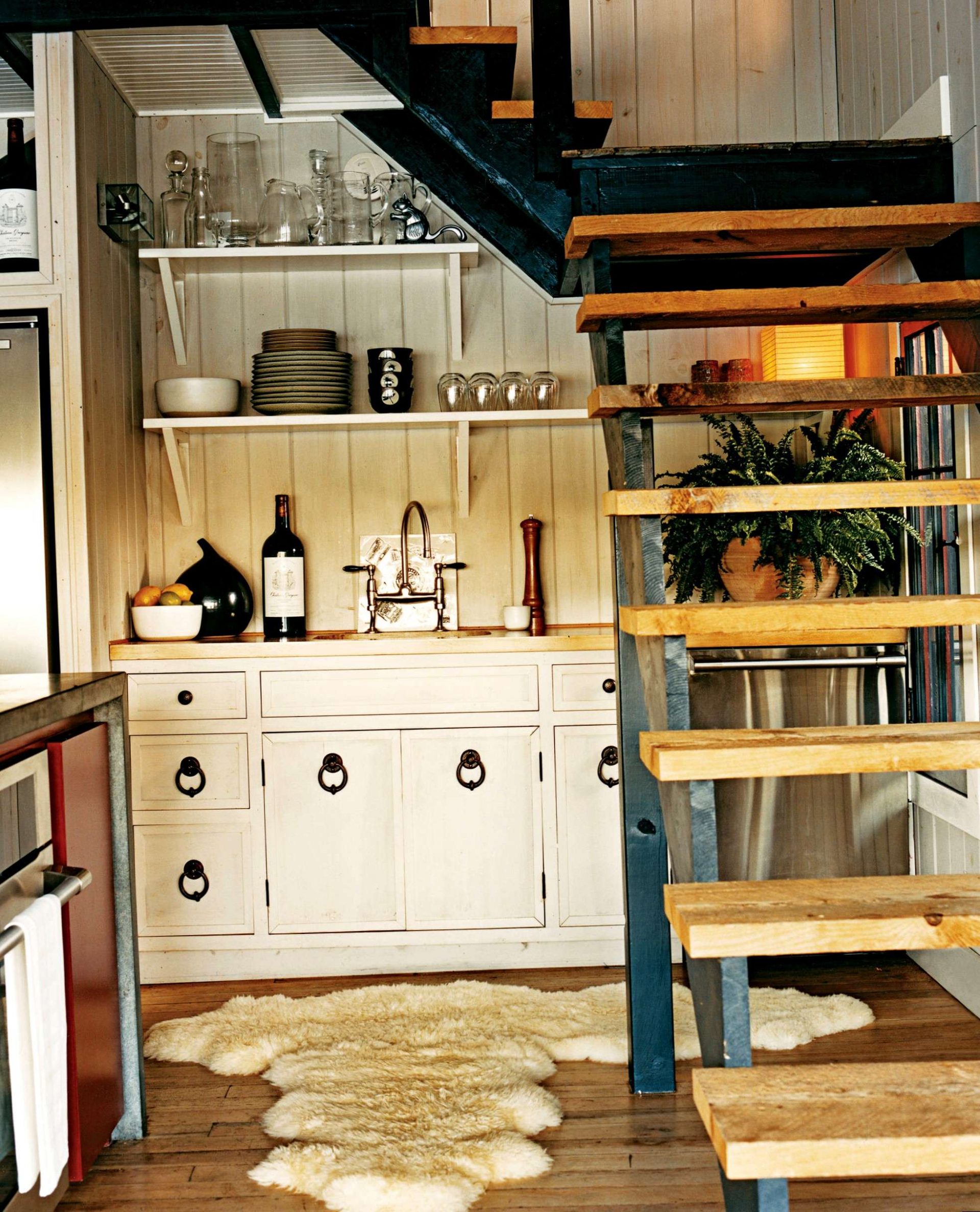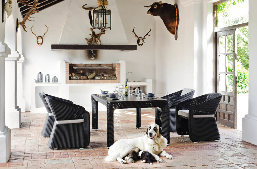 Materiais - madeira, bambu, cana. Móveis de vime, elegantes, rattan ou materiais similares. Iluminação dispersa, aconchegante, de preferência imitando velas reais. Em vez de uma lareira, a geladeira deve parecer um armário. Nos tapetes, nas janelas as cortinas de junco. Dos acessórios - cerâmica, que parece ter sido moldada à mão, bugigangas de barro. As cores são naturais. Árvore, verde, vermelho escuro, quase marrom, amarelo arenoso.