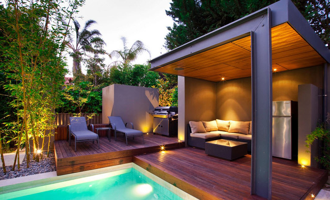 Se você tem um gazebo com uma grade de ferro forjado, é um pecado não usá-lo e não dar a aparência de um leste refinado. As cores do estilo árabe são azul, escarlate, dourado, branco, esmeralda. As telhas no chão devem ser estampadas e coloridas, de um pilar de suporte para outro, para pendurar cortinas leves de tecido acetinado ou similar. A mesa deve ser baixa, em vez de cadeiras travesseiros. Cozinhar também é recomendado enquanto está sentado, colocando o azulejo mais perto do chão, mas se for incomum, você pode deixar o conjunto de cozinha habitual, o principal é combinar as cores. Lâmpadas de metal com velas de verdade, fumante com incensos e potes de vidro com chá e especiarias completarão o quadro.