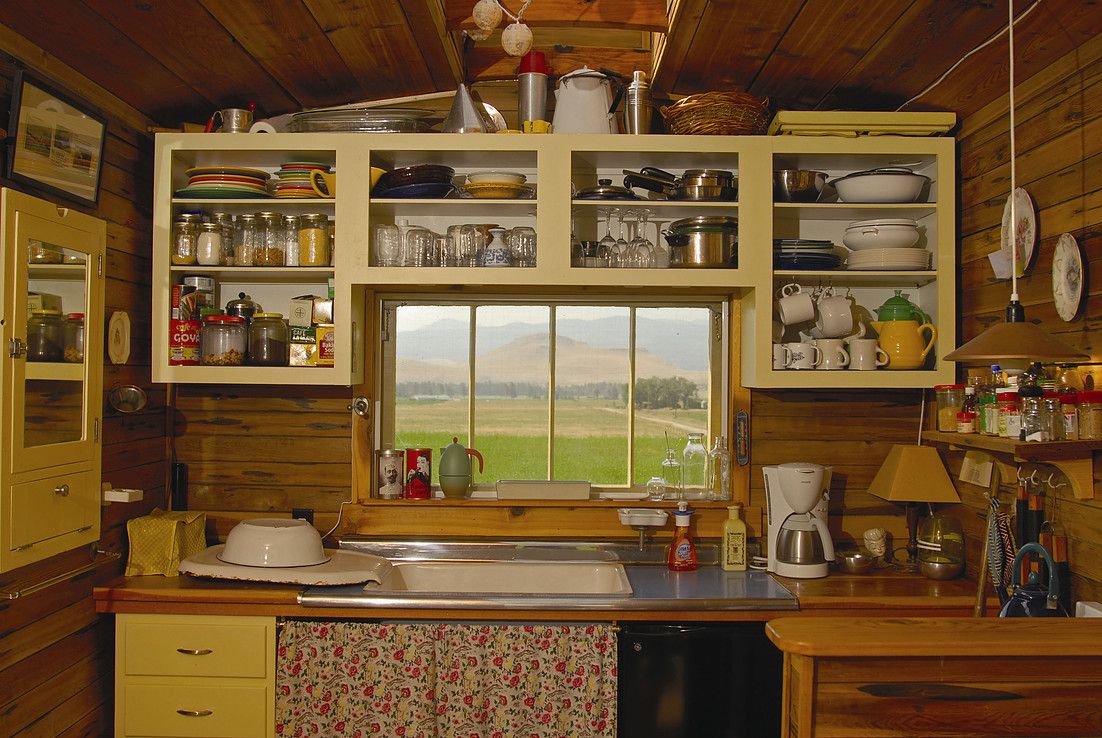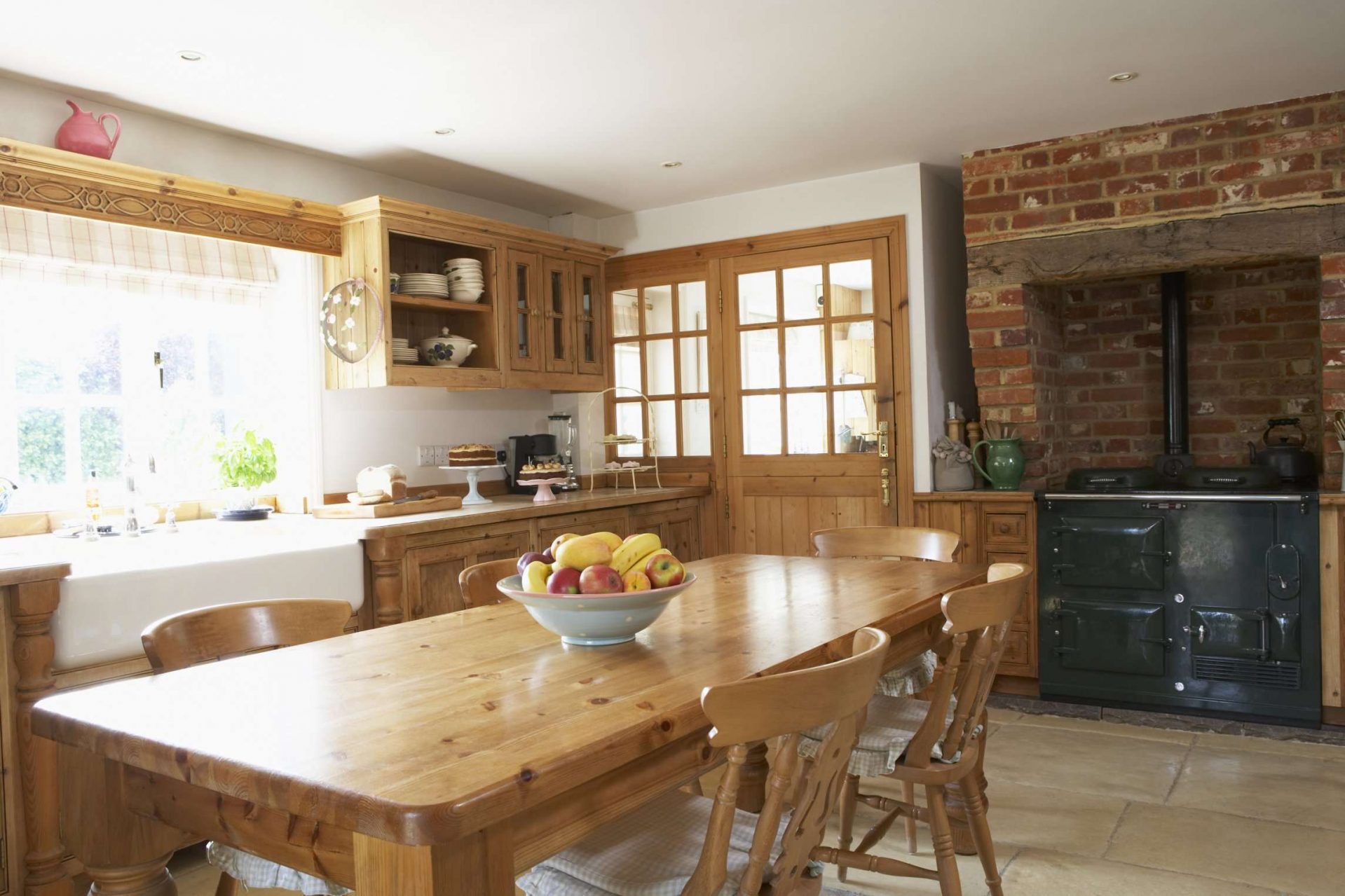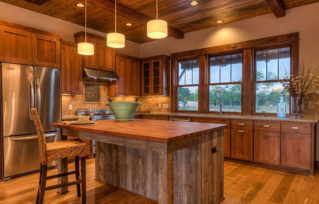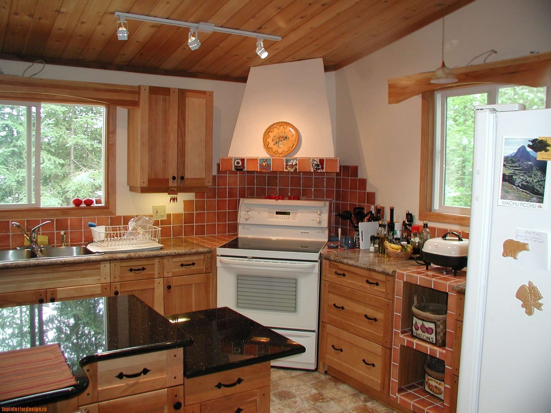 Também rústico, mas o americano. O chão deve ser enfrentado com pedra, todo o resto - com madeira. O mobiliário é volumoso (mas você não pode bancos de madeira, mas cadeiras de madeira). Na mesa toalha de mesaplacas elegantes colocadas estantecolocar cadeiras macias cobre em uma gaiola ou polka dot. Use uma lâmpada de querosene como luz.