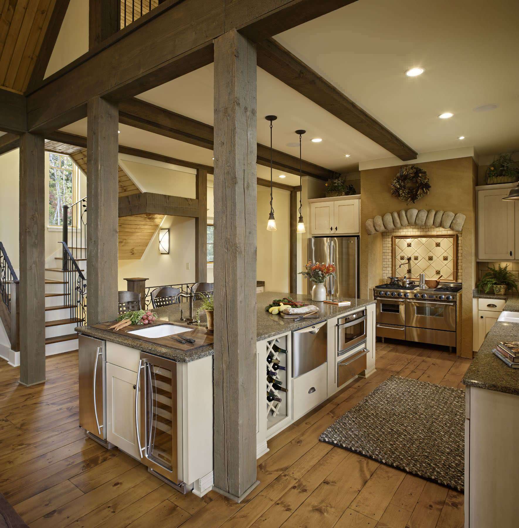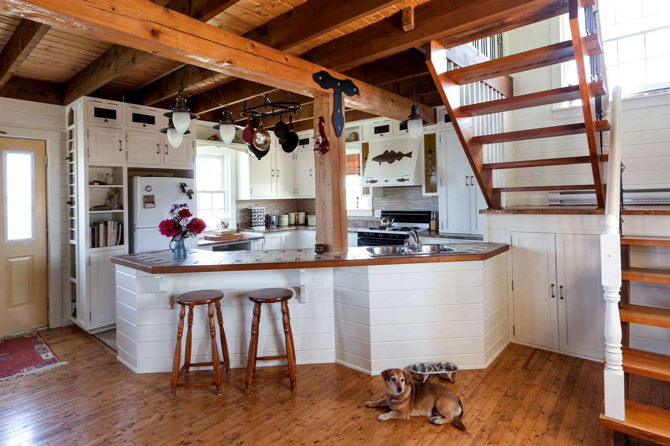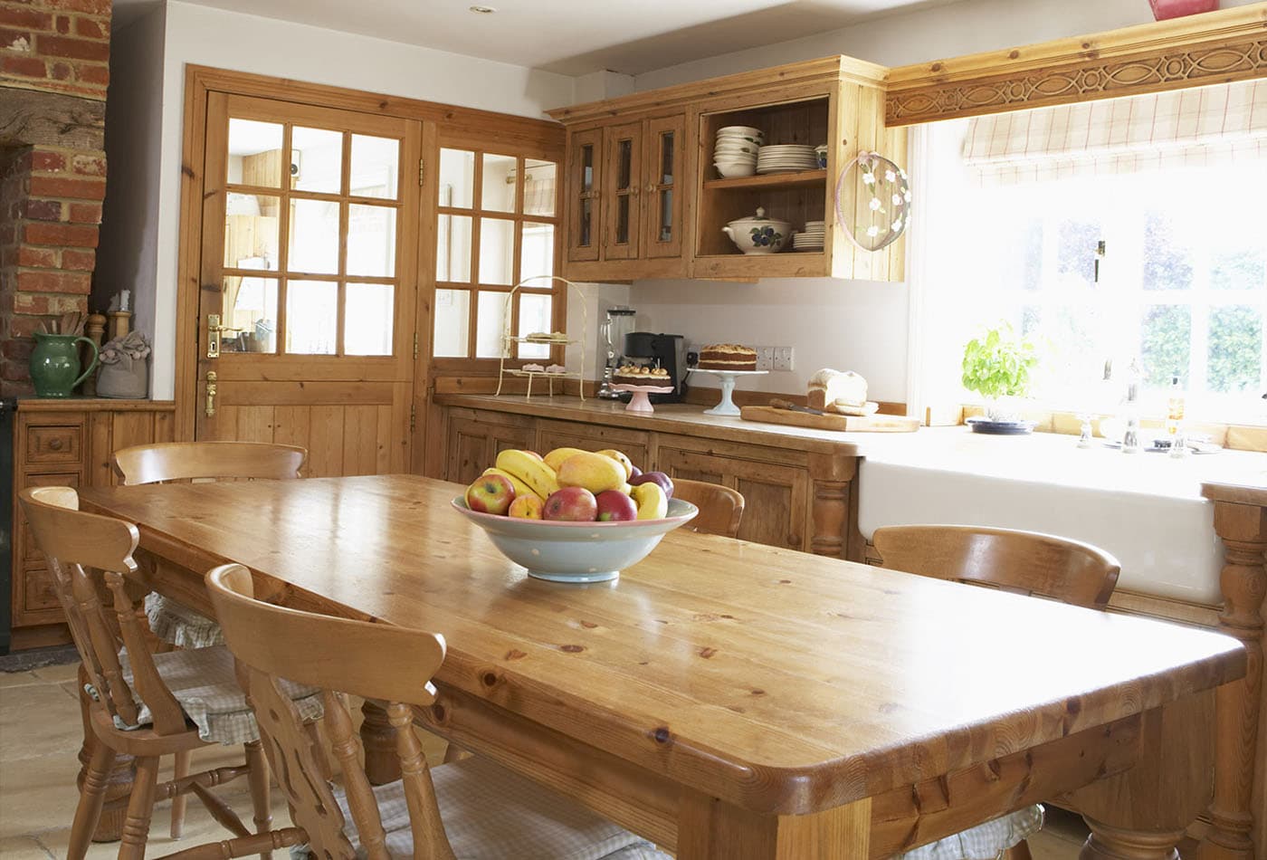 Também rústico, mas o americano. O chão deve ser enfrentado com pedra, todo o resto - com madeira. O mobiliário é volumoso (mas você não pode bancos de madeira, mas cadeiras de madeira). Na mesa toalha de mesaplacas elegantes colocadas estantecolocar cadeiras macias cobre em uma gaiola ou polka dot. Use uma lâmpada de querosene como luz.