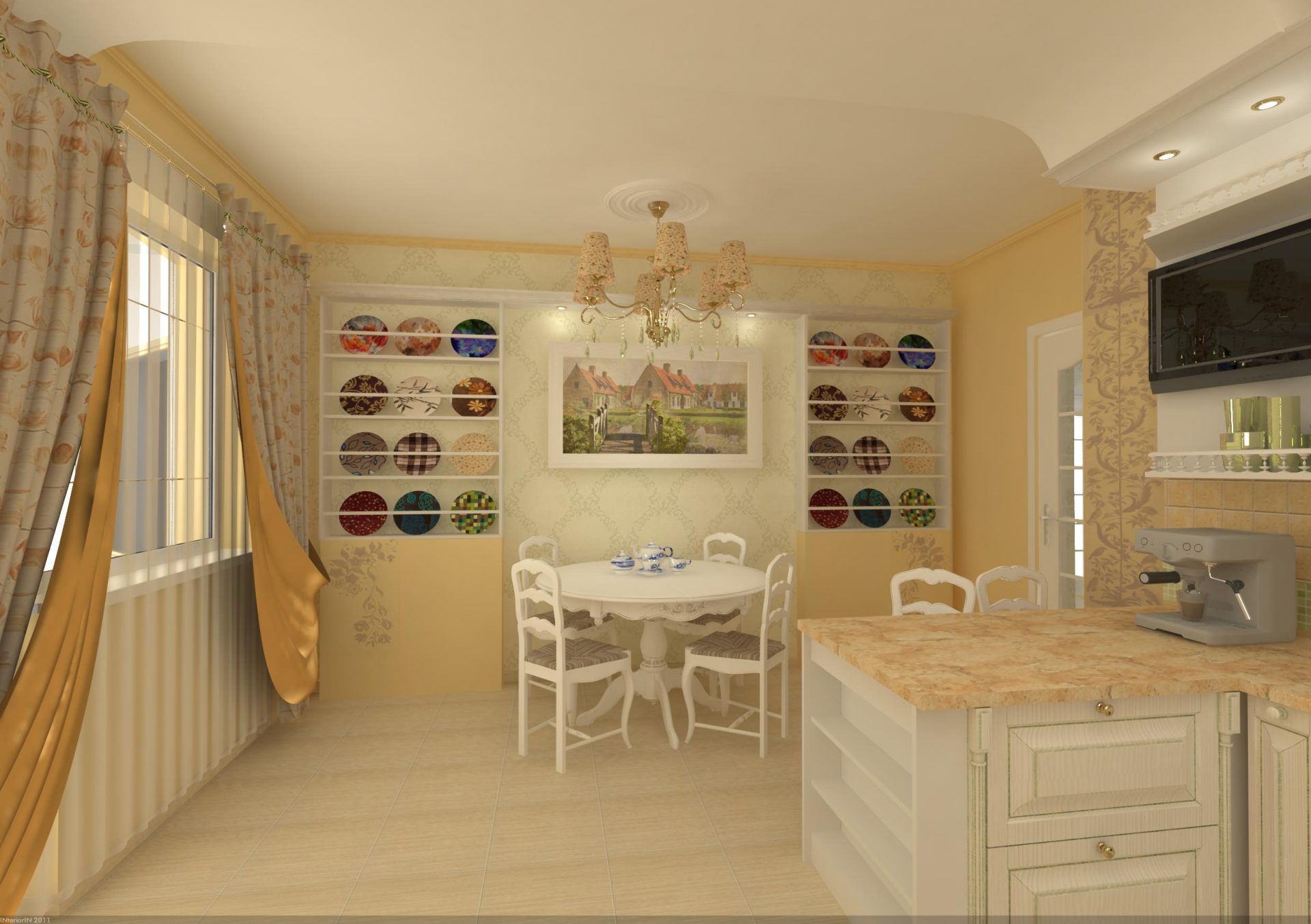 Há azulejos ou madeira no chão, papel de parede colorido nas paredes, pintar o teto em branco ou gesso. O mobiliário é fino, elegante, você pode vime, você pode cadeiras com costas de ferro forjado. Mesa de preferência redonda, pequena. As cortinas na janela são café, curto, na mesa é desejável ter uma pequena lâmpada sob o abajur, sob o teto de uma lâmpada em um abajur similar. Certifique-se de vaso com flores no peitoril da janela, certifique-se de ter muita luz, pratos elegantes, aroma floral e cheiro de cozimento. No chão você pode colocar um tapete frívolo em flores, mas você pode ficar sem ele.