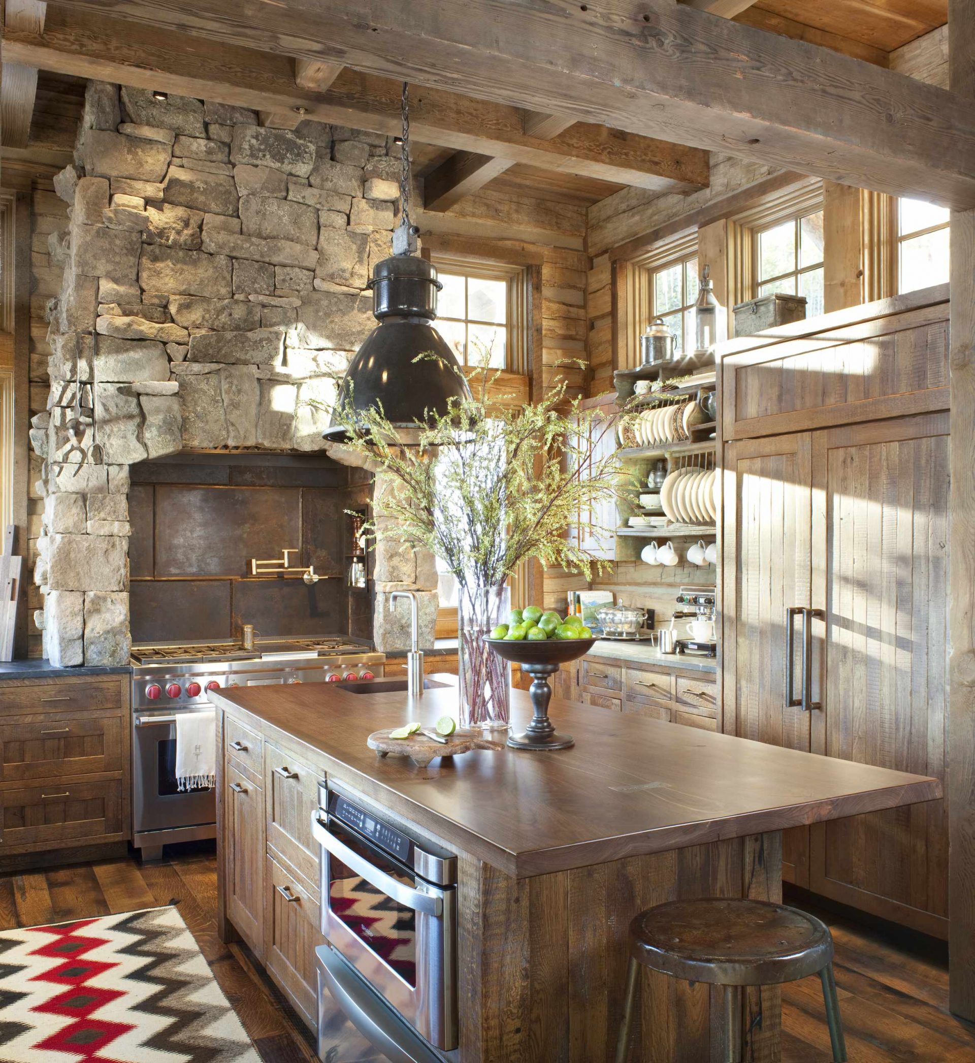 Na verdade, o mesmo estilo que pode ser usado para projetar uma cozinha aberta. O chão é de pedra, as paredes são de madeira, em vez de fogão ou lareira. Móveis de madeira, áspera, sobre a mesa você pode colocar uma toalha de mesa, no tapete do chão, que deve parecer que foi feito em casa, mãos. Os utensílios devem ser de barro, com um padrão geométrico simples. Cortinas - tecido leve. As cores primárias são naturais. Madeira, verde, marrom, você pode borrar vermelho escuro. A fonte de luz deve ser lareira, a lâmpada na mesa. Você pode pendurar uma lâmpada, imitando um querosene, no teto.