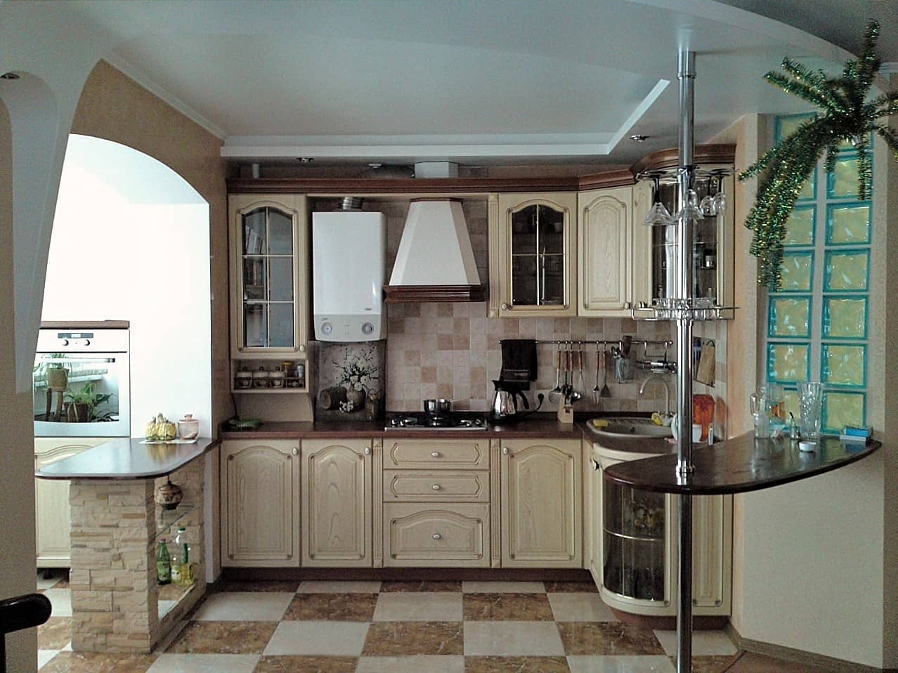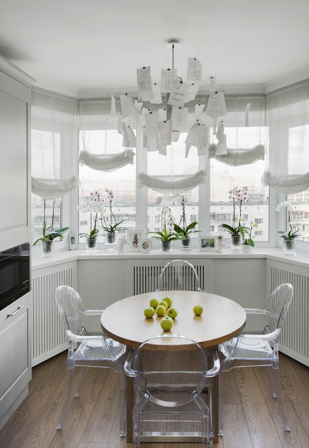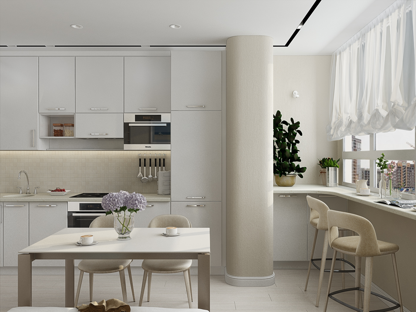 Se você tiver bastante tempo e esforço para remover as janelas e a porta da varanda, você pode combinar a cozinha com a loggia parcialmente. Uma grande vantagem é que você não precisa de permissão e a funcionalidade permanece completa. Além disso, o belo arco semicircular parece ainda mais espetacular do que a completa ausência da parede.