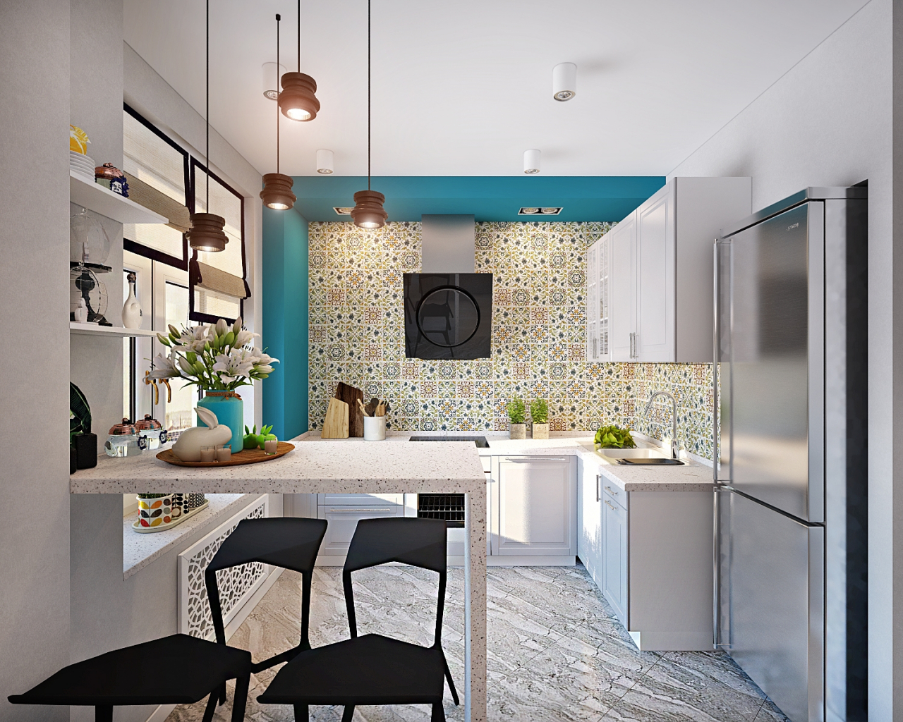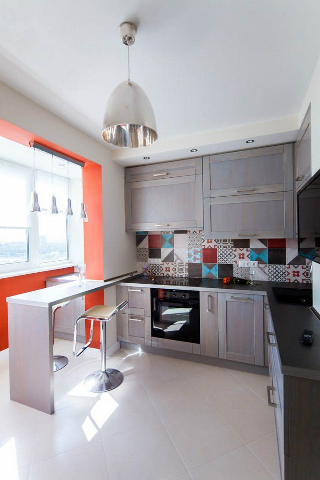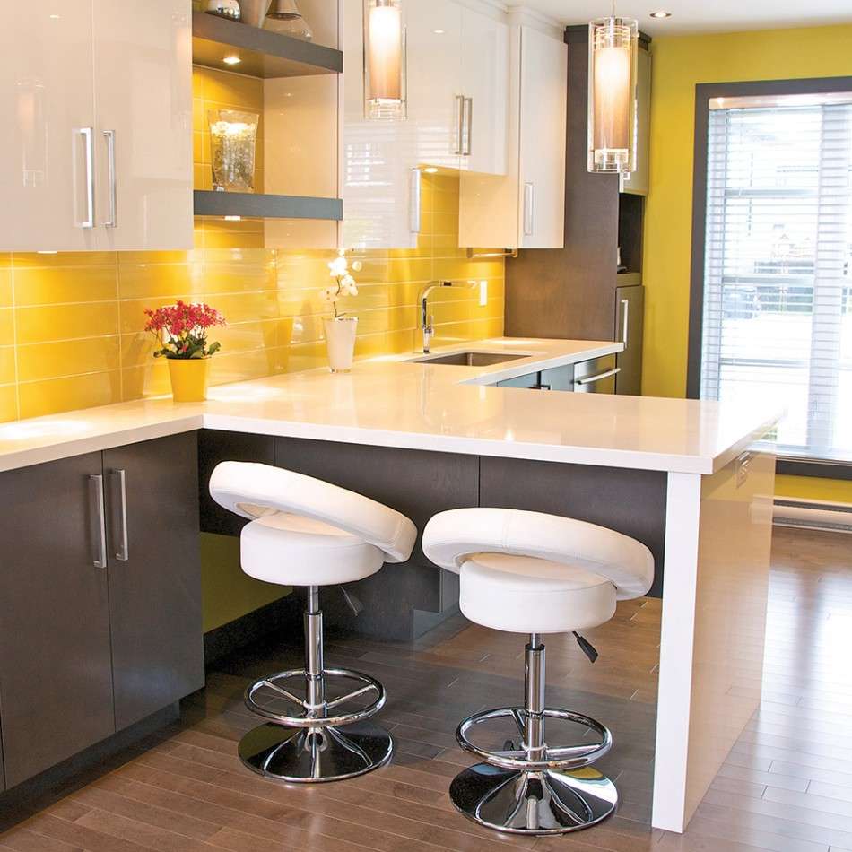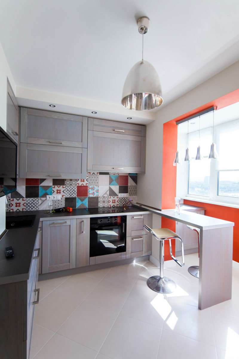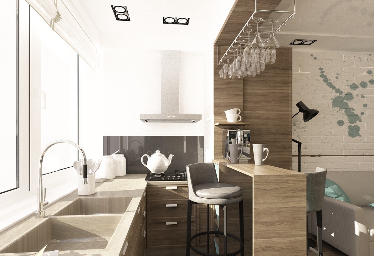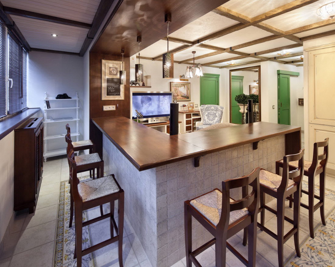- Balcão de bar. Ele pode ser fixado à parede em vez de um peitoril da janela e pode separar a área de jantar da área de trabalho. Deve ser alto, destacado por lâmpadas de cima. Abaixo estão prateleiras para armazenar coisas úteis.