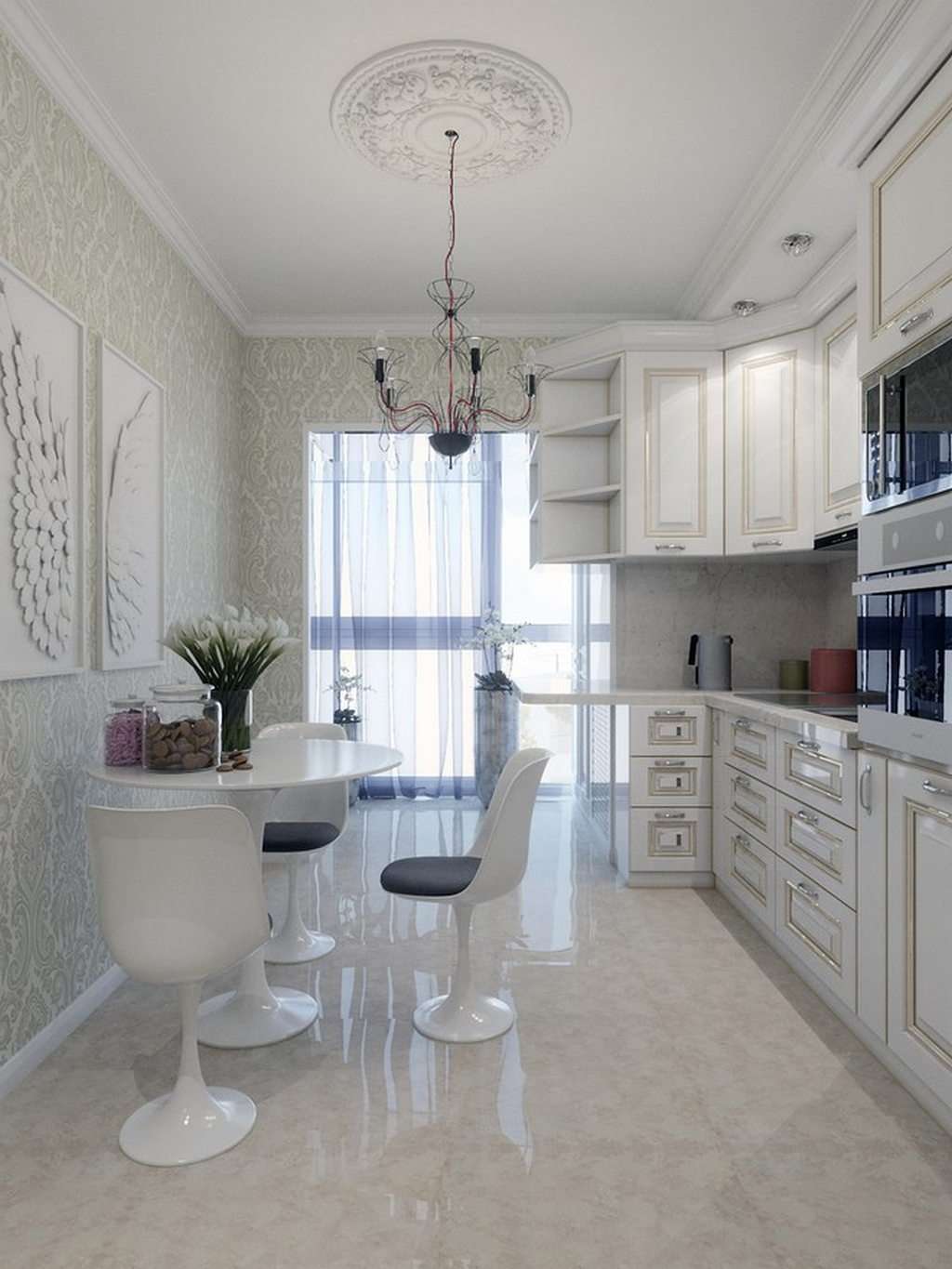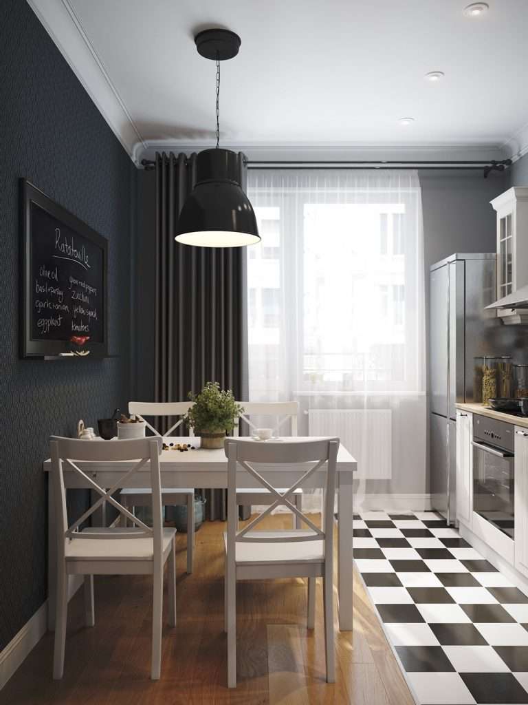 - Minimalismo. Não há cortina no arco, a mesa é simples, ao lado são cadeiras de plástico e metal. Sem acessórios, exceto por uma lâmpada simples na mesa (necessariamente um desenho geométrico). Se janelas cortinas, depois rolou, sem um padrão.
