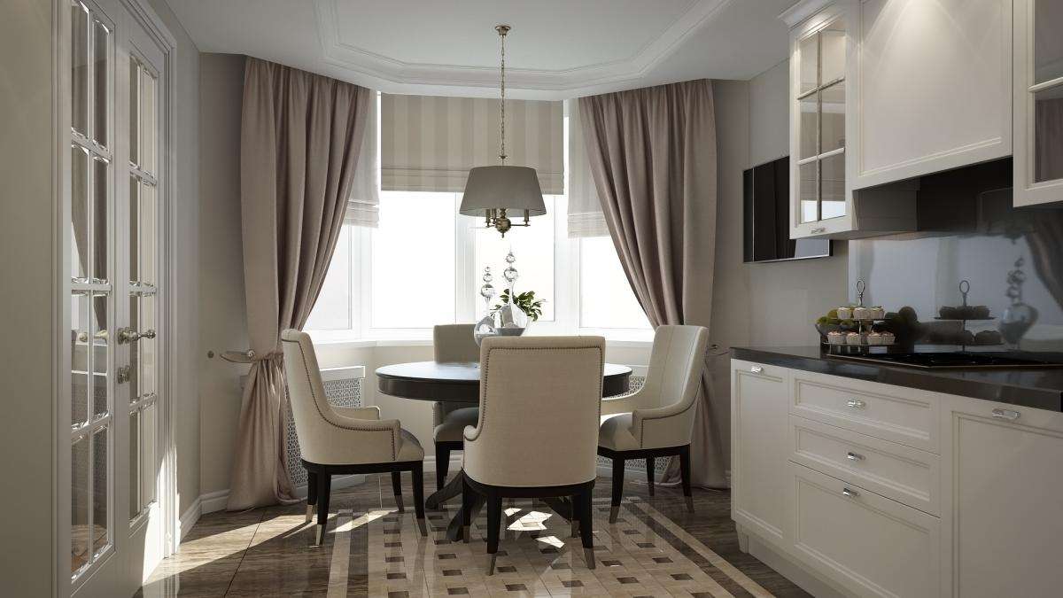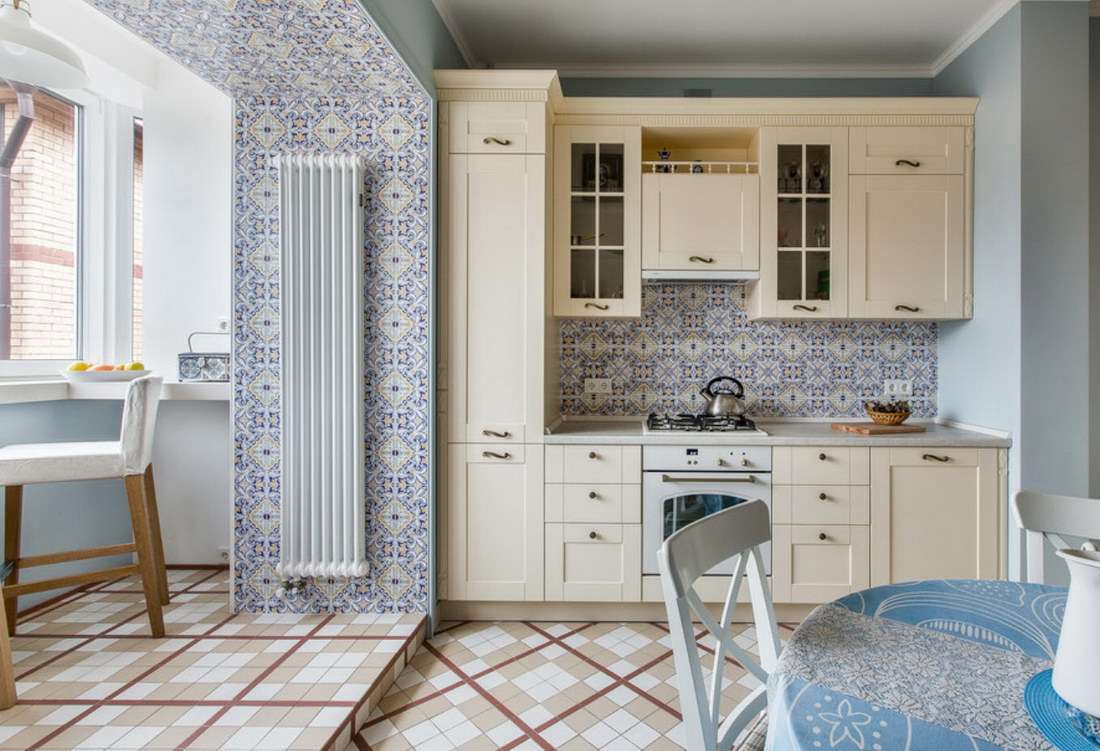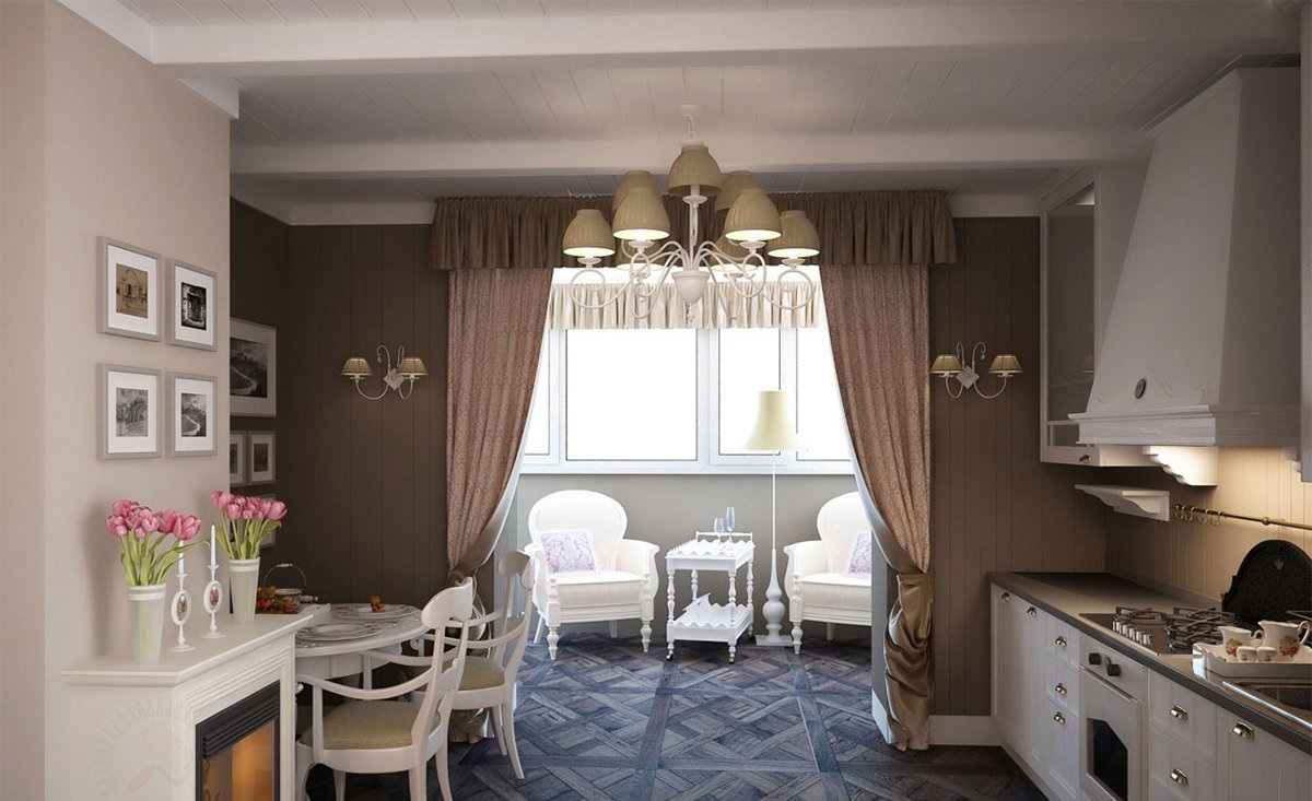 Para uma cozinha com uma loggia parcialmente anexada, os seguintes estilos serão adequados: