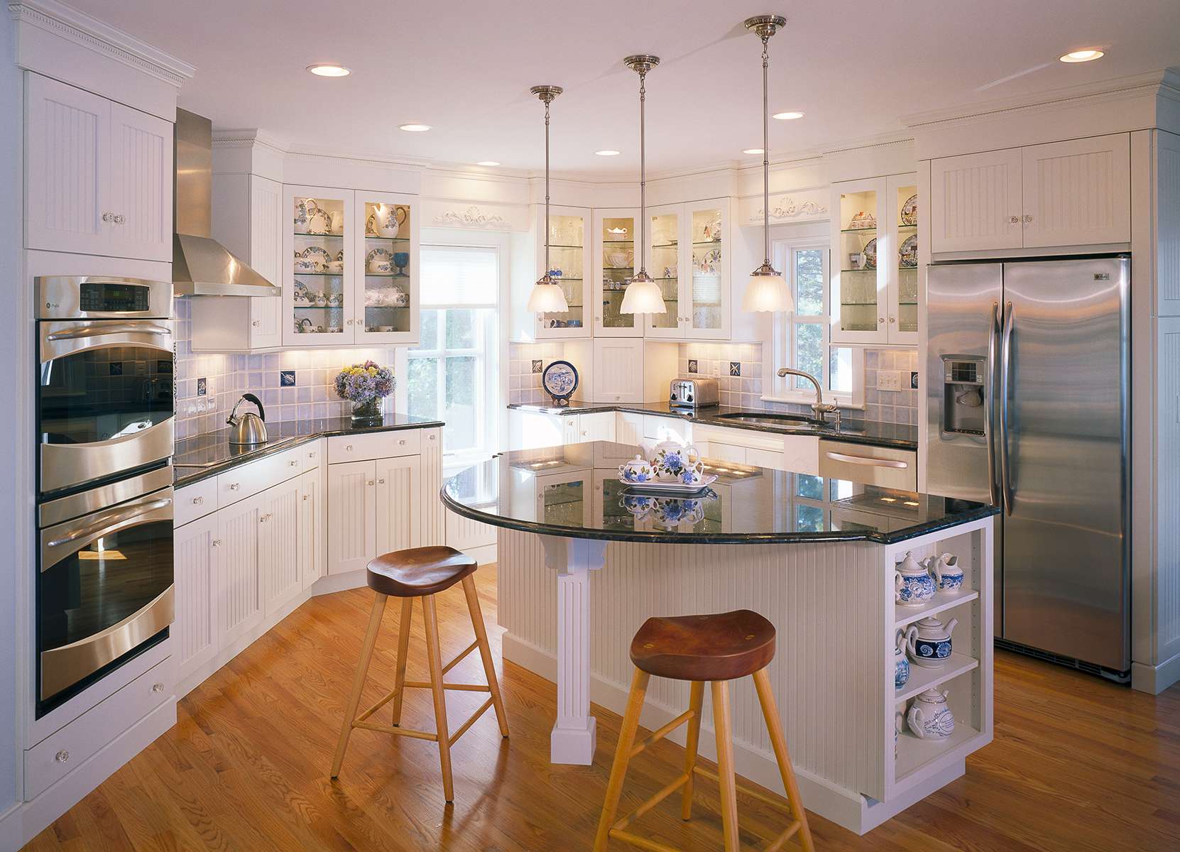 - Ilha clássica. É um pedestal grande ou vários pedestais. Ele não tem pernas, existe uma base. Acima da tabela padrão, sua superfície é mais larga. Fornece opções de cozimento úteis.