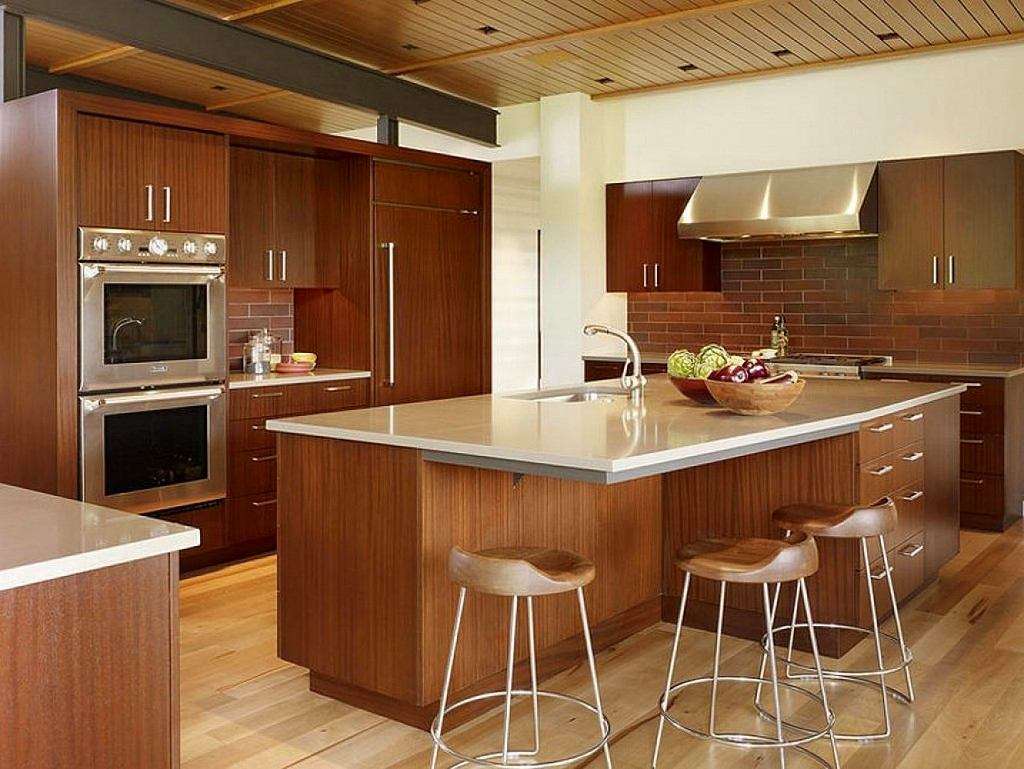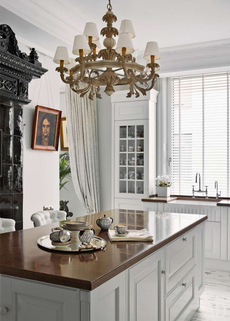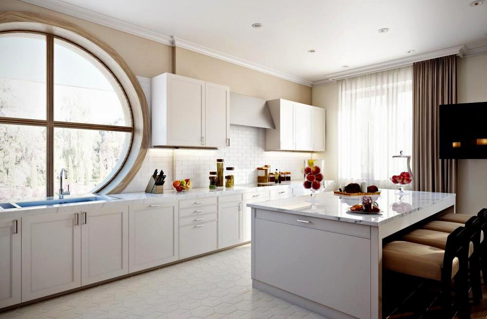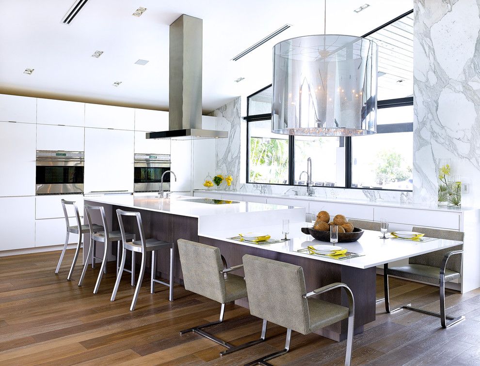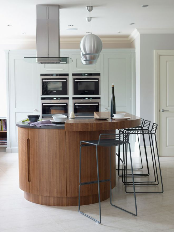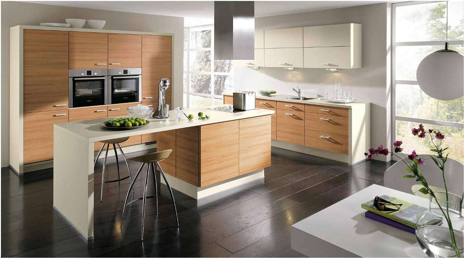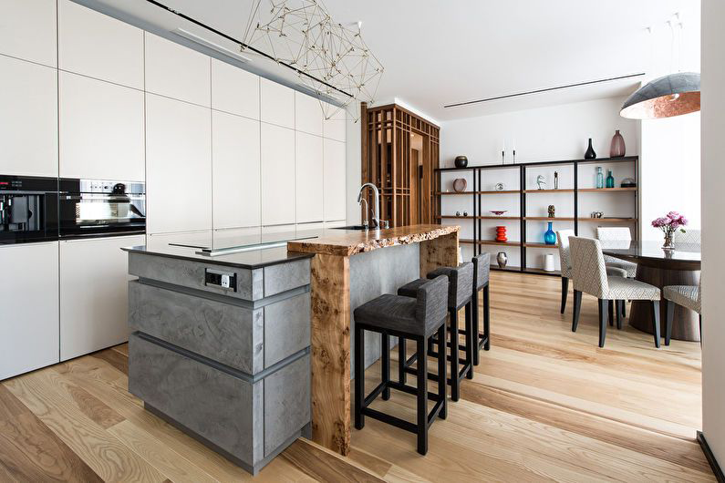 A cozinha parece um conjunto de cozinha e alta a mesa-uma ilha no meio da cozinha, cercada por cadeiras. Muitas vezes, esta não é uma simples mesa de jantar, mas vários pedestais conjuntos nos quais você pode embutir uma pia, máquina de lavar louça, batedeira, liquidificador e outras maravilhas técnicas que facilitam a culinária.