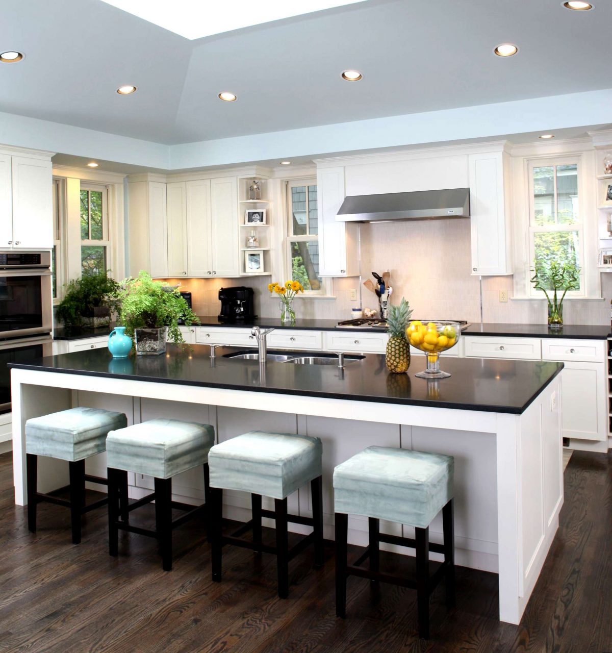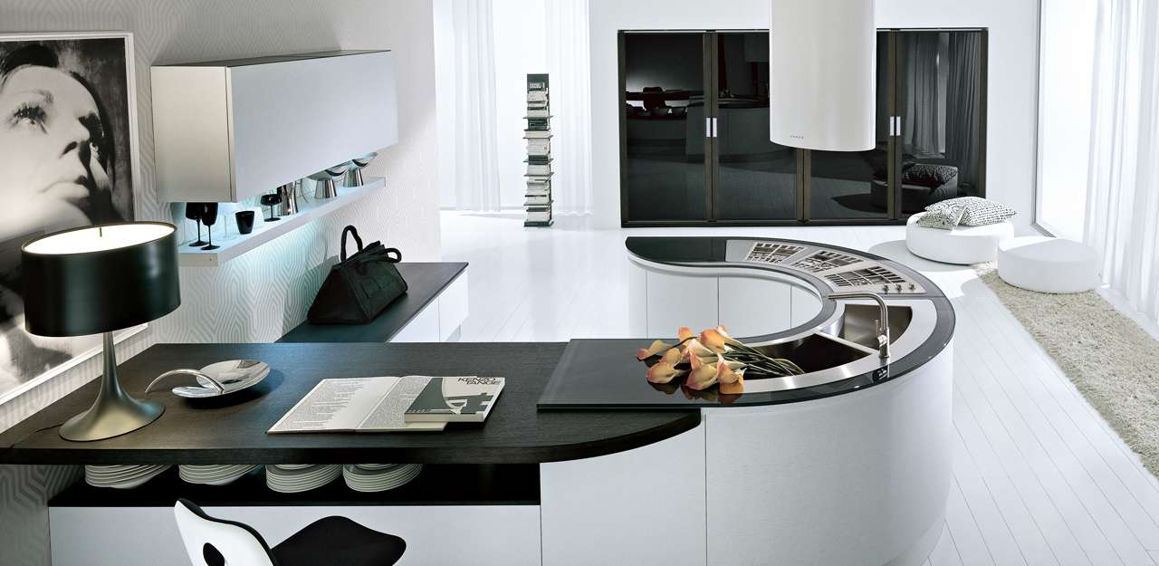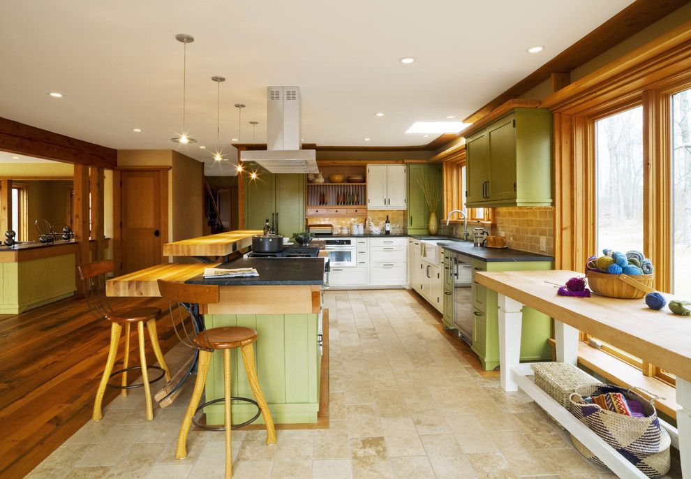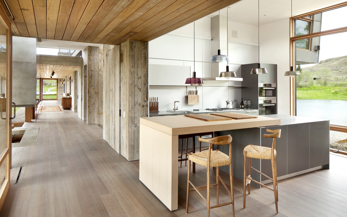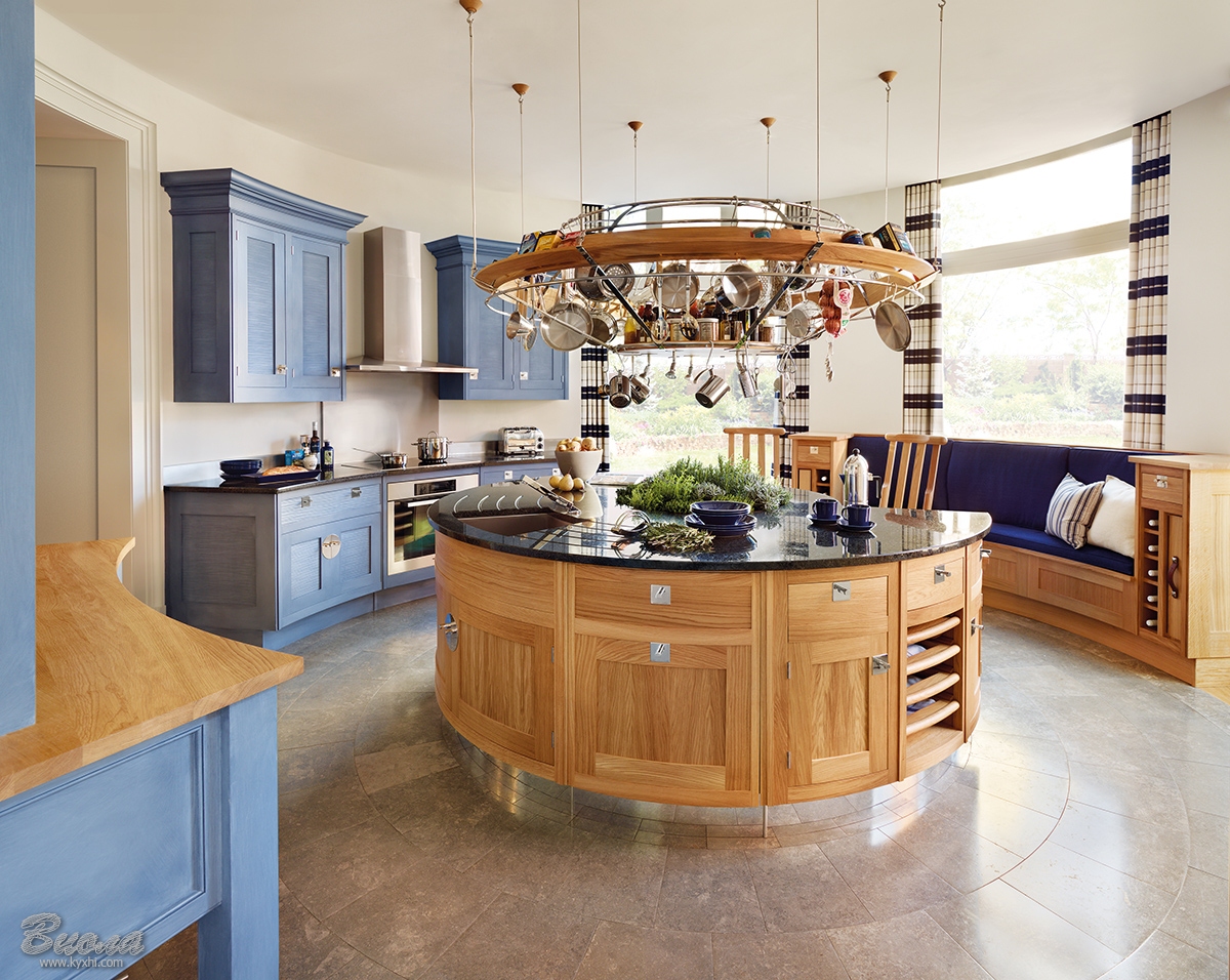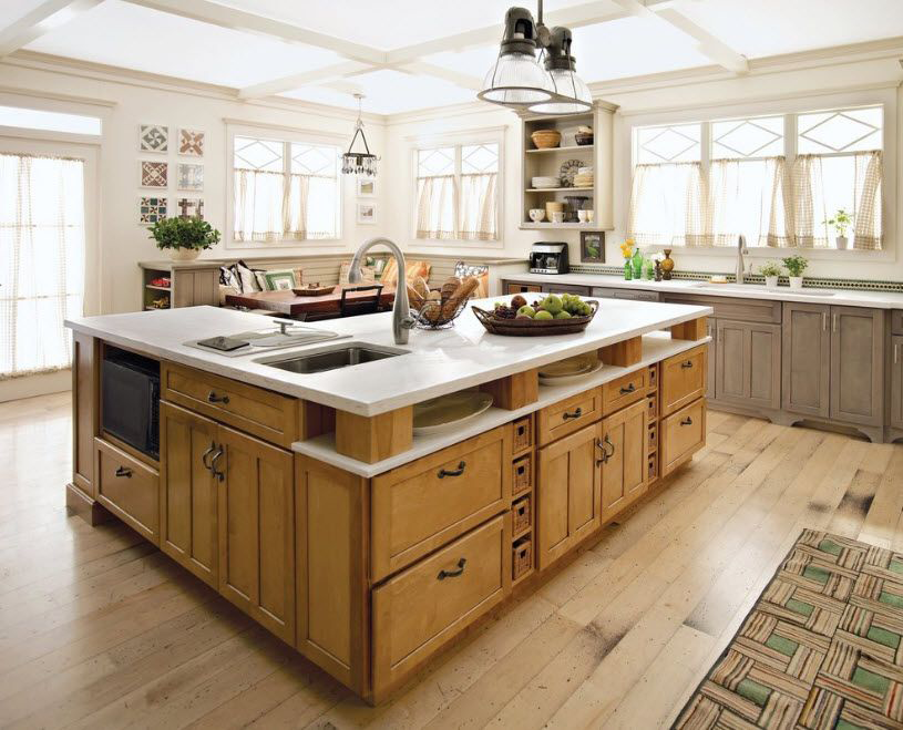 A cozinha parece um conjunto de cozinha e alta a mesa-uma ilha no meio da cozinha, cercada por cadeiras. Muitas vezes, esta não é uma simples mesa de jantar, mas vários pedestais conjuntos nos quais você pode embutir uma pia, máquina de lavar louça, batedeira, liquidificador e outras maravilhas técnicas que facilitam a culinária.