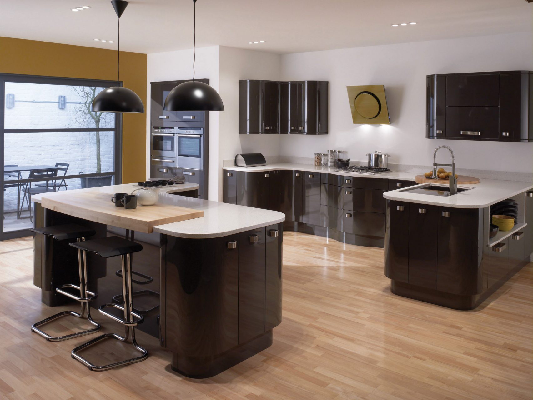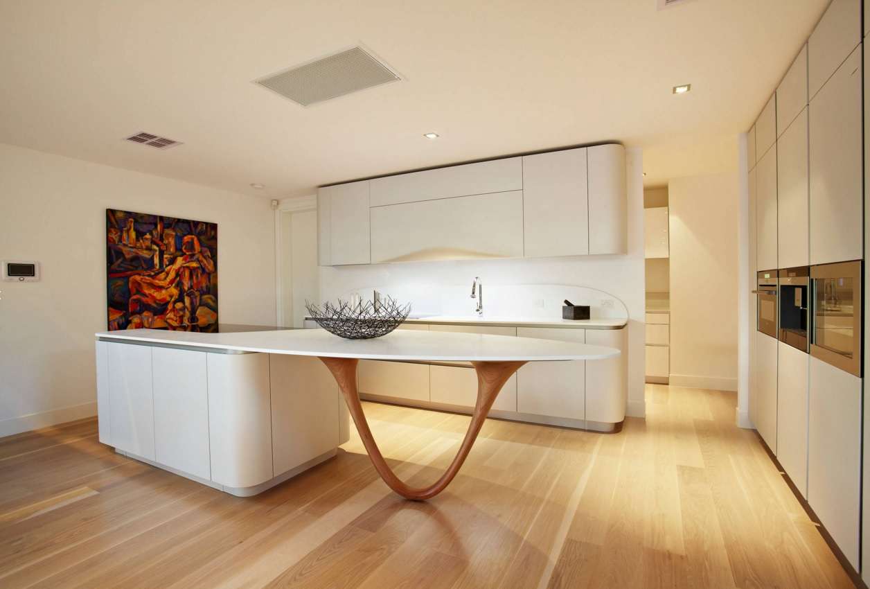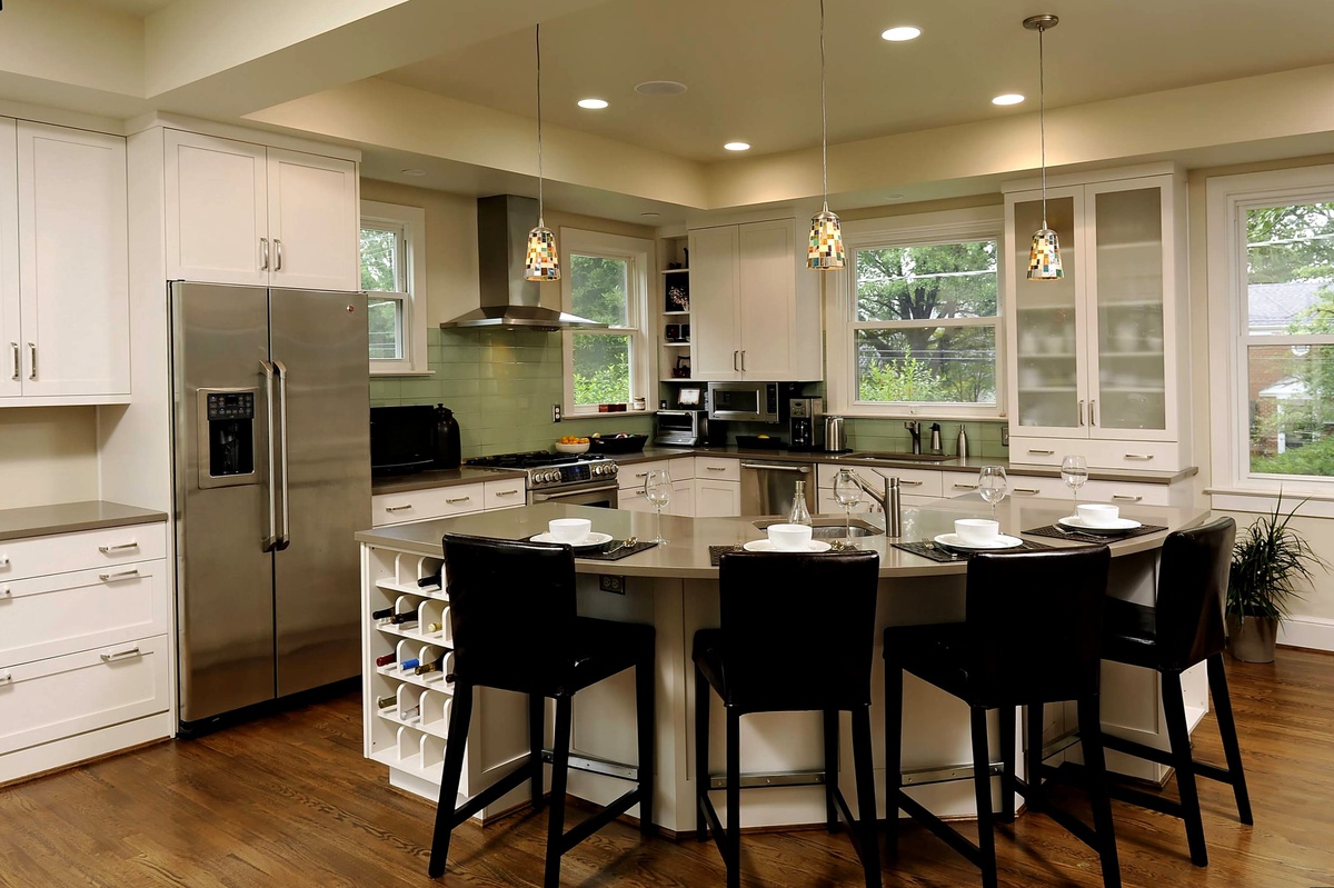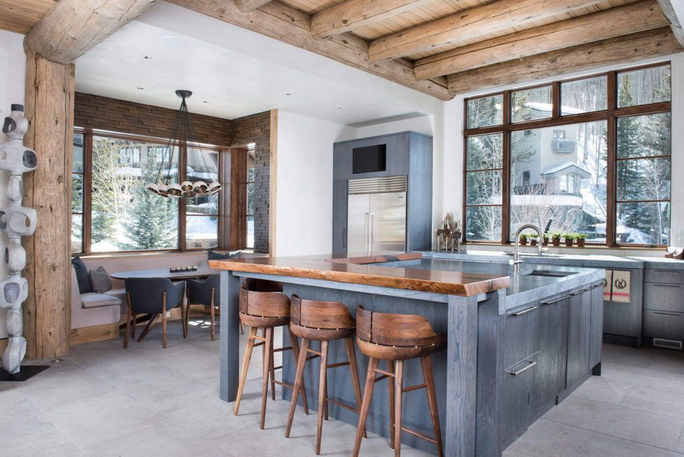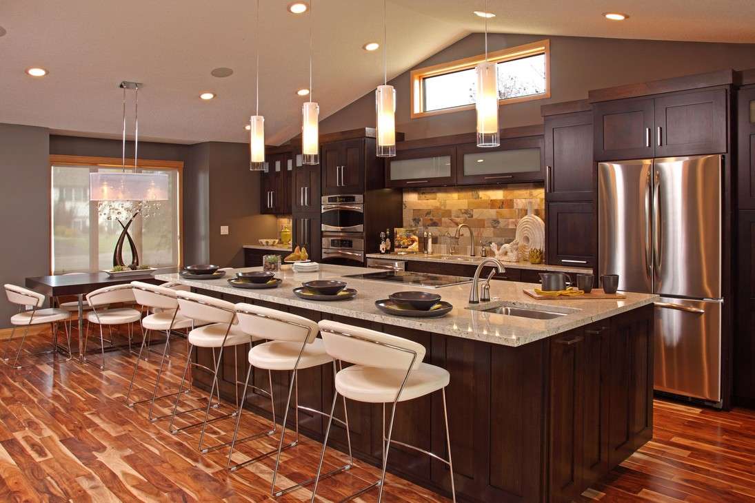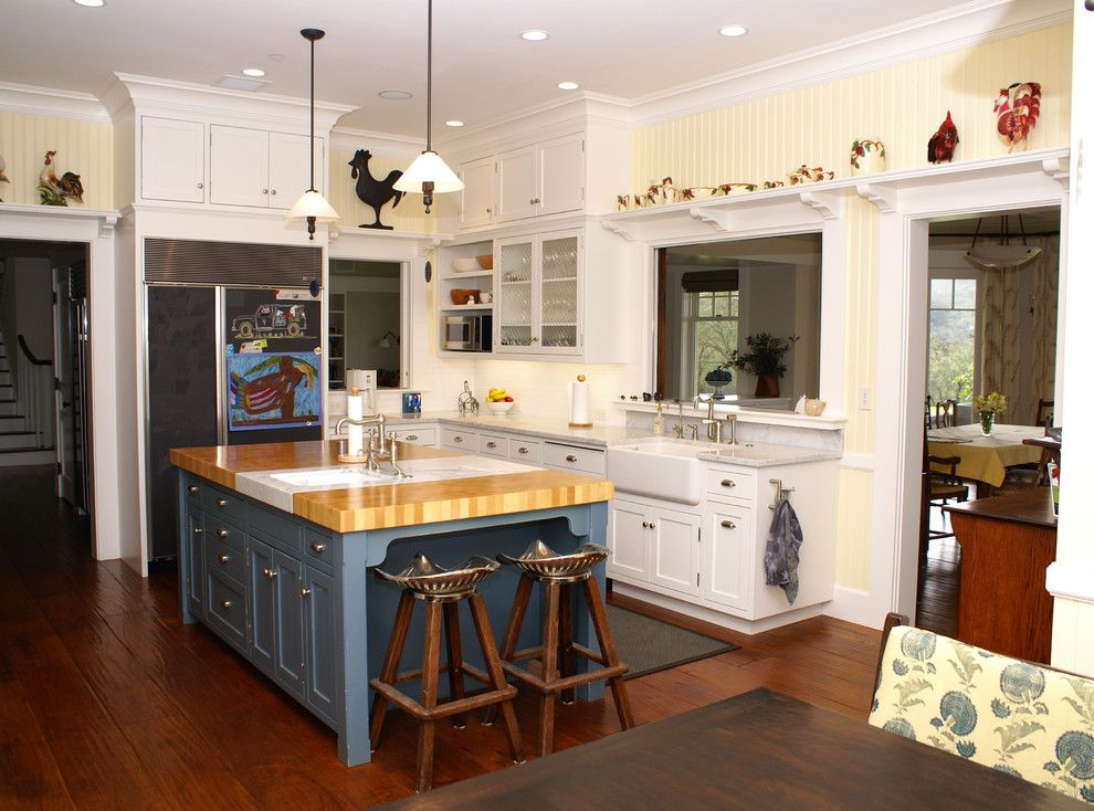 A cozinha parece um conjunto de cozinha e alta a mesa-uma ilha no meio da cozinha, cercada por cadeiras. Muitas vezes, esta não é uma simples mesa de jantar, mas vários pedestais conjuntos nos quais você pode embutir uma pia, máquina de lavar louça, batedeira, liquidificador e outras maravilhas técnicas que facilitam a culinária.