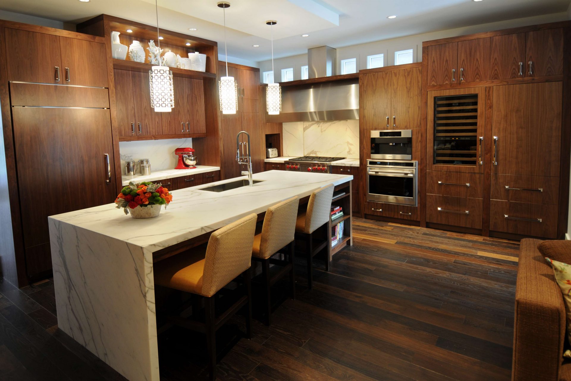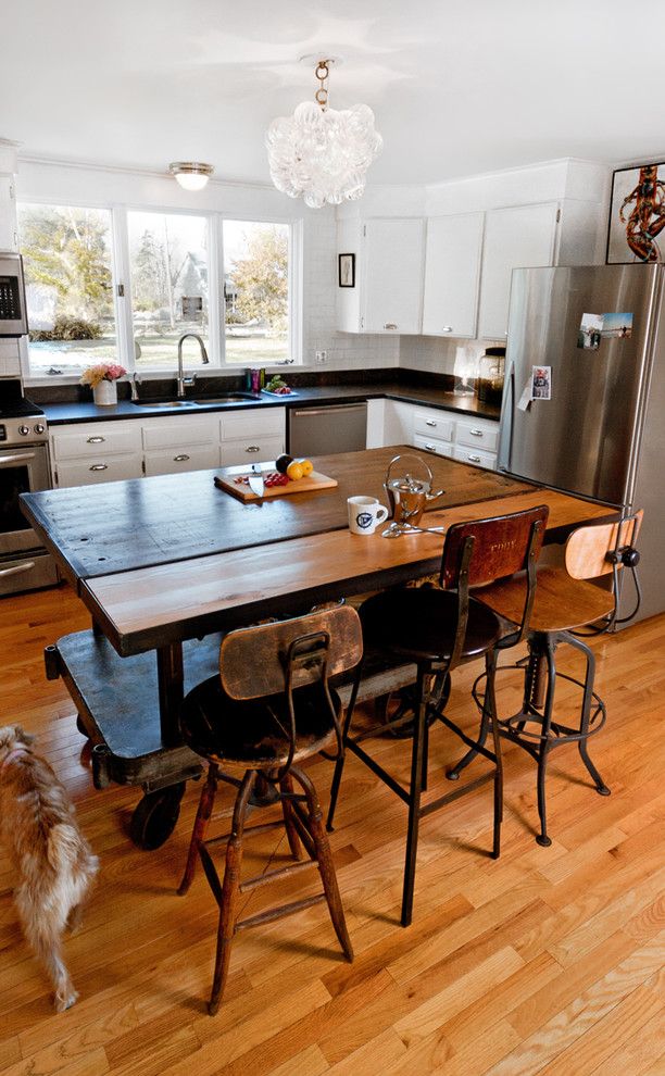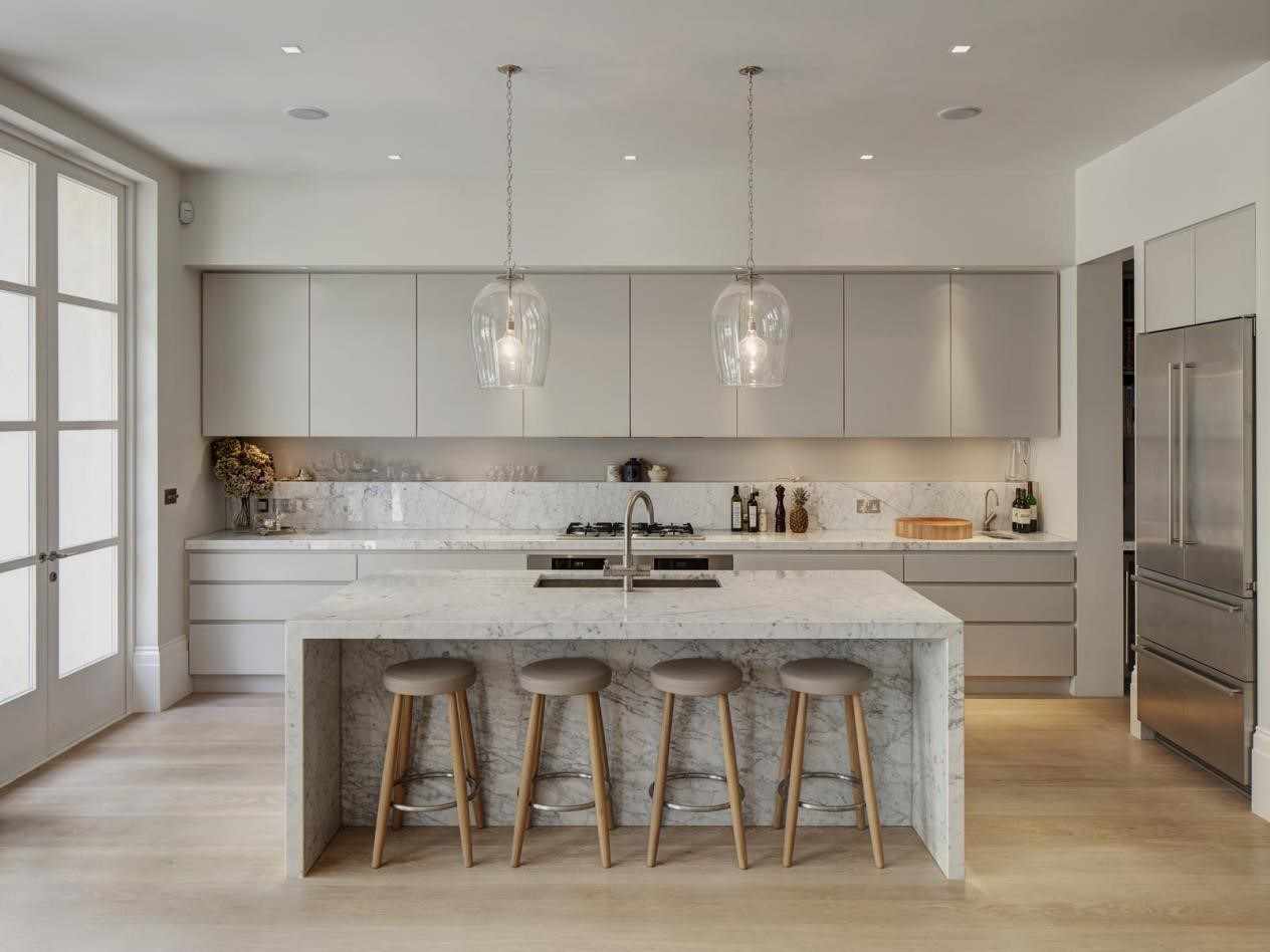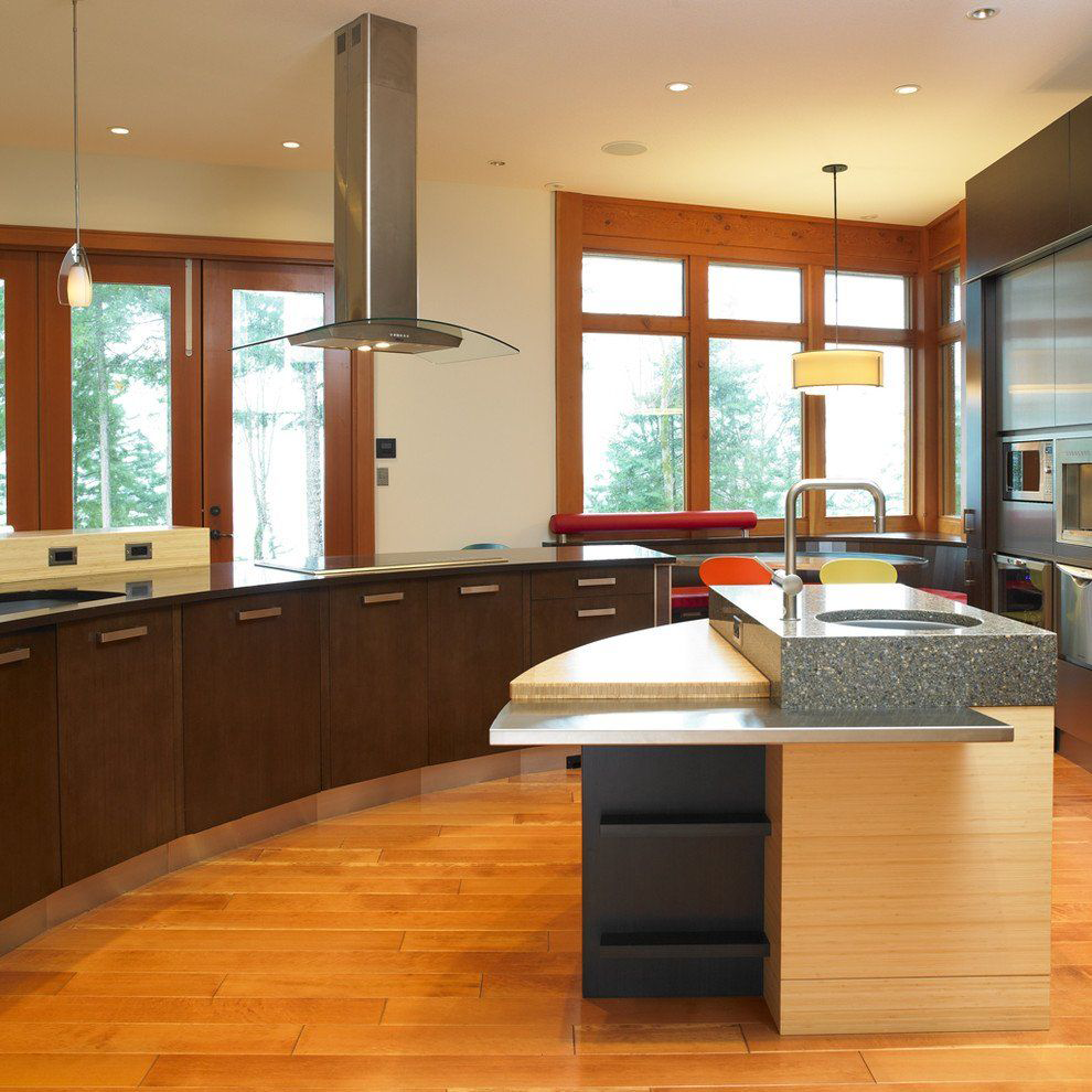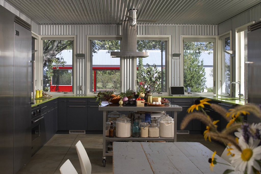 A cozinha parece um conjunto de cozinha e alta a mesa-uma ilha no meio da cozinha, cercada por cadeiras. Muitas vezes, esta não é uma simples mesa de jantar, mas vários pedestais conjuntos nos quais você pode embutir uma pia, máquina de lavar louça, batedeira, liquidificador e outras maravilhas técnicas que facilitam a culinária.