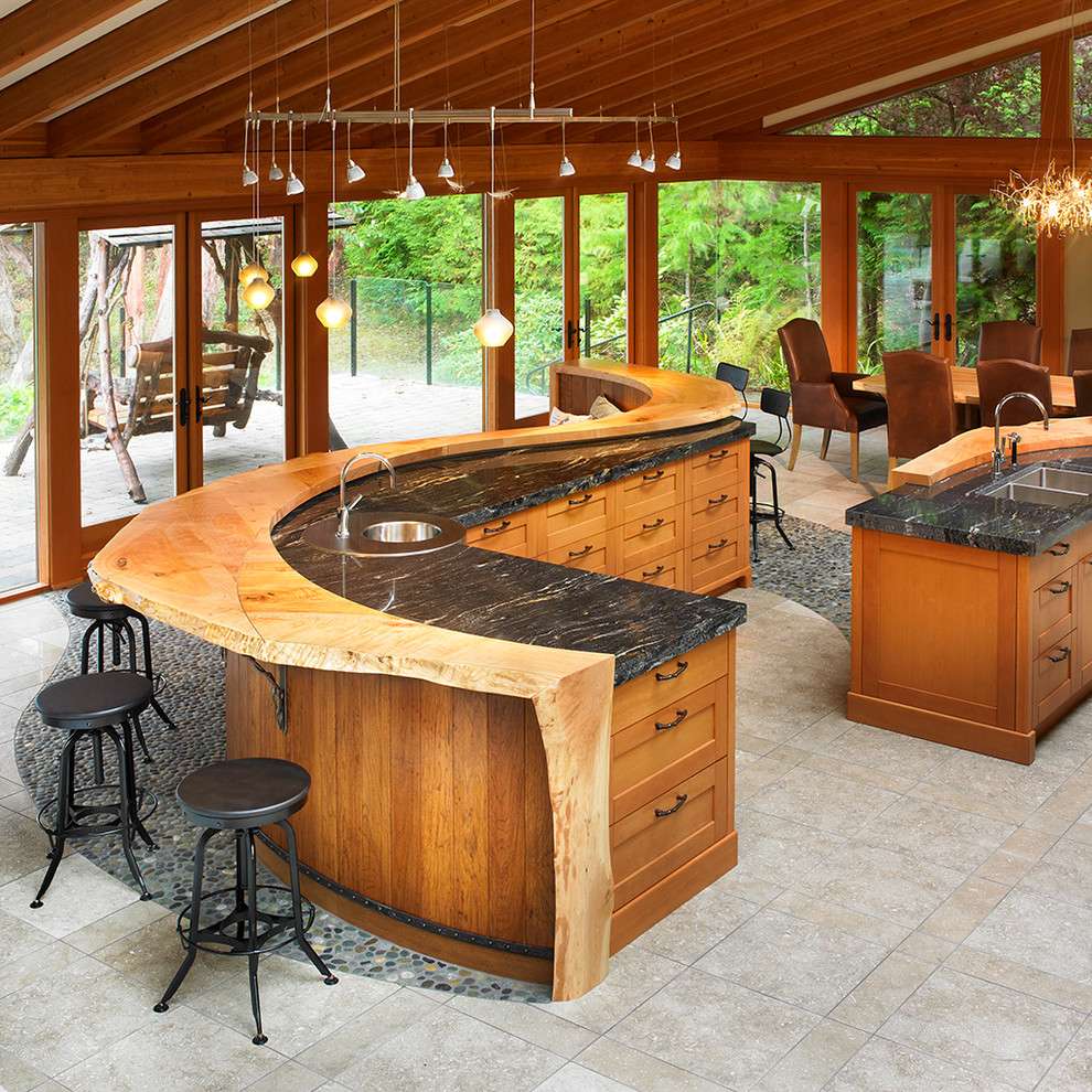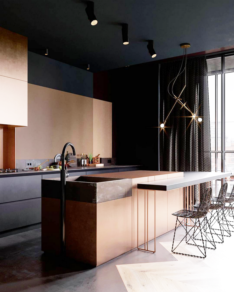 - Balcão de bar. Algo como uma ilha clássica, tão alta quanto já. Lembra de bares, bares do oeste selvagem, estilo loft. Parece moderno.