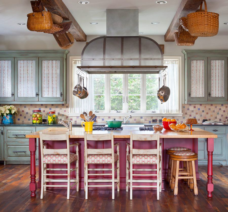 Na verdade, os clássicos franceses. O chão é da mesma telha, as paredes são brilhantes papel de parede em uma flor frívola, o teto é coberto com gesso. O mobiliário é de madeira, mas não solidamente grosseiro, como no estilo inglês, mas elegantemente artístico. As costas forjadas são bem-vindas, bem, se a mesa tiver uma mesa de vidro. Nas janelas das cortinas tuleque cobrem apenas metade da janela, na mesa é um vaso obrigatório com flores e a lâmpada em uma sombra de flor bonita. Não há muitos acessórios, principalmente pequenas coisas para cozinhar. O sentimento principal é uma manhã alegre de verão.