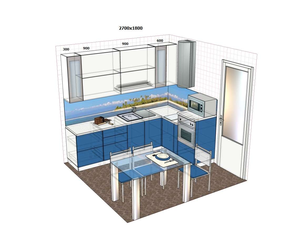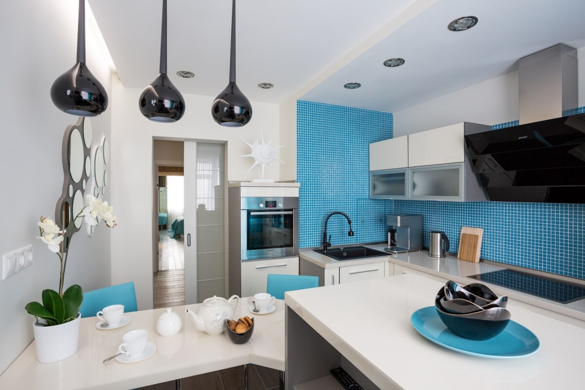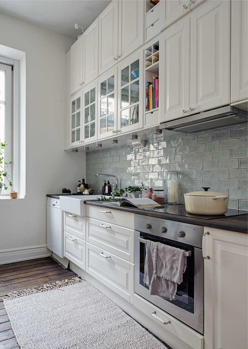 - Azulejo. Ele é colocado na cozinha com mais frequência, porque é fácil de limpar por qualquer meio químico agressivo, não tem medo de gotas quentes e salpicos de gordura, não sofre com quedas de temperatura e alta umidade, não se desgasta muito com o tempo.Pode sofrer exclusivamente de efeitos mecânicos, mas se nada pesado for descartado, pode servir por décadas. Recomenda-se escolher uma telha que não escorregue, caso contrário, a pessoa que se prepara tem a chance de escorregar com pressa e se machucar..