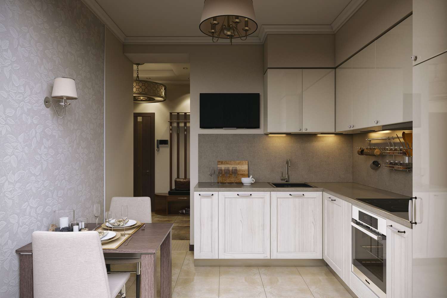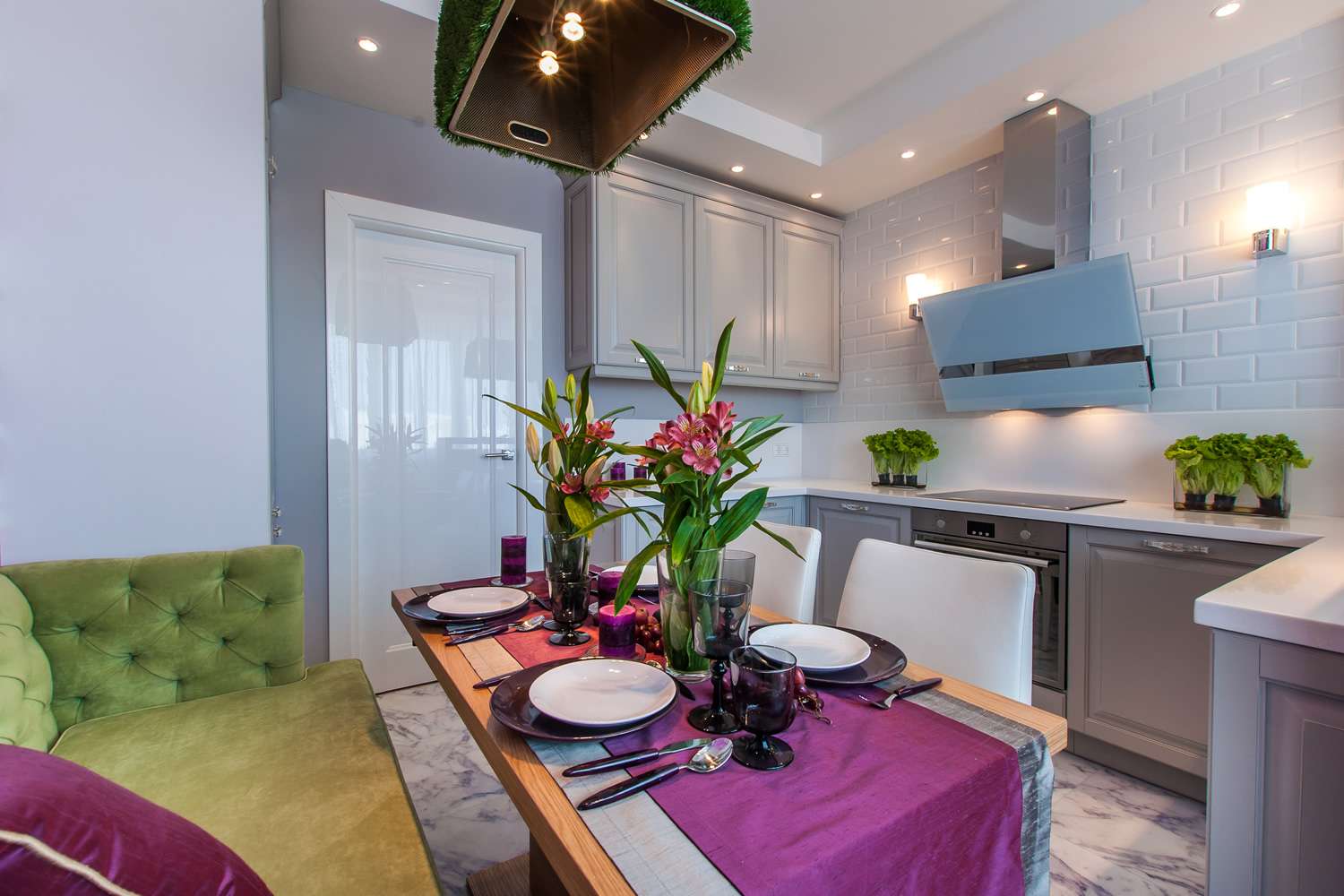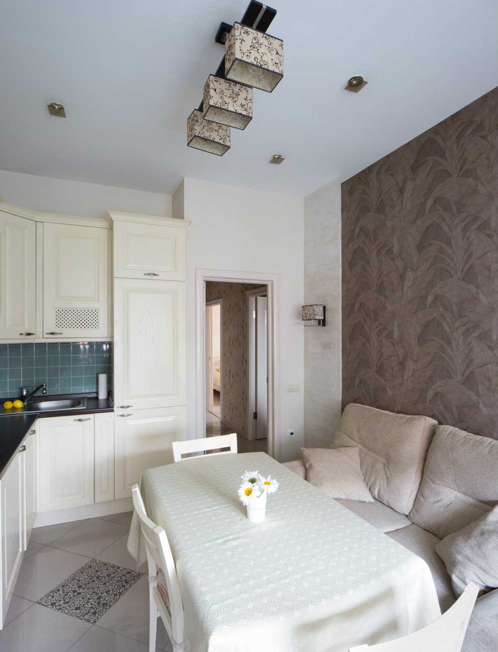 - Azulejo. Ele é colocado na cozinha com mais frequência, porque é fácil de limpar por qualquer meio químico agressivo, não tem medo de gotas quentes e salpicos de gordura, não sofre com quedas de temperatura e alta umidade, não se desgasta muito com o tempo.Pode sofrer exclusivamente de efeitos mecânicos, mas se nada pesado for descartado, pode servir por décadas. Recomenda-se escolher uma telha que não escorregue, caso contrário, a pessoa que se prepara tem a chance de escorregar com pressa e se machucar..