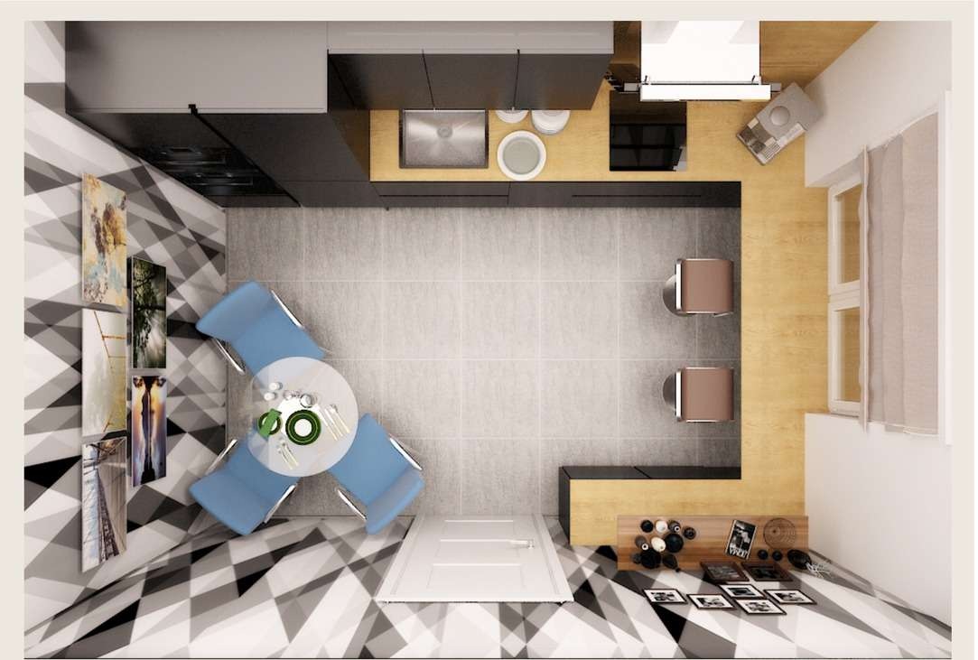 É interessante que o arranjo da letra “P” possa ser abordado de maneira original: encurte um dos bastões “P” e termine com uma pequena mesa. Parece engraçado, você pode tomar café da manhã na mesa, mas pode ser muito alto - afinal, a área de trabalho é tradicionalmente localizada ligeiramente acima da mesa de jantar.