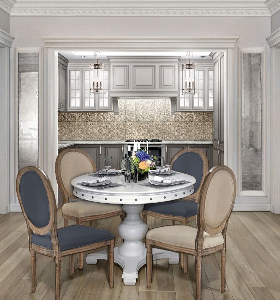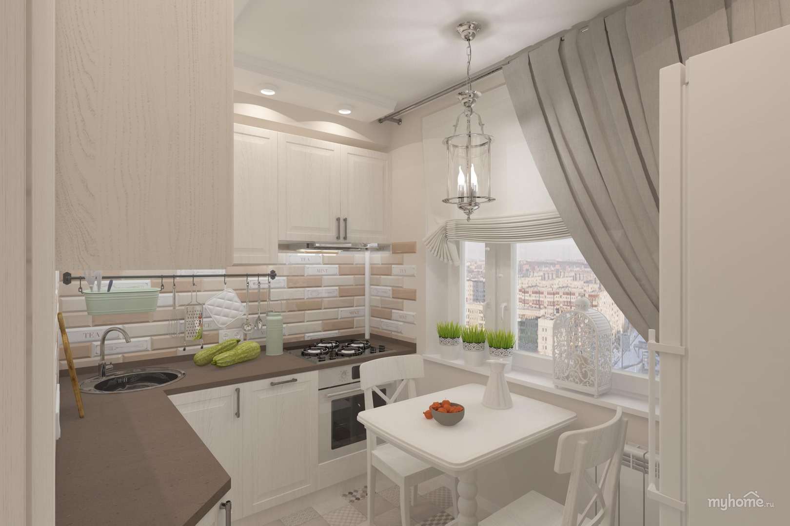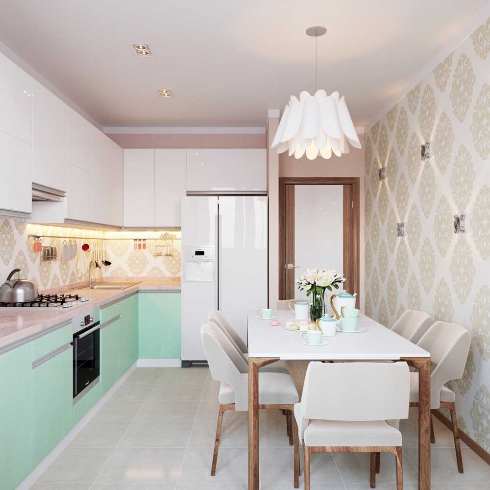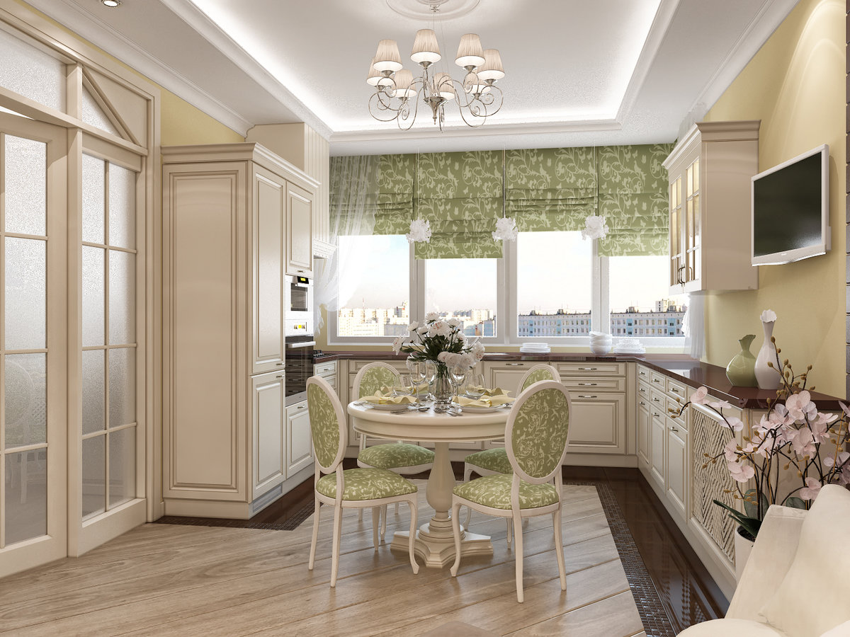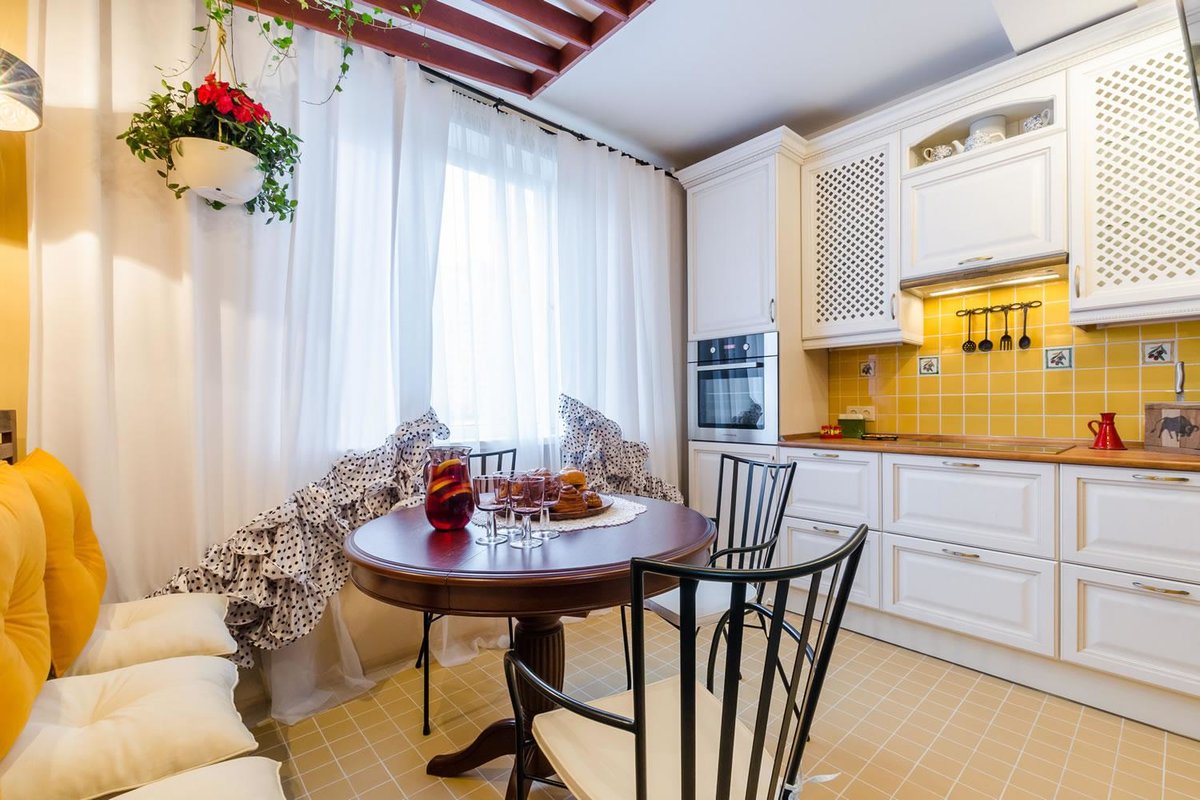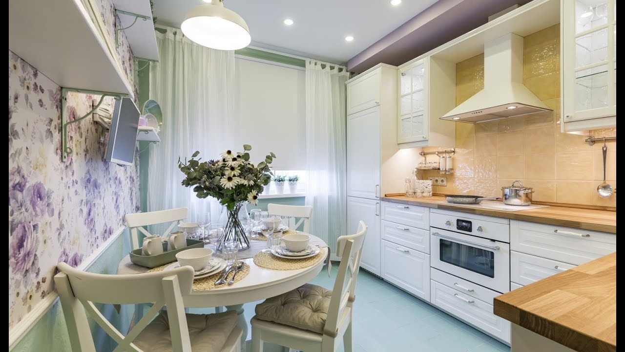 Originalmente da França, esse estilo aposta na leveza e na leveza. Imagine que fora da janela que você tem - uma visão da Torre Eiffel, é primavera lá fora e está tudo bem. Aproximadamente o mesmo sentimento deve causar o estilo da cozinha provença. Suas cores são branco, bege, tons de azul claro e outros tons claros. Materiais - papel de parede em uma pequena flor, telha no chão, teto branqueado ou pintado. As janelas têm tecidos leves de tule ou chintz, a mobília é de pernas finas. Você pode colocar as cadeiras com encostos de metal estampados, uma pequena cadeira aconchegante. Na mesa deve ser um vaso de flores.Pequenas fotos ou desenhos decoram as paredes e pratos elegantes - uma área de trabalho.