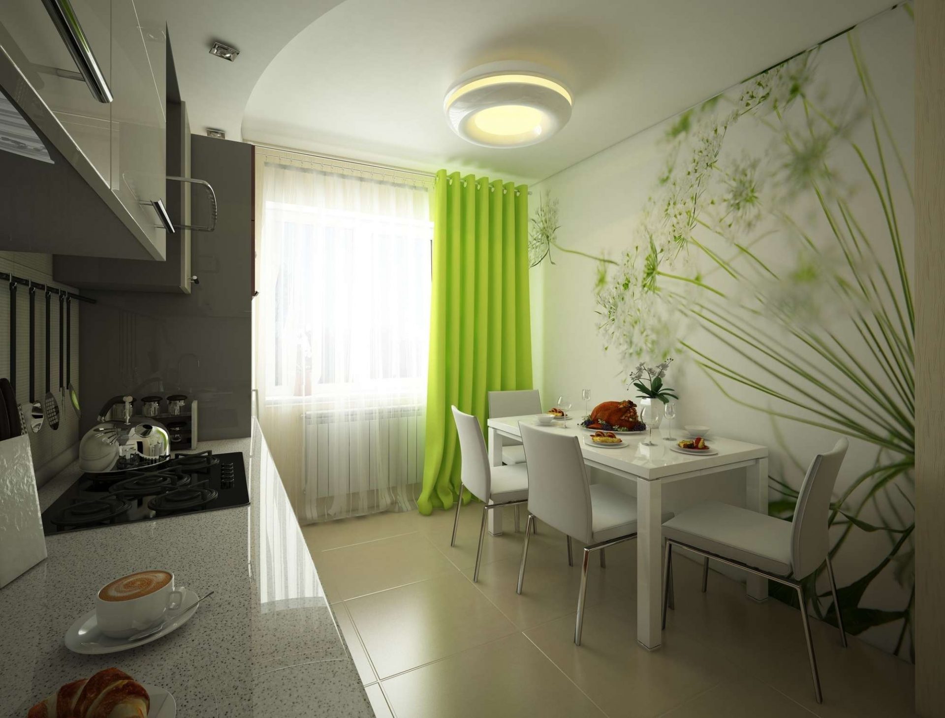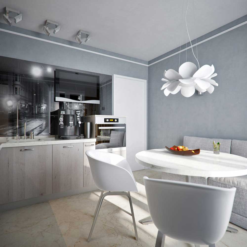 E mais uma vez, o minimalismo, mas no design das mais novas tecnologias que causam associações com a espaçonave. Cores - prata, branco preto. Quase sem acentos brilhantes. Concluir - telha, metal acima da área de trabalho, pintar no teto, pintar nas paredes. Móveis de formas estranhas, plástico, metal. Vai ficar boa mesa com vidro ou metal bancada e cadeiras semicirculares. Nas janelas, necessariamente, enrolavam as cortinas. Como acessório, aparelhos particularmente fáceis de bater na cozinha. Processador de alimentos, cafeteira, microondas, lava-louças - tudo isso pode parecer que o futuro já chegou. Os fios salientes são apropriados.