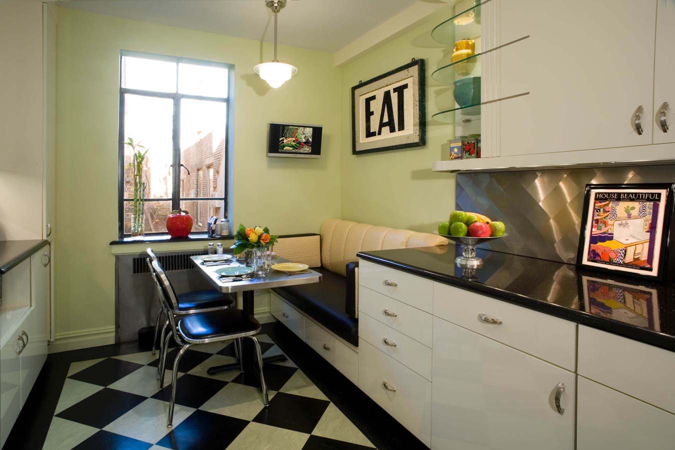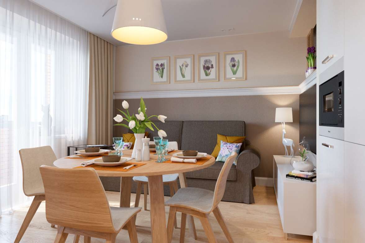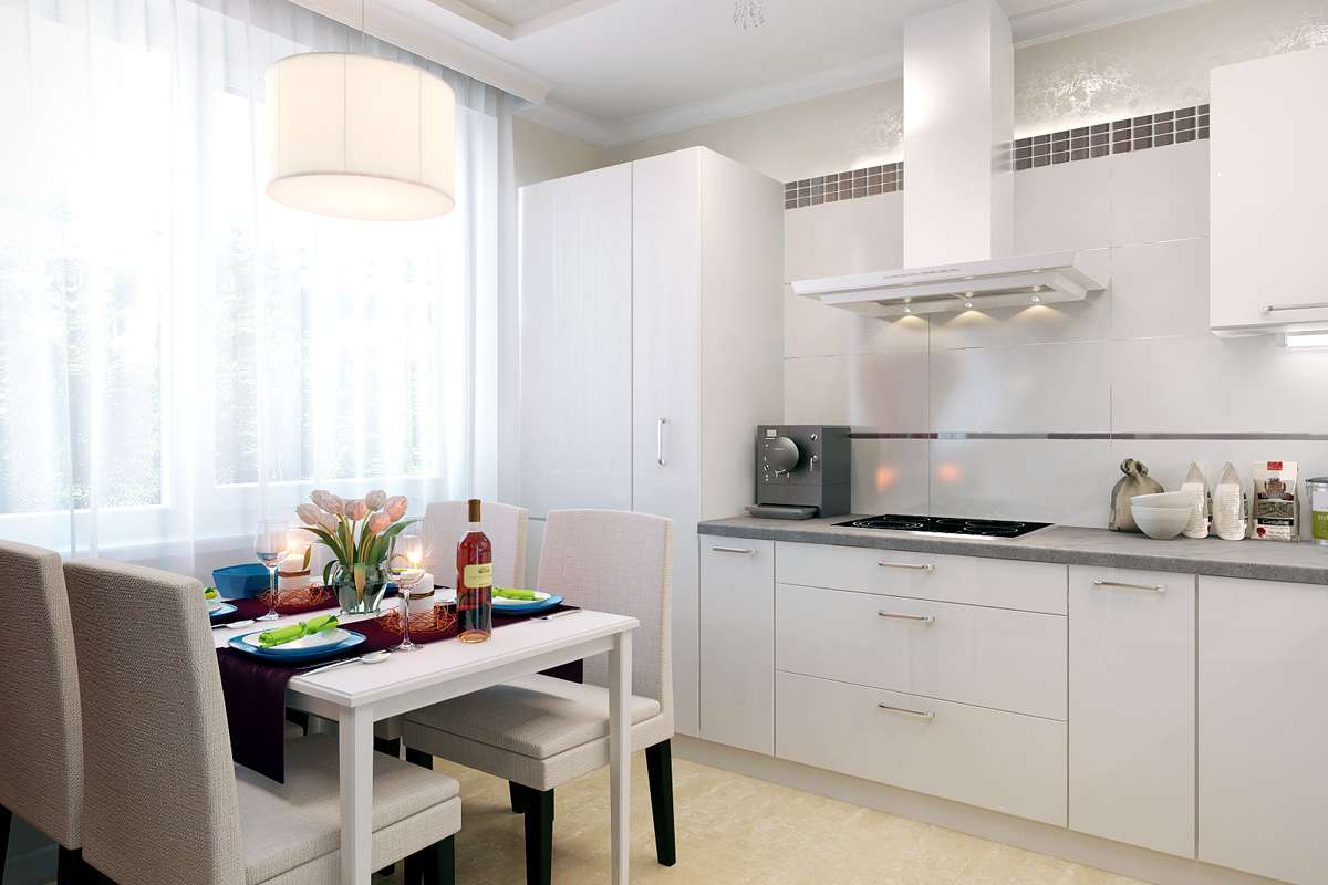 Em qualquer cozinha - a não ser, claro, que você tenha uma casa não muito grande com um sala de estar - Há duas áreas principais, trabalhando e jantando. O trabalho é um conjunto de cozinha, na mesa de jantar e cadeiras.