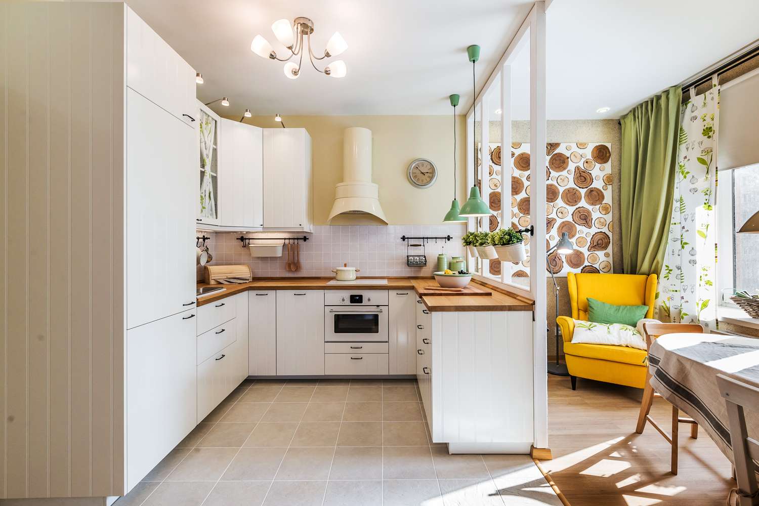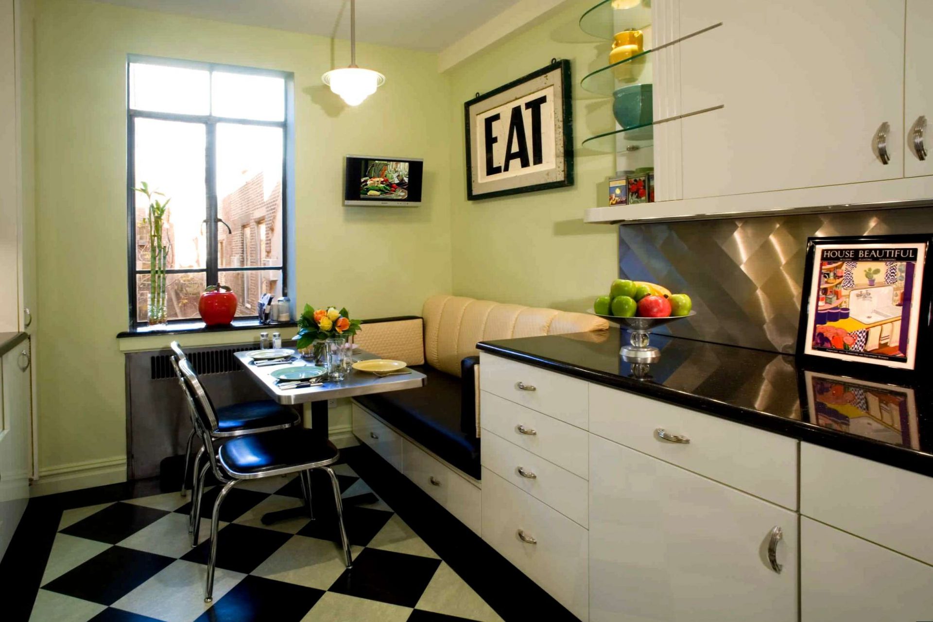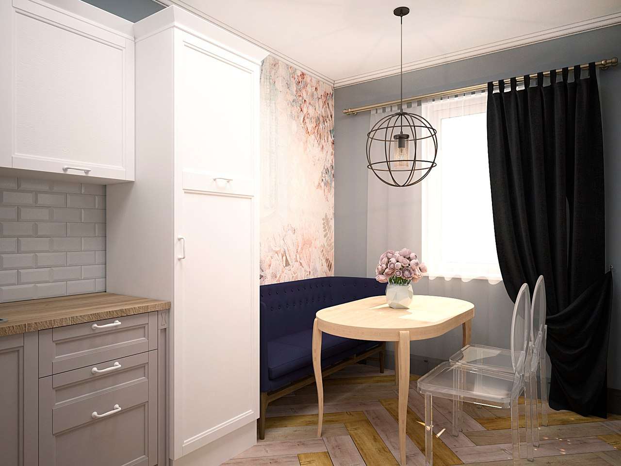 Em qualquer cozinha - a não ser, claro, que você tenha uma casa não muito grande com um sala de estar - Há duas áreas principais, trabalhando e jantando. O trabalho é um conjunto de cozinha, na mesa de jantar e cadeiras.