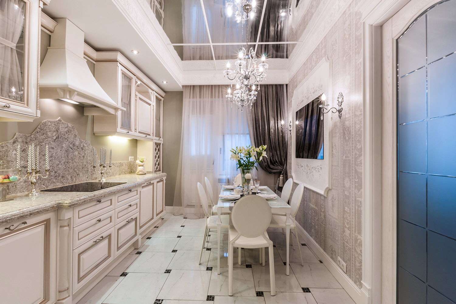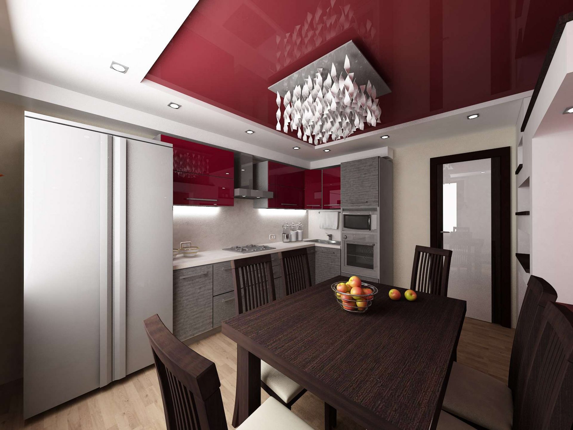 - Teto de estiramento. Ele é usado somente quando há um capuz acima do fogão e com cuidado, pois tem medo de altas temperaturas, efeitos mecânicos. Mas parece lindo, parece muito bom, se você combiná-lo com drywall. Menos - viola a ventilação normal da sala.