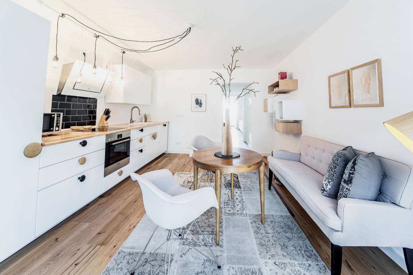 Parece minimalismo, mas é mais liberdade. Cores - branco, cinza begeazul suave. Na decoração de madeira clara ou madeira de plástico, sob tecto vigas no teto gesso. A mobília é simples, não muito volumosa, mas não muito leve, também de madeira clara. Têxteis minimalistas - cortinas que são fáceis de afastar e que deixam entrar um monte de assentos bordados em cadeiras. Dos pratos de acessórios, pintados no tema marinho, pequenos a foto sem moldura na parede (também em azul). Escandinavo O estilo adora o espaço, a simplicidade, tudo deve ser confiável e sólido.