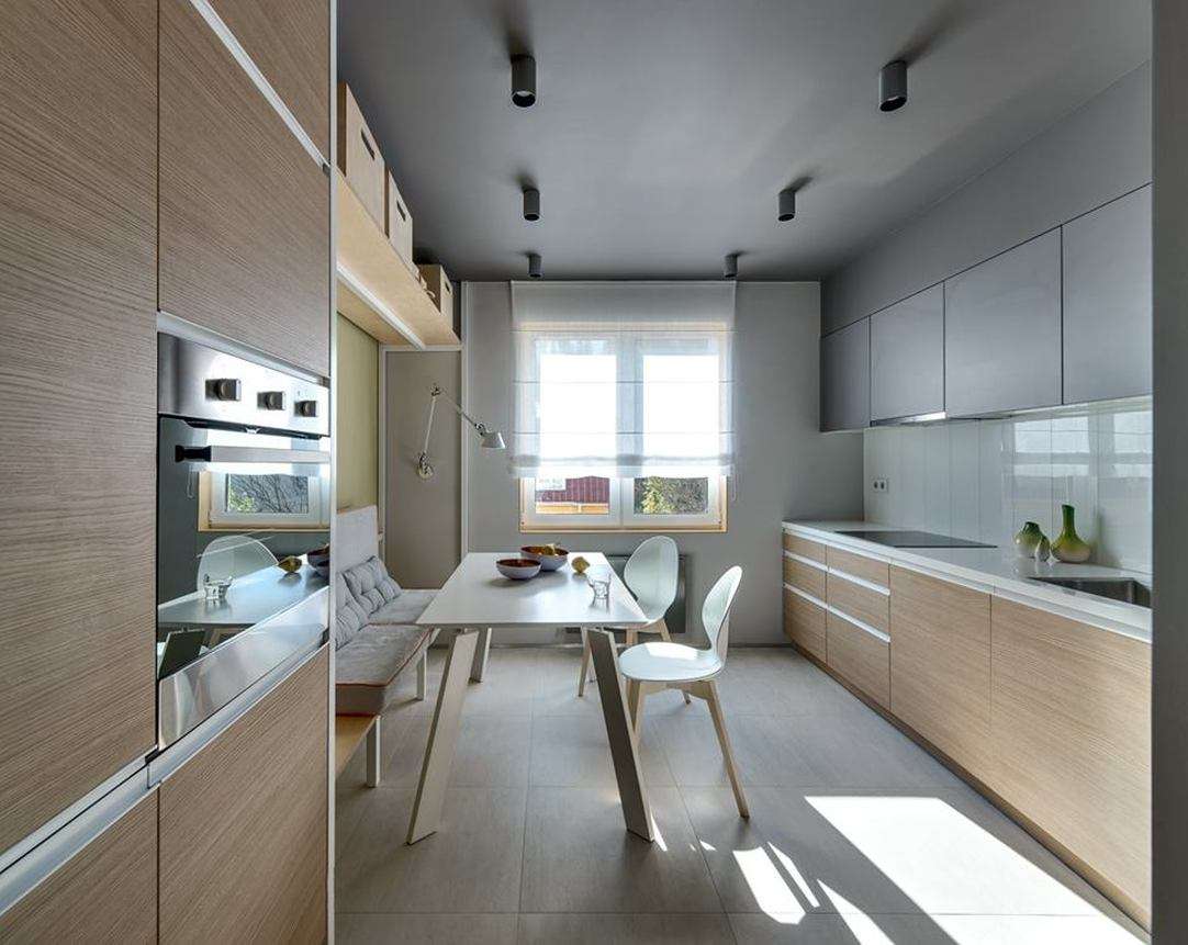 - Em duas linhas. Também um clássico - o fone de ouvido é construído ao longo de ambas as paredes, e uma mesa e cadeiras são colocadas perto da janela. Se você deixar mais espaço, e entre as linhas não for menor que um metro, será muito mais fácil mover-se entre os pontos-chave da cozinha do que na decisão anterior.