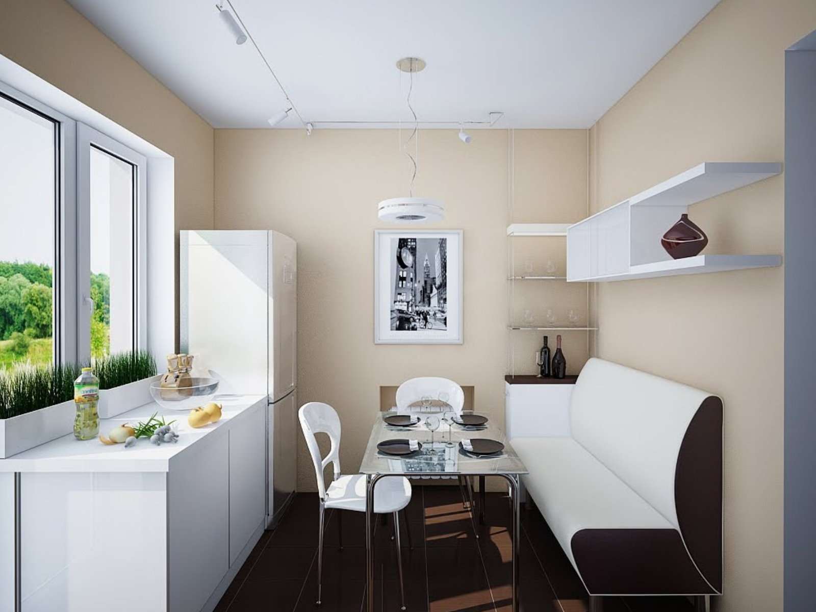 Branco, cinzento, manchas raras de preto, falta de contraste e cores brilhantes. Light a árvorepintar telhaPlástico no acabamento. Móveis as formas mais simples, do mesmo plástico, madeira ou metal, e apenas o necessário - um par de postes de cozinha, a mesacadeiras Minimalismo adora incorporado armáriosutensílios escondidos, aparelhos, adora iluminação, rolo cortinas. Não são necessários acessórios - flor ou vaso com vaso máximo flores.