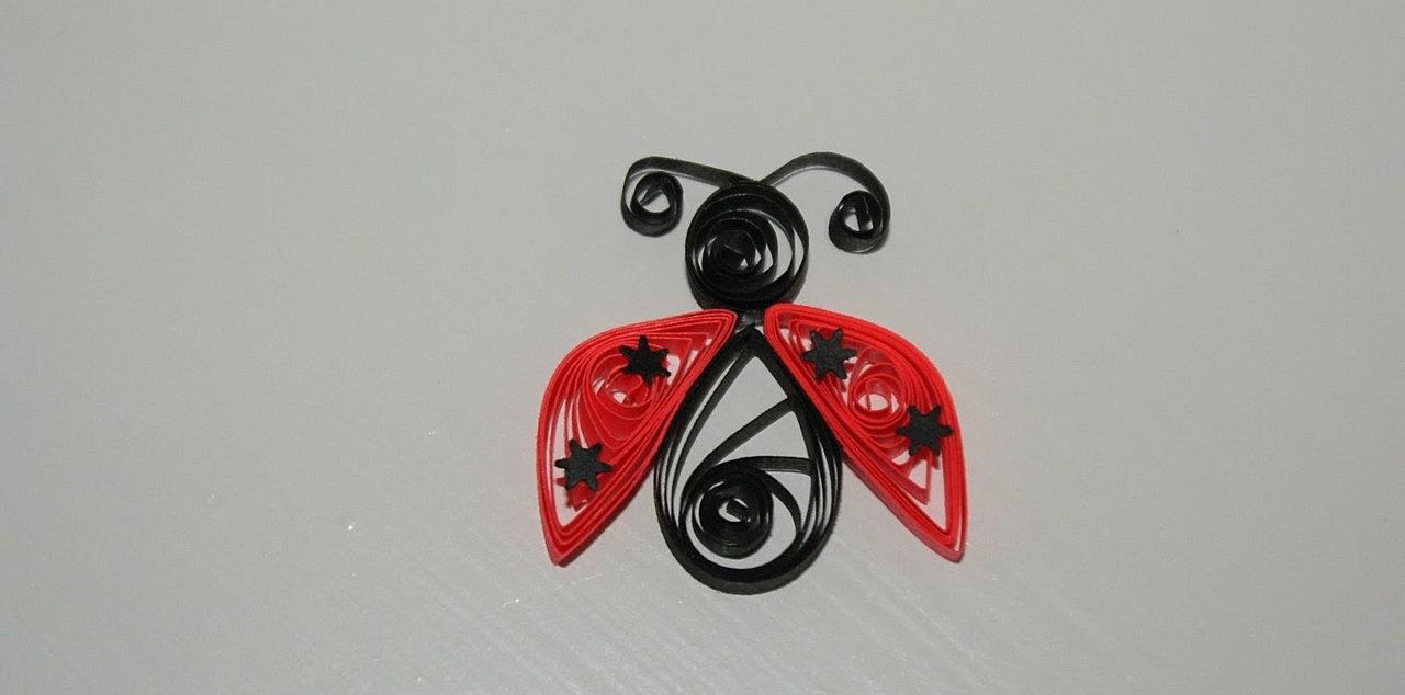 - Quando o oval do corpo da joaninha estiver pronto, você pode prosseguir para a “torção do papel”. Das "espirais livres" haverá pontos pretos no corpo de uma joaninha. Então eu colo esses formulários criados no papelão.