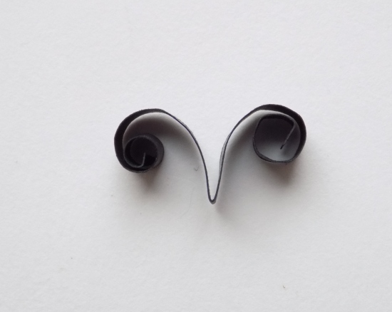 Para ele, pegue uma longa tira de papel e se parta ao meio. O lado direito é enrolado em uma direção, a esquerda - na direção oposta. Tal elemento pode ser anexado a um divertido cartão de felicitações.
