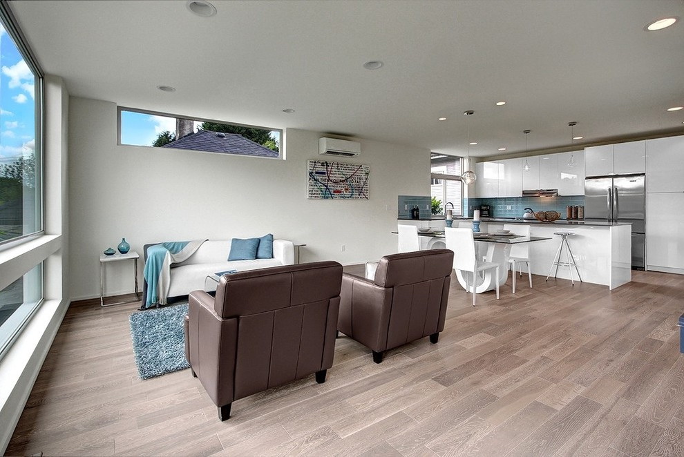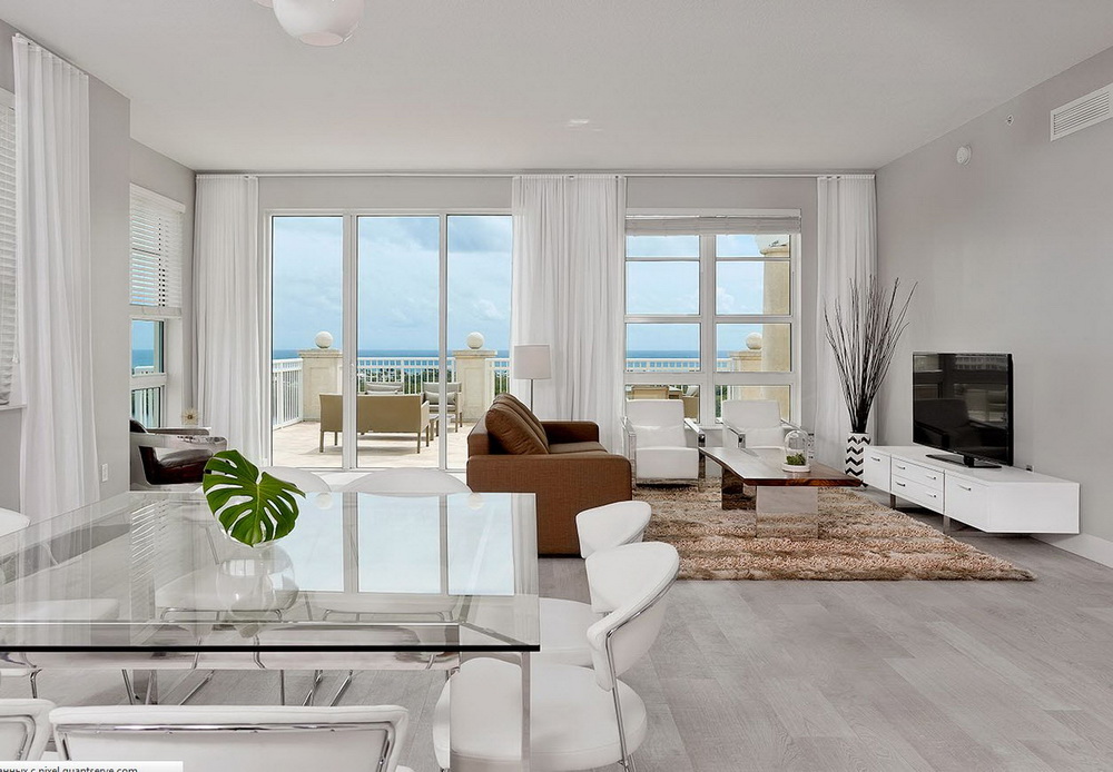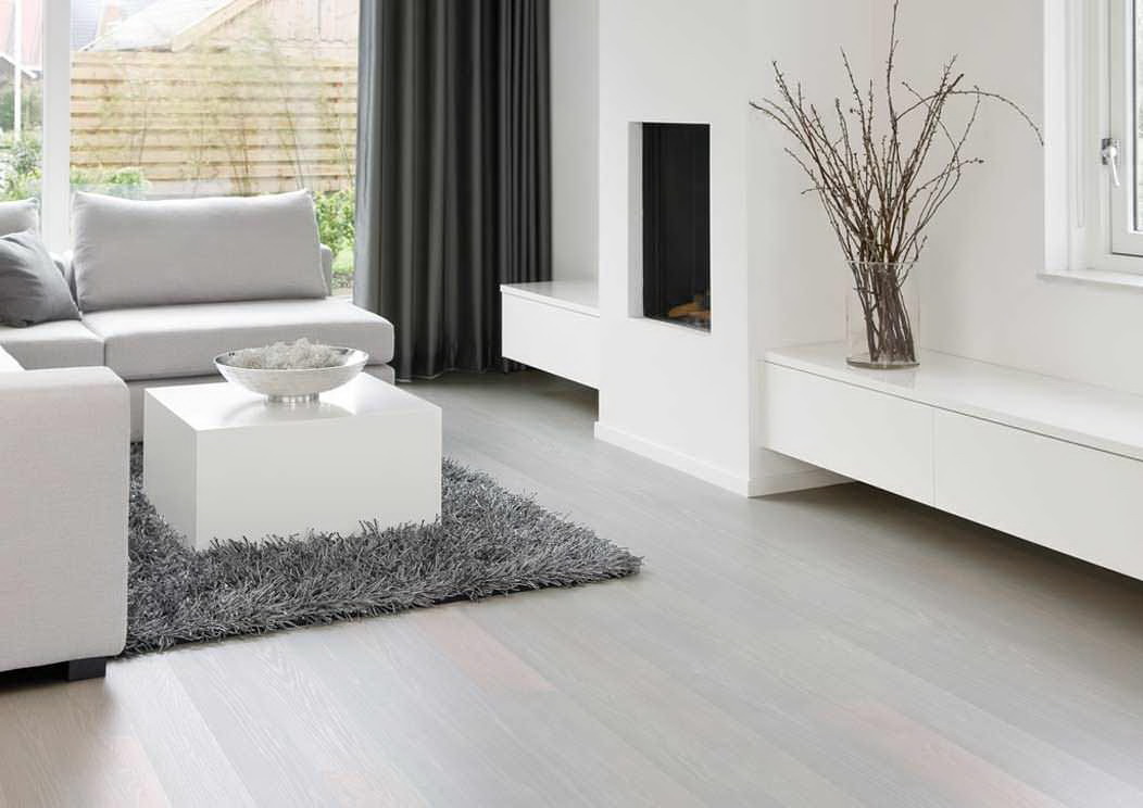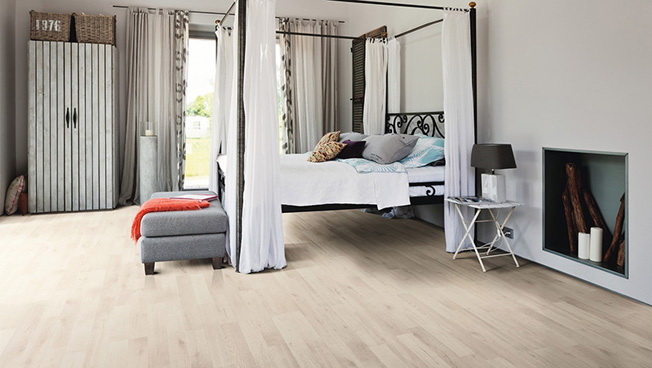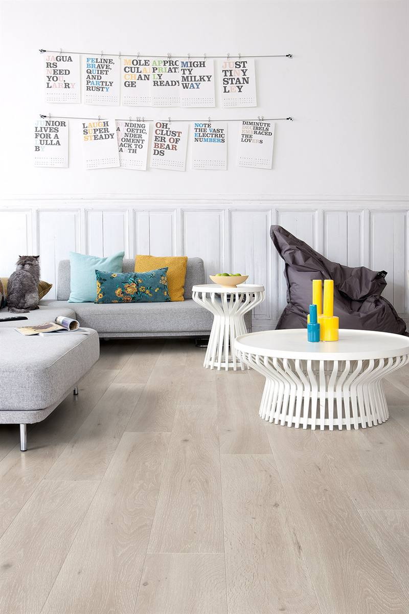 Os pisos com um acabamento brilhante criam um incrível e interessante jogo de reflexos. Uma pequena sala escura com um piso branco se tornará maior. Se você usar piso laminado branco, será fácil para você escolher cores para decoração de casa.