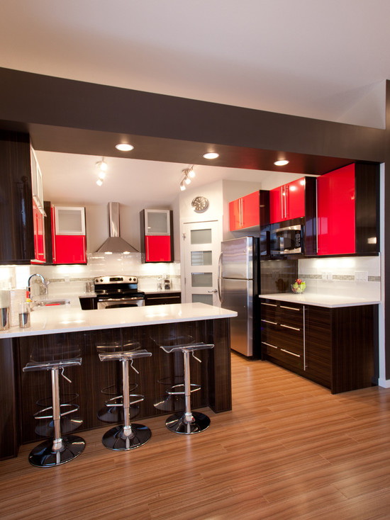 Tons de vermelho e laranja são em grande parte combinados com um piso escuro ou marrom. As cores vermelhas brilhantes são agressivas. Laranja fortalece o clima ensolarado. A combinação de ouro, bronze com um chão marrom escuro é considerado um clássico.