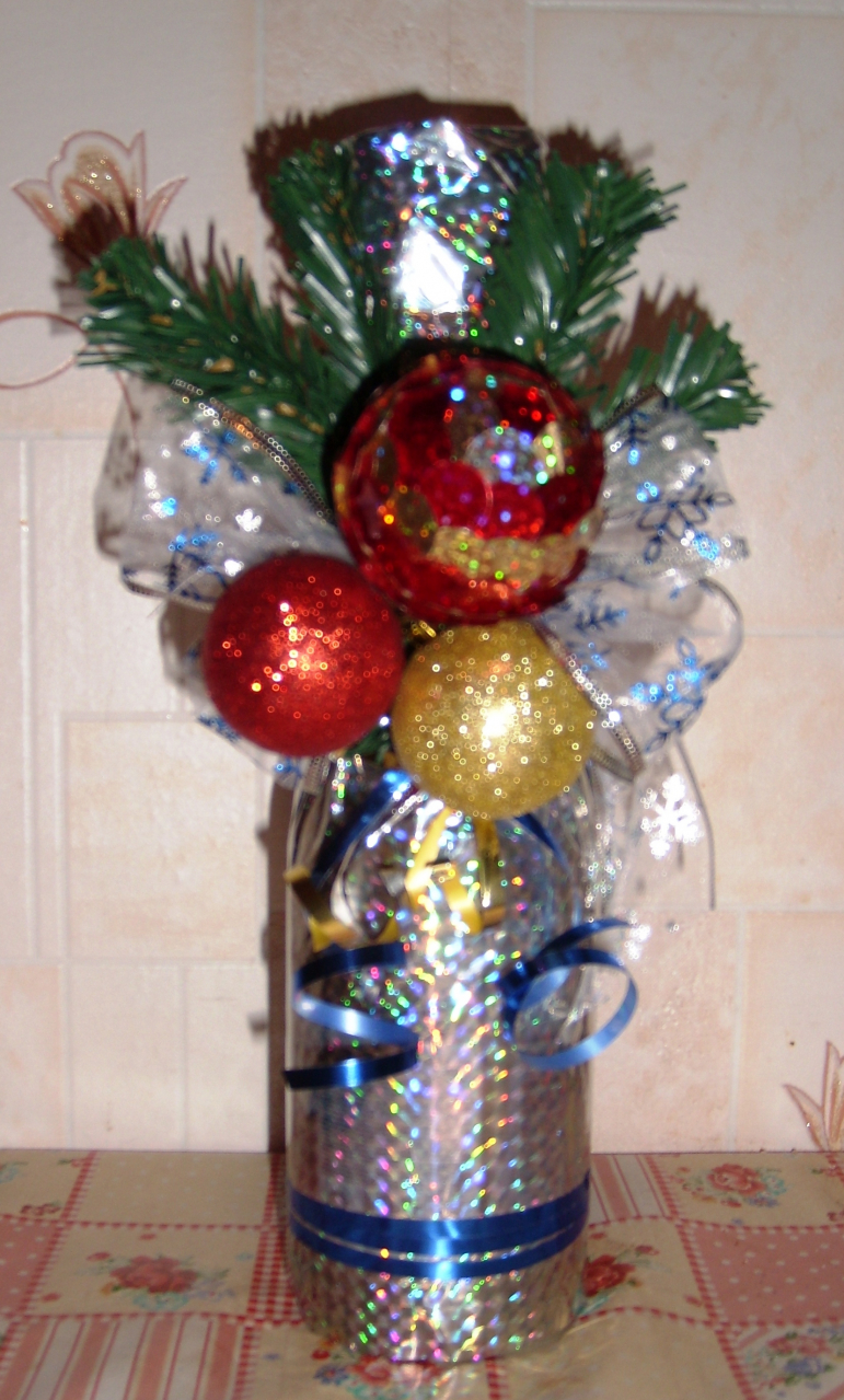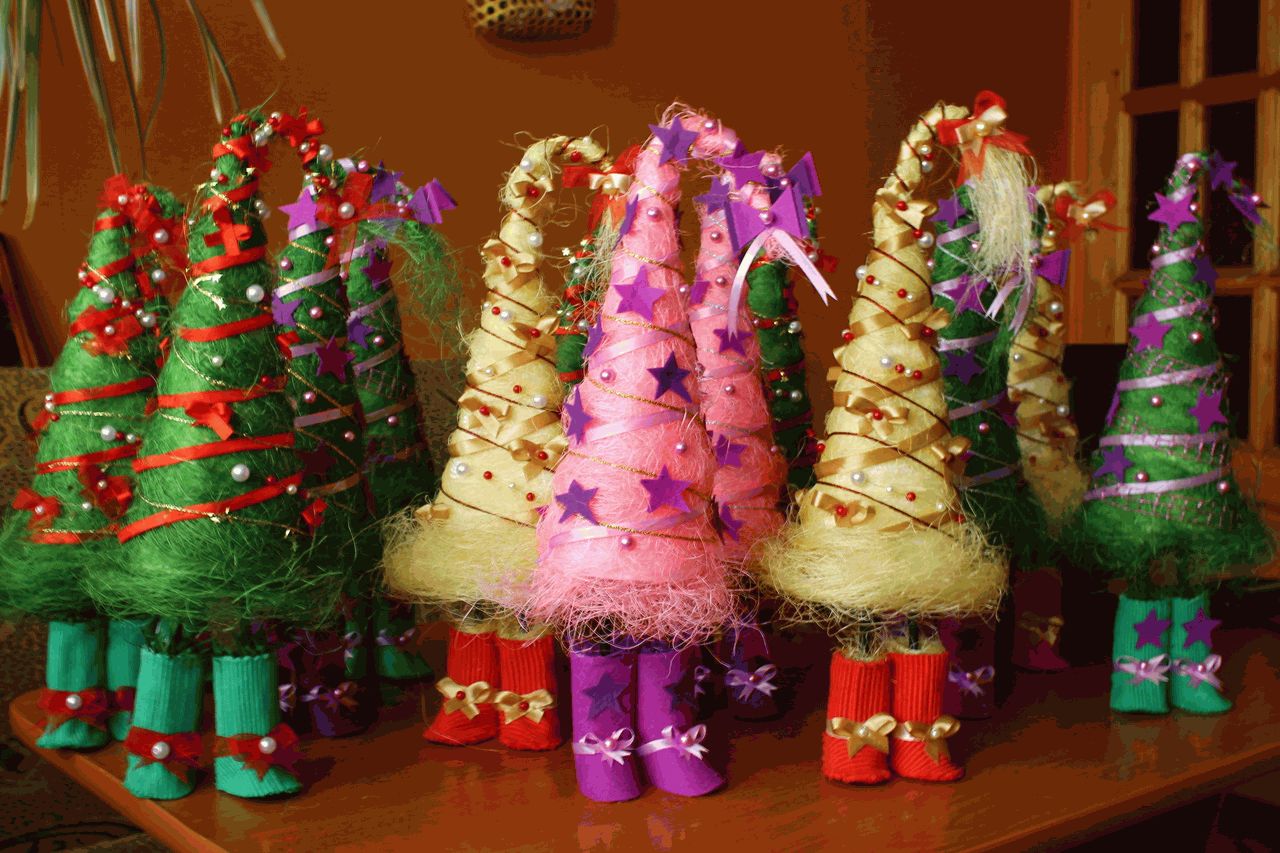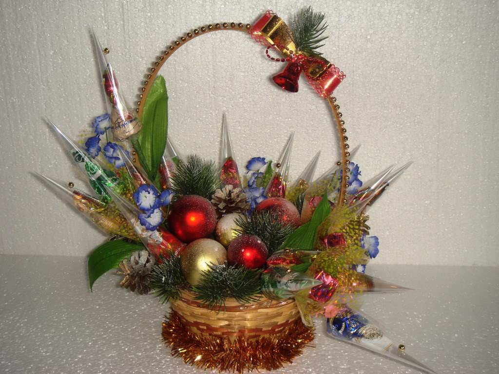 Você pode fazer doces em forma de cone em forma de cone de papelão colorido, enchê-los de papai noel de chocolate ou bonecos de neve de tamanho pequeno, amarrá-los com fitas coloridas brilhantes, colar adesivos de Ano Novo ou migalhas coloridas de vidro quebrado.