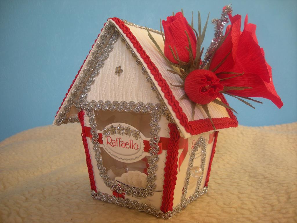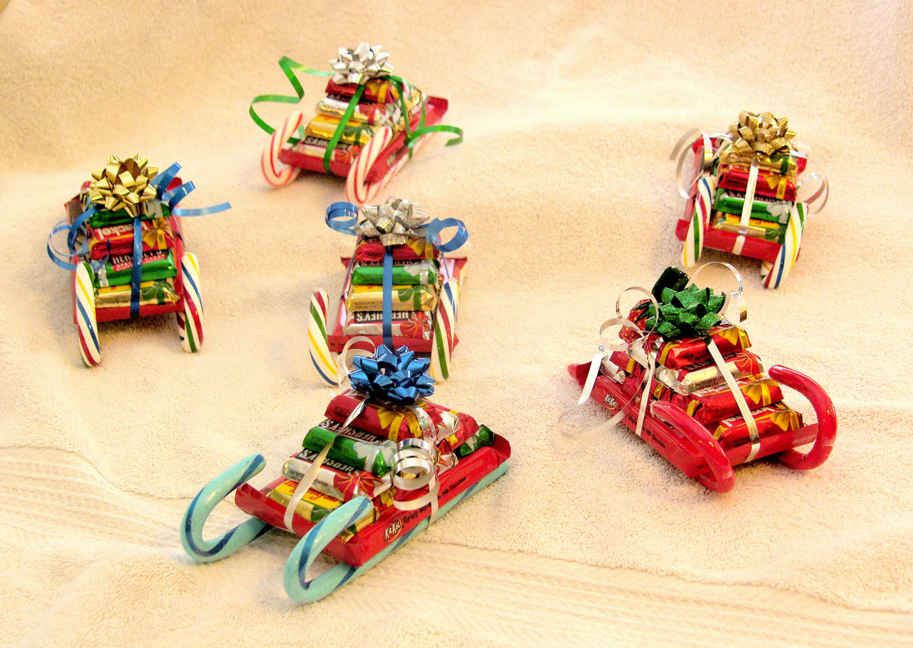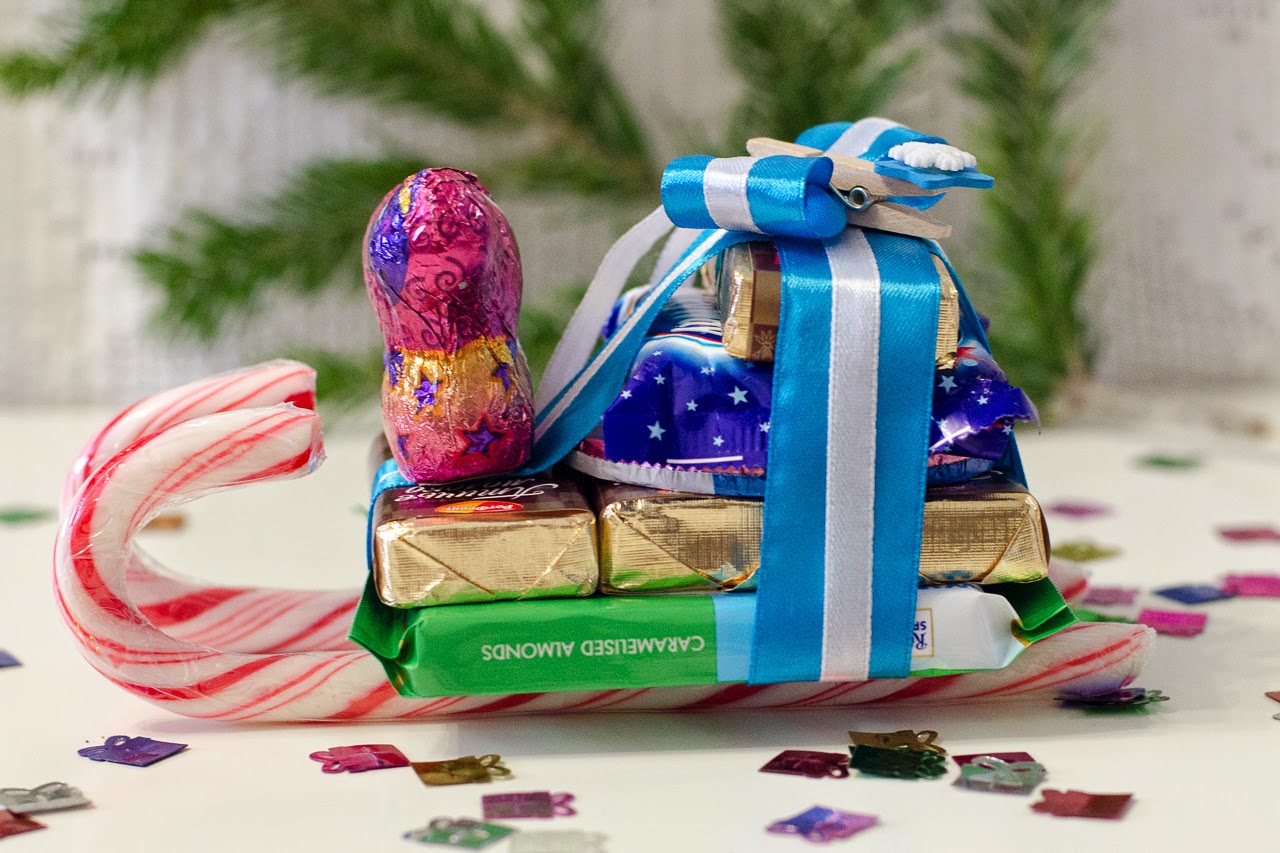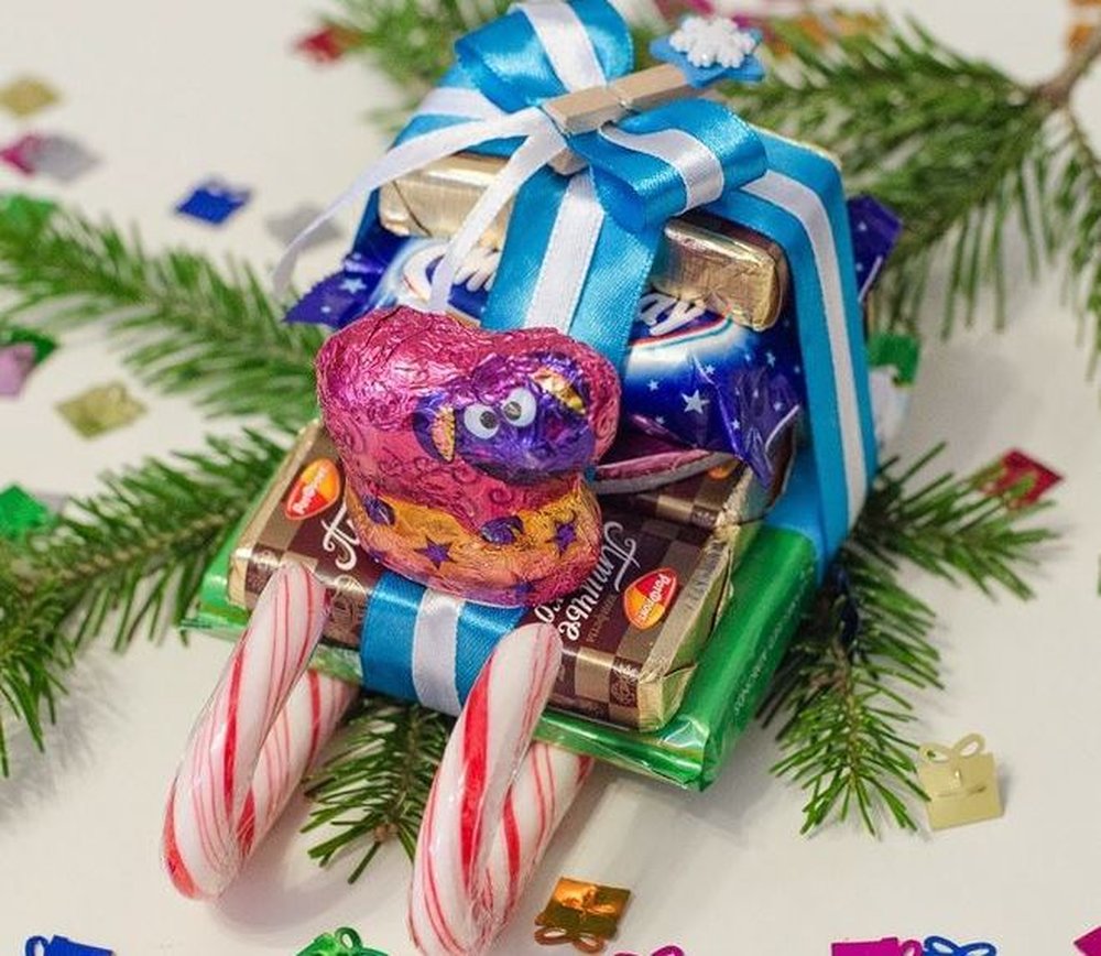 Desta forma, você pode fazer uma caneca de lembrança com um padrão de ano novo, cheio de todos os tipos de doces ou fazer um pequeno trenó de chocolate de lembrança cheio de doces.