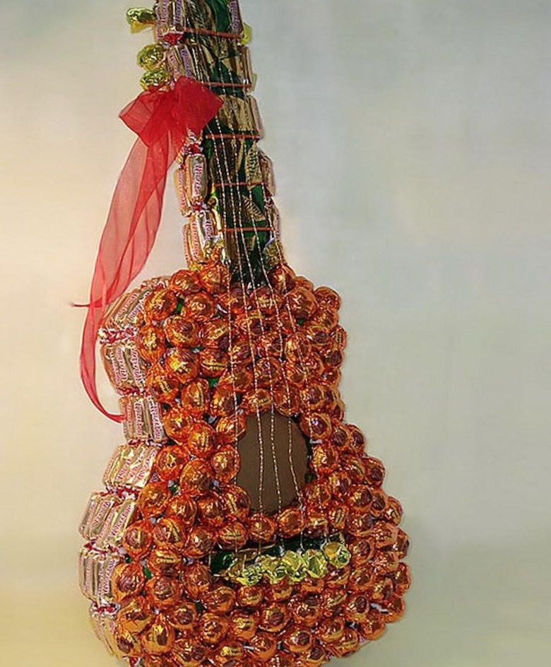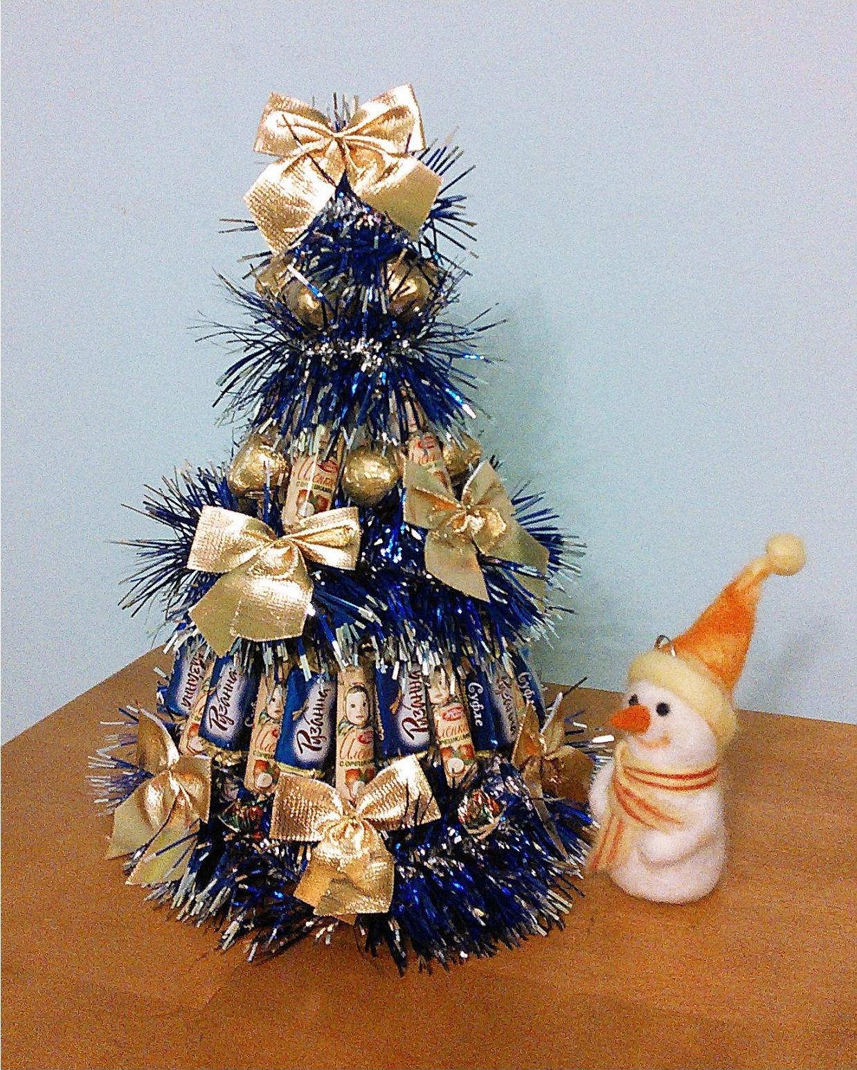 Se cozinhar doces não é o seu elemento, você pode fazer deliciosas lembranças de confeitos feitos na fábrica. Abeto feito de bombons de chocolate em um invólucro verde vai parecer impressionante. Você pode decorar uma árvore doce com enfeites reais e pequenos doces coloridos.
