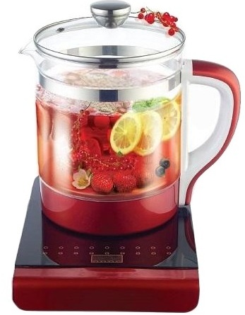 Uma chaleira eléctrica grande inclui um bule de chá de 1,2 l para café e chá. Um modelo muito original, distinto dos outros pela presença de uma base grande, na qual dois bules são colocados de uma só vez.
