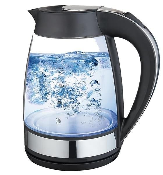 Chaleira elétrica poderosa e durável. Impressiona os usuários com seu design original combinado com luz de fundo azul.