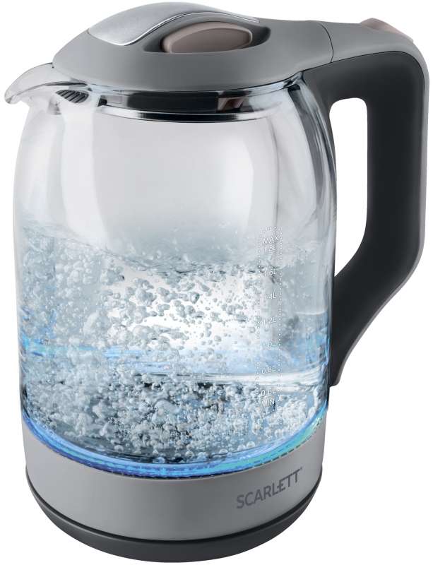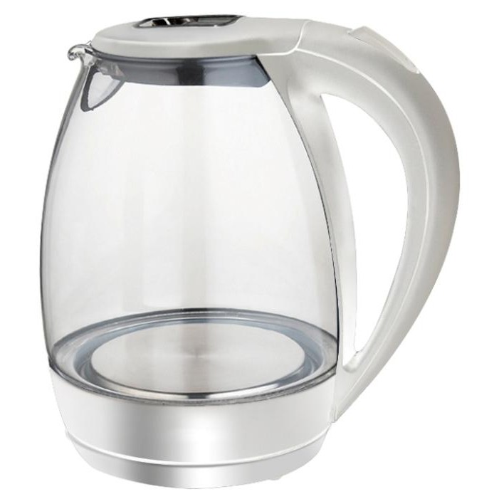 O eletrodoméstico elegante de vidro e plástico é mais conveniente em uso. A alça é feita de tal maneira que a chaleira fica perfeitamente na mão, sem criar desconforto.