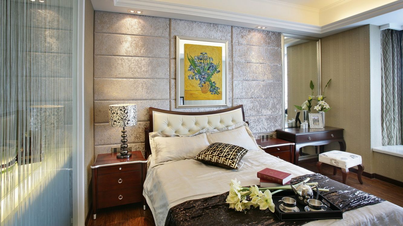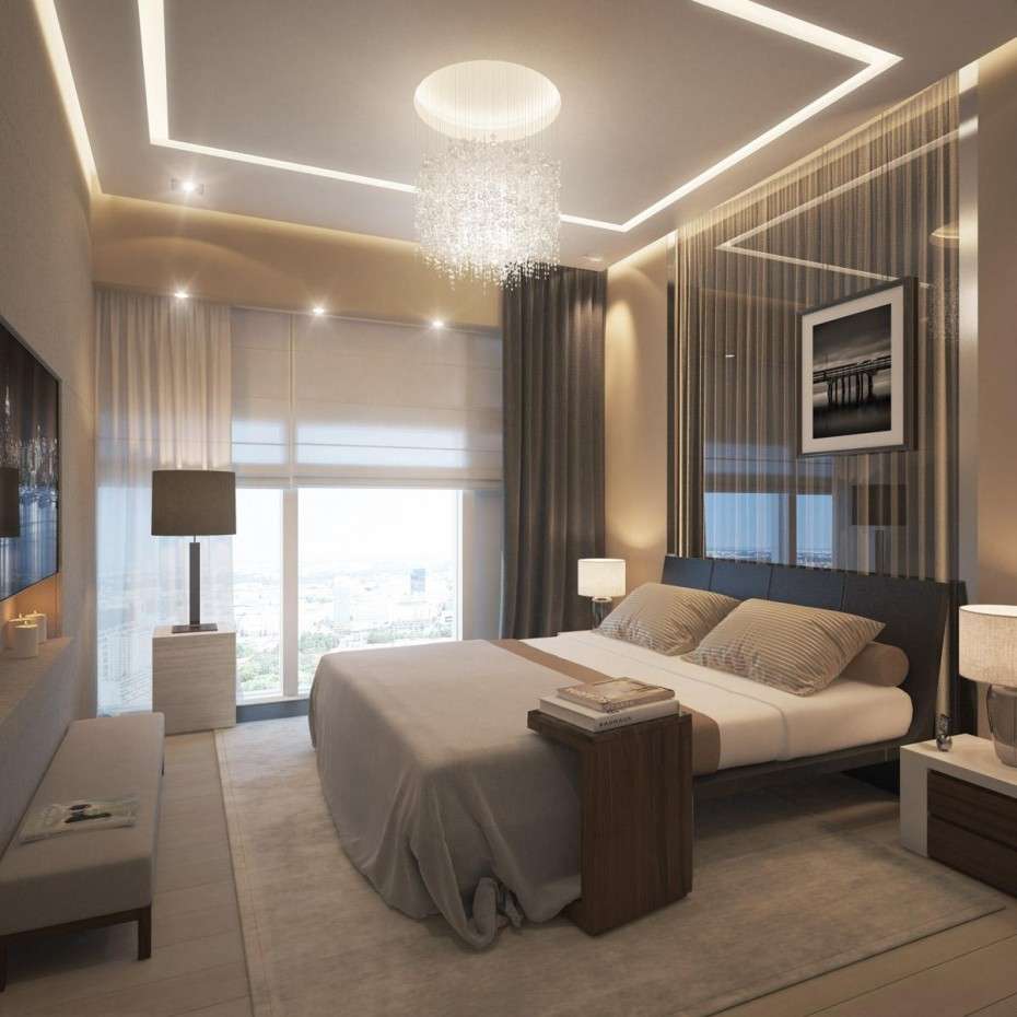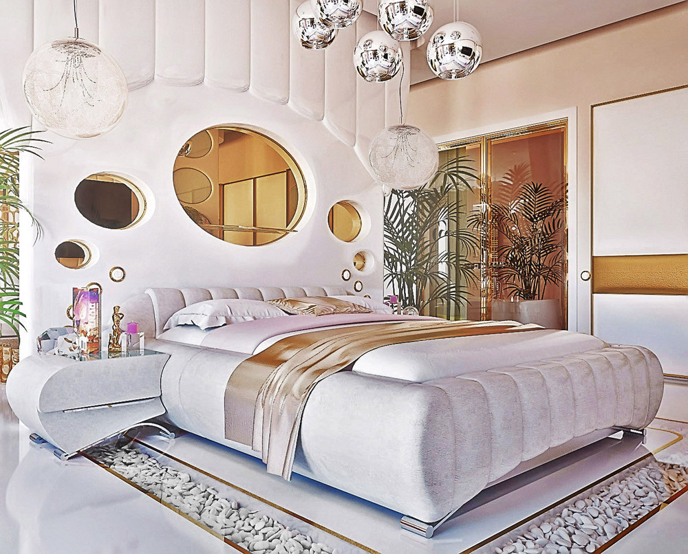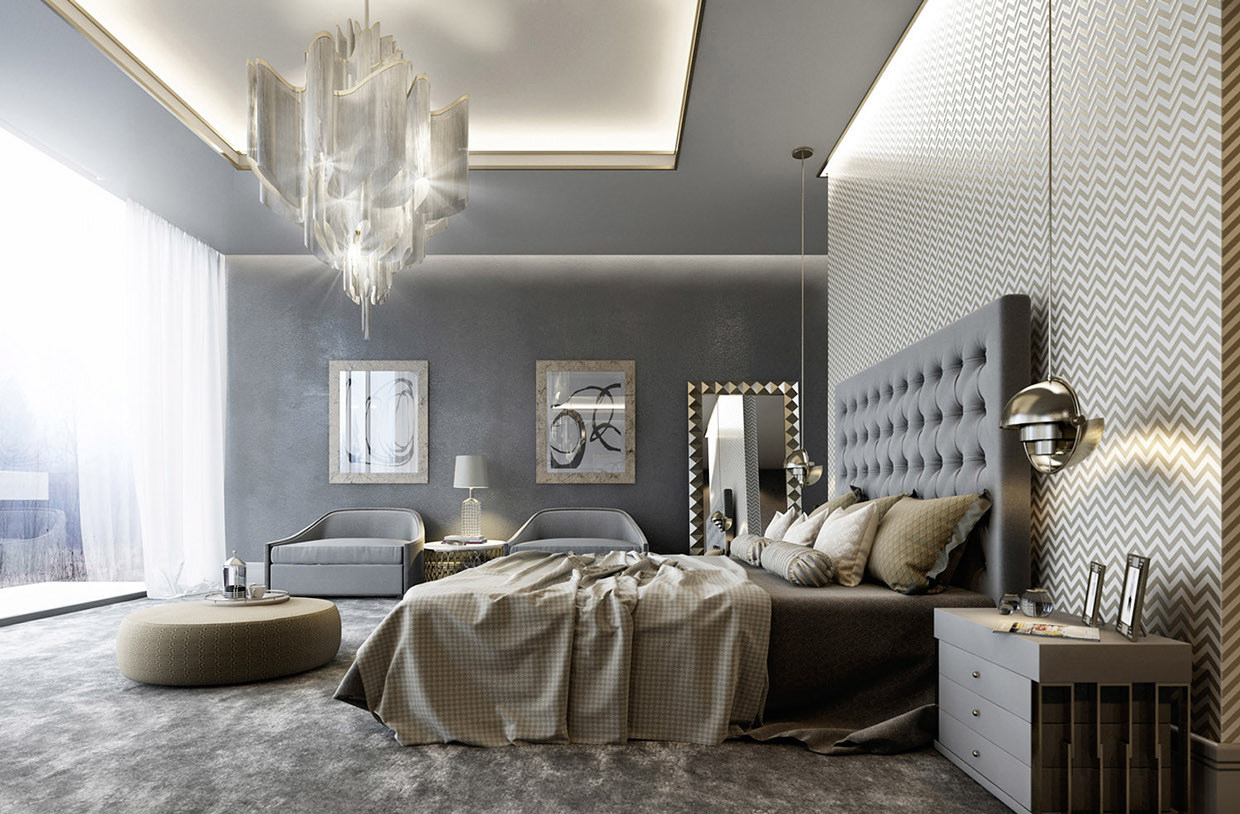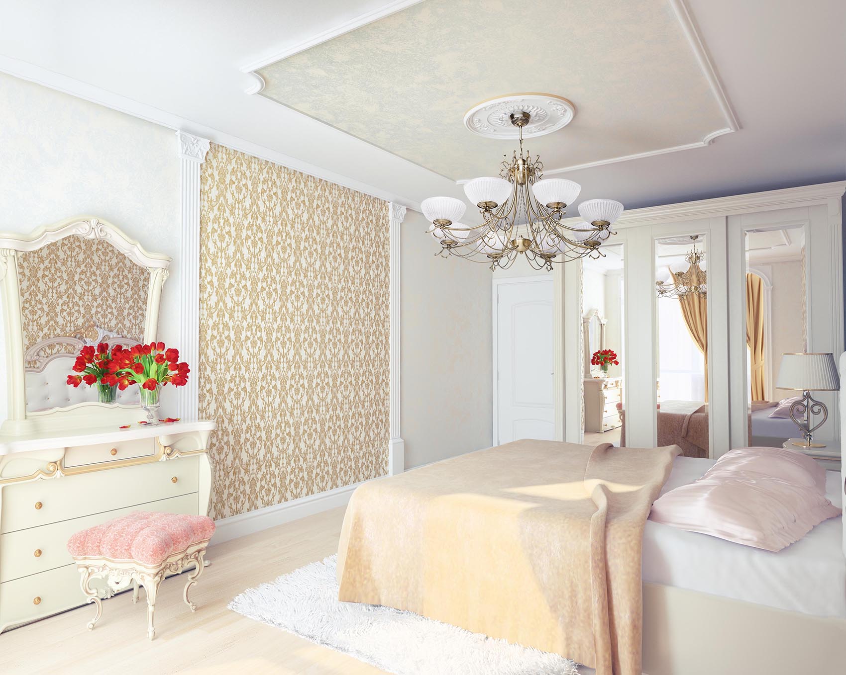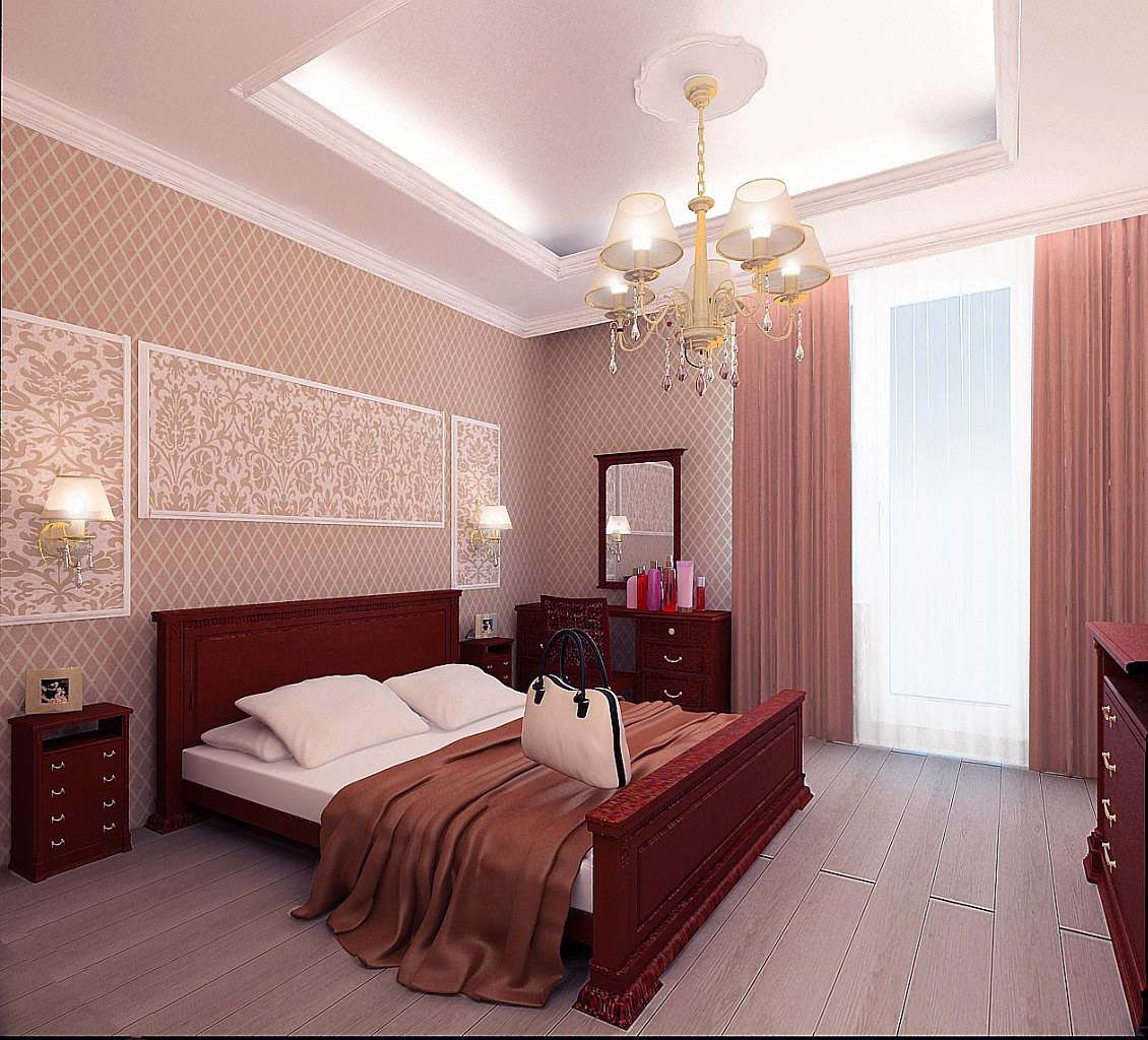 A rica decoração do quarto complementará o teto, decorado com estuque. E os profissionais afirmam que tal decoração (feita de poliuretano) pode ser anexada até mesmo a estruturas suspensas. O magnífico conjunto de baixo-relevo e candelabros de cristal dará ao quarto uma aristocracia e sofisticação especiais.