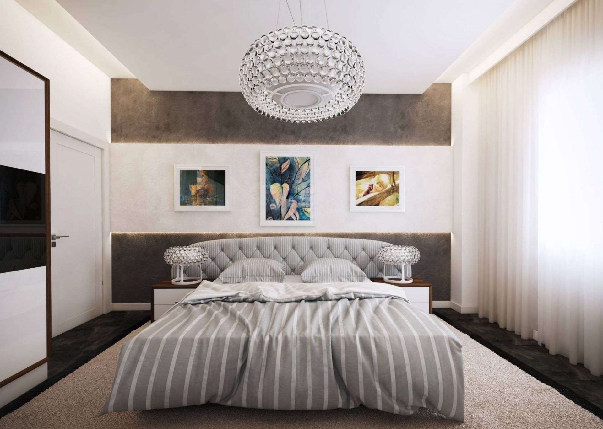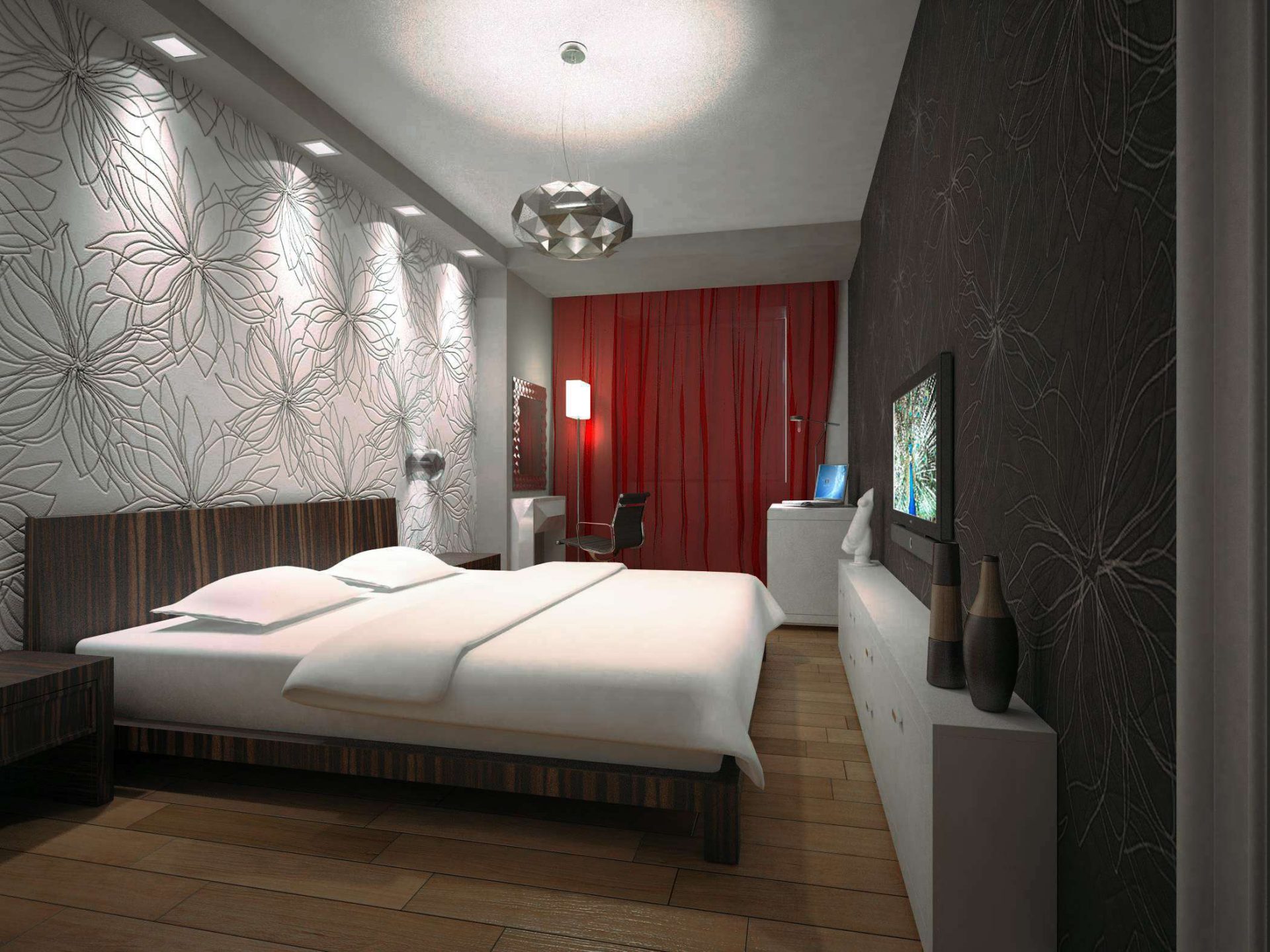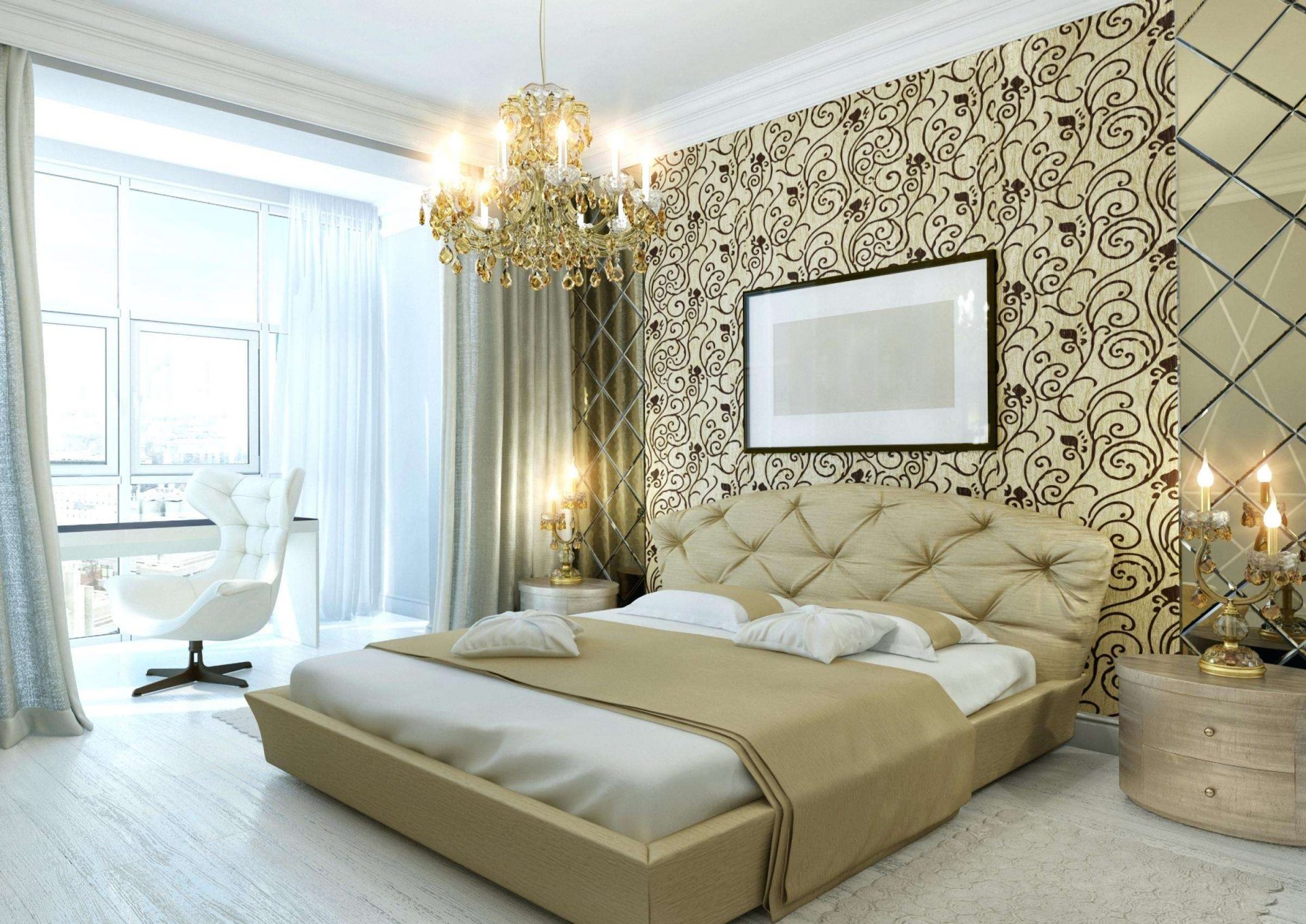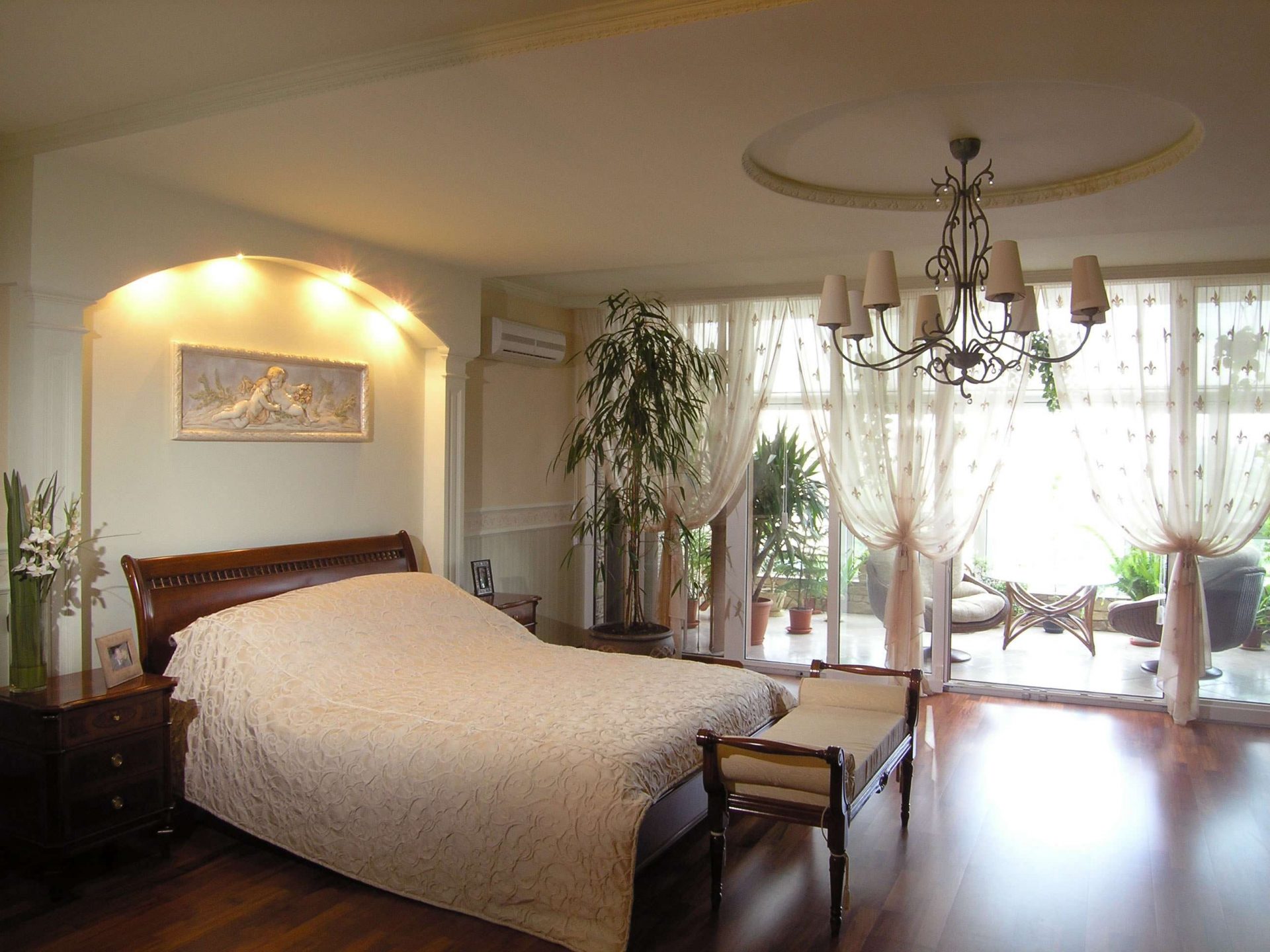A rica decoração do quarto complementará o teto, decorado com estuque. E os profissionais afirmam que tal decoração (feita de poliuretano) pode ser anexada até mesmo a estruturas suspensas. O magnífico conjunto de baixo-relevo e candelabros de cristal dará ao quarto uma aristocracia e sofisticação especiais.