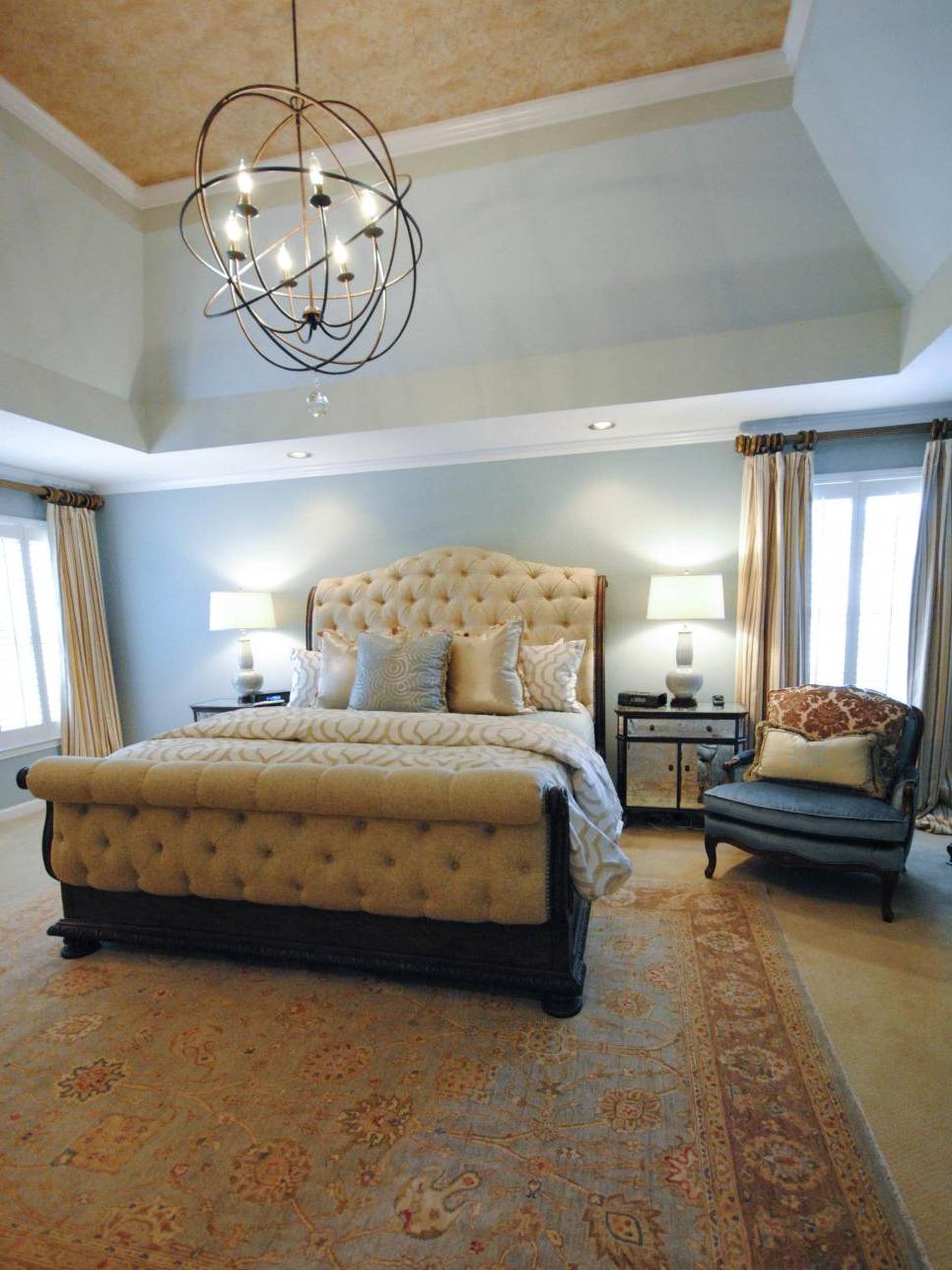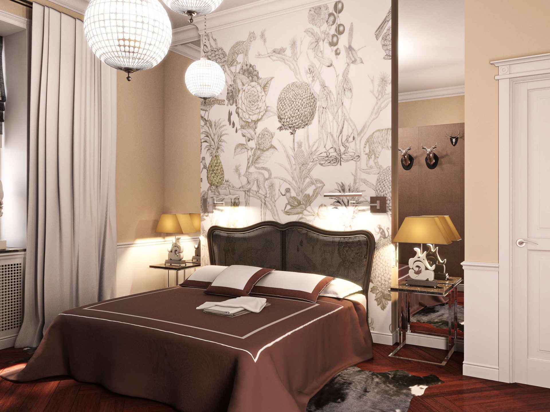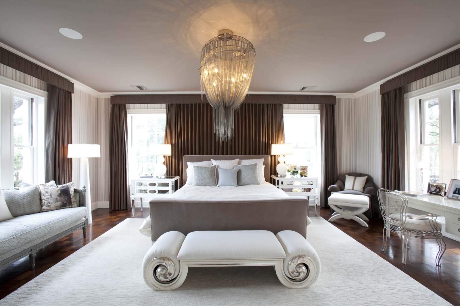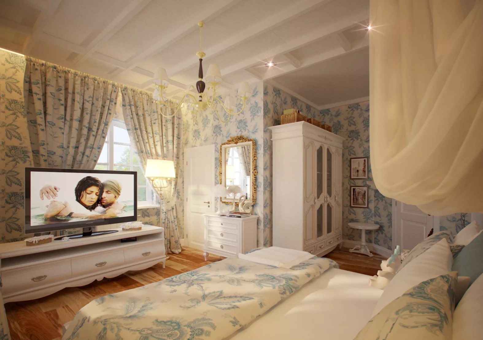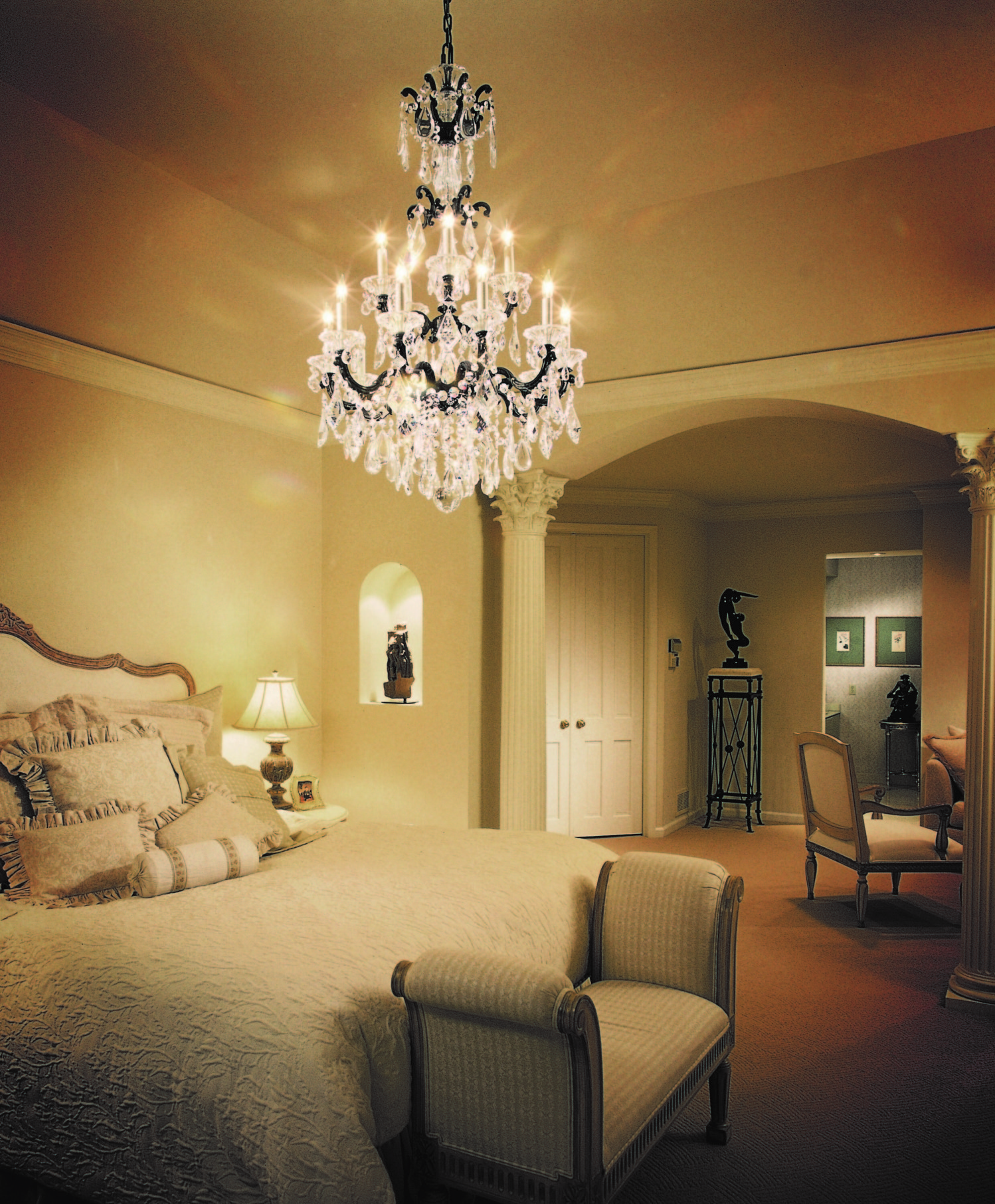 A rica decoração do quarto complementará o teto, decorado com estuque. E os profissionais afirmam que tal decoração (feita de poliuretano) pode ser anexada até mesmo a estruturas suspensas. O magnífico conjunto de baixo-relevo e candelabros de cristal dará ao quarto uma aristocracia e sofisticação especiais.