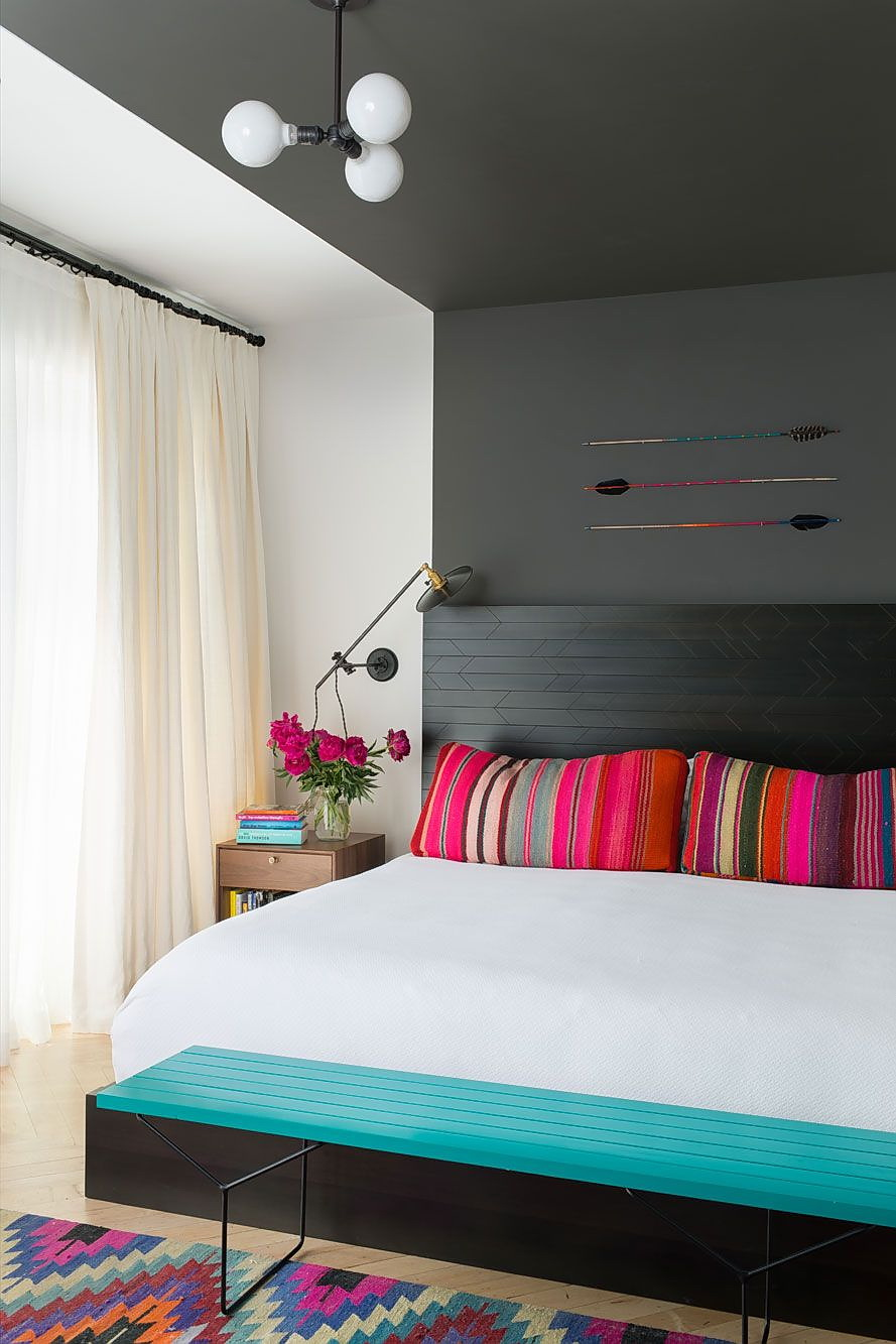 Você pode escolher um modelo que se encaixe organicamente na situação, sem se destacar visualmente no quarto. Ou a lâmpada se tornará um elemento de design brilhante. Se você gostou do lustre multi-colorido, então é desejável que, no cenário, decoração do quarto alguns tons do abajur / teto sejam repetidos.