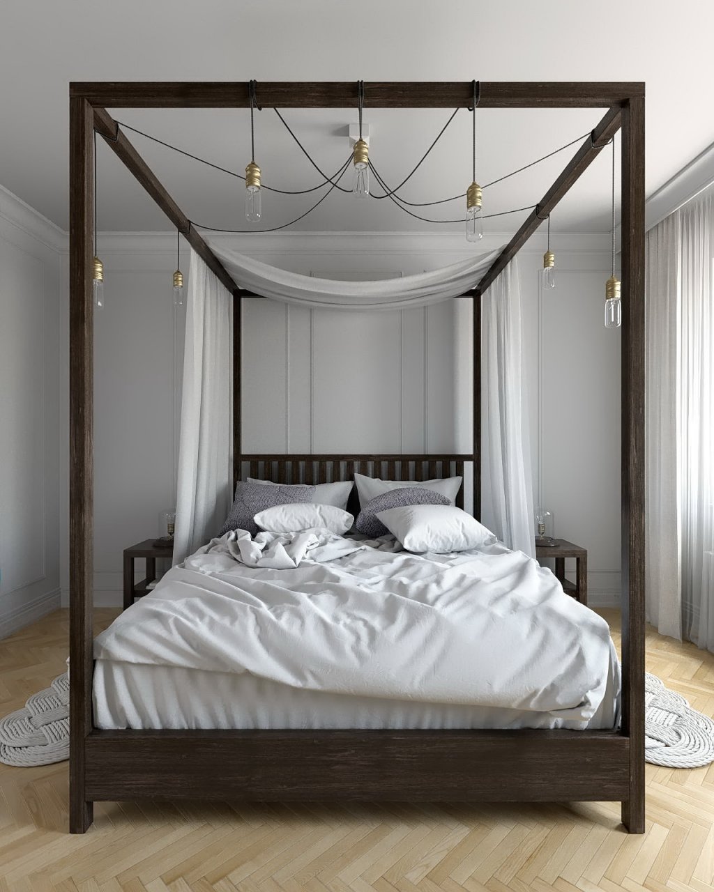 Naturam sonhava como um quarto, decorado em um estilo rústico acolhedor e tranquilo. A luz suave e difusa cria uma atmosfera relaxante e calma. Naturalmente, o candelabro é digno de se tornar o destaque da sala.