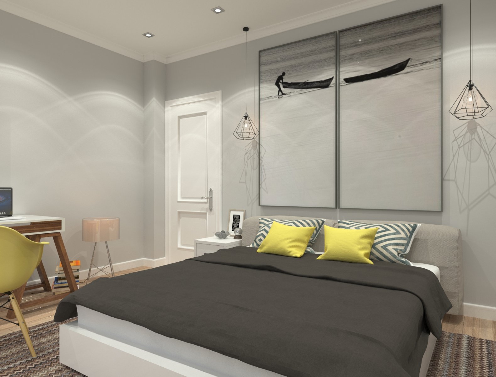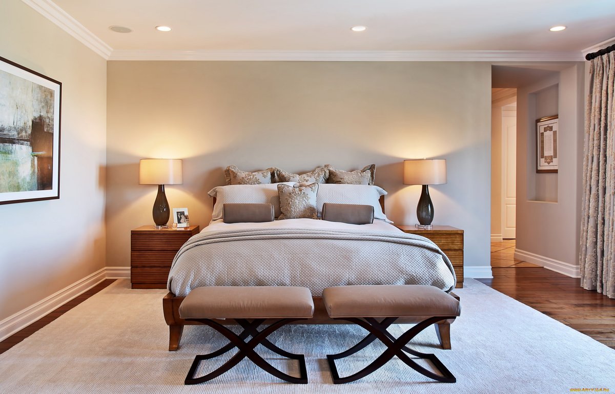 Concisão harmoniosa - uma característica adequada do interior. Ao escolher uma decoração de quarto, a preferência é dada a objetos de formas simples, desprovidos de decoração luminosa. A sala é geralmente livre de itens desnecessários. Cama, armáriocabeceira mesas de cabeceira - esse conjunto de móveis, o que é suficiente. Ao criar uma paleta de cores custa em três cores, principalmente cores vivas (branco, areia, marrom claro, cinza).