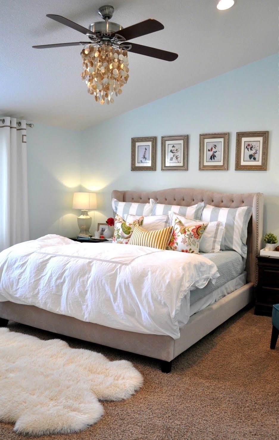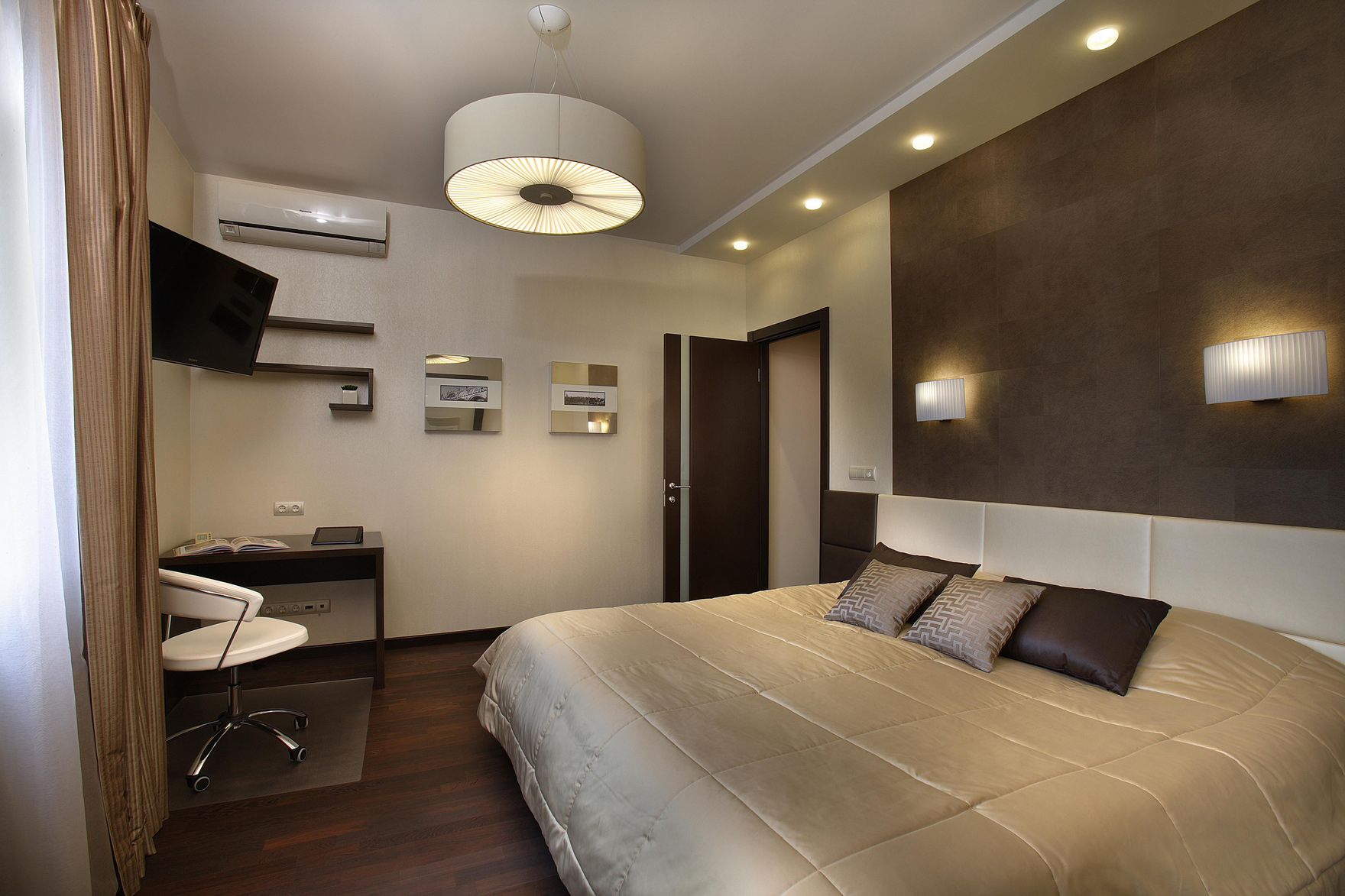 - a seleção do modelo depende da altura tecto. Em salas baixas, recomenda-se a instalação de um lustre de teto para que, quando em movimento, você não tenha medo de tocá-lo. Uma luminária destacará a altura do teto e acrescentará espaço visual ao quarto;