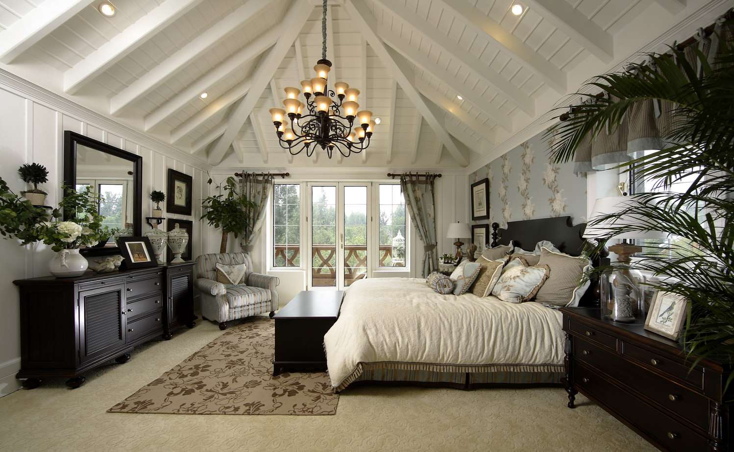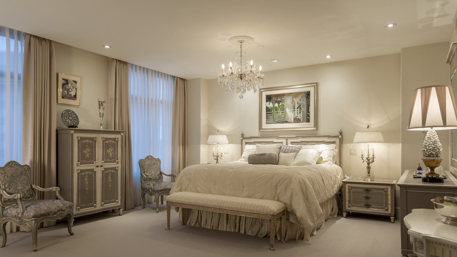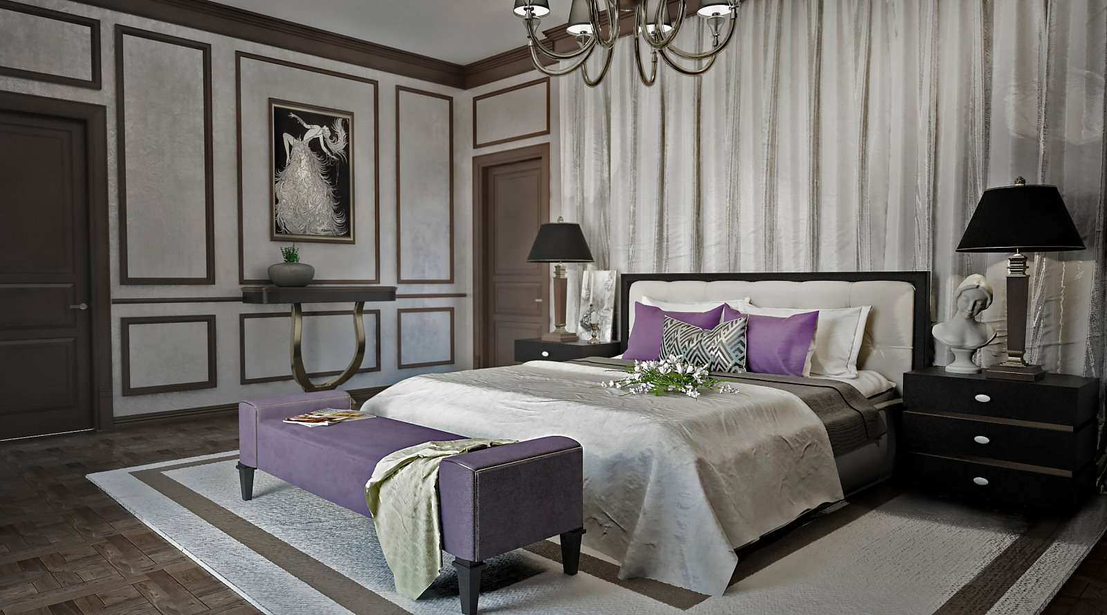 Este estilo é especialmente apreciado por pessoas criativas, aristocráticas. O interior é chique e luxuoso. Os espaçosos quartos estão decorados com tecidos ricos, materiais valiosos e móveis, decorados com ouro. Uma comitiva variada na forma de estátuas, candelabros, cortinas caras, espelhos em molduras padronizadas é bem-vinda. A base da paleta é tons de Borgonha, verde, roxo. Lustres magníficos destacam a sofisticação do quarto: