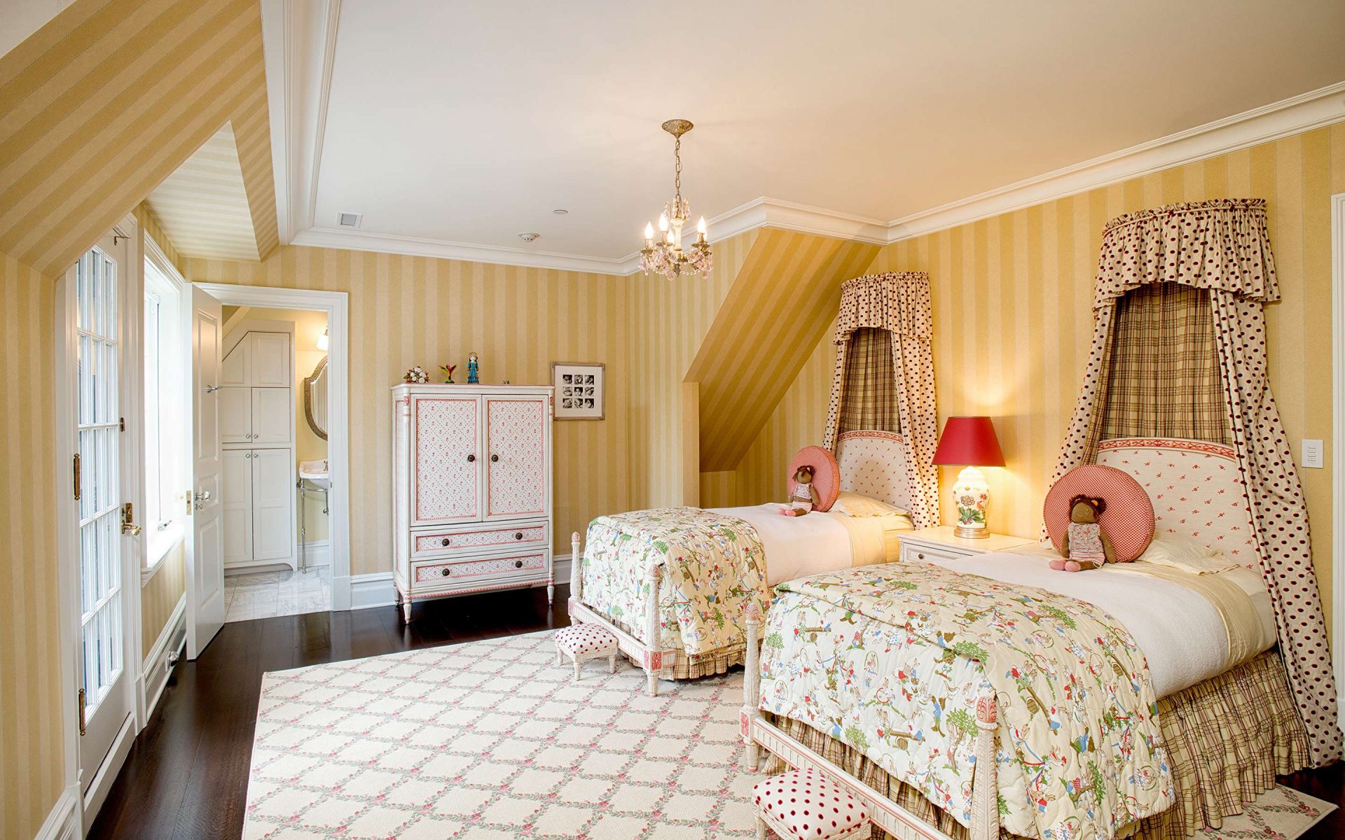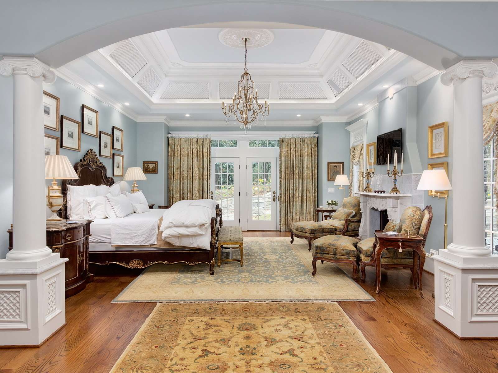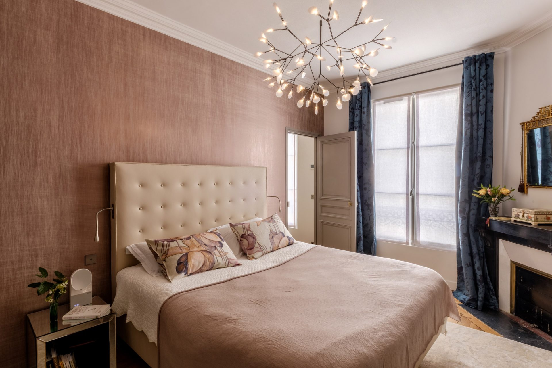 Este estilo é especialmente apreciado por pessoas criativas, aristocráticas. O interior é chique e luxuoso. Os espaçosos quartos estão decorados com tecidos ricos, materiais valiosos e móveis, decorados com ouro. Uma comitiva variada na forma de estátuas, candelabros, cortinas caras, espelhos em molduras padronizadas é bem-vinda. A base da paleta é tons de Borgonha, verde, roxo. Lustres magníficos destacam a sofisticação do quarto: