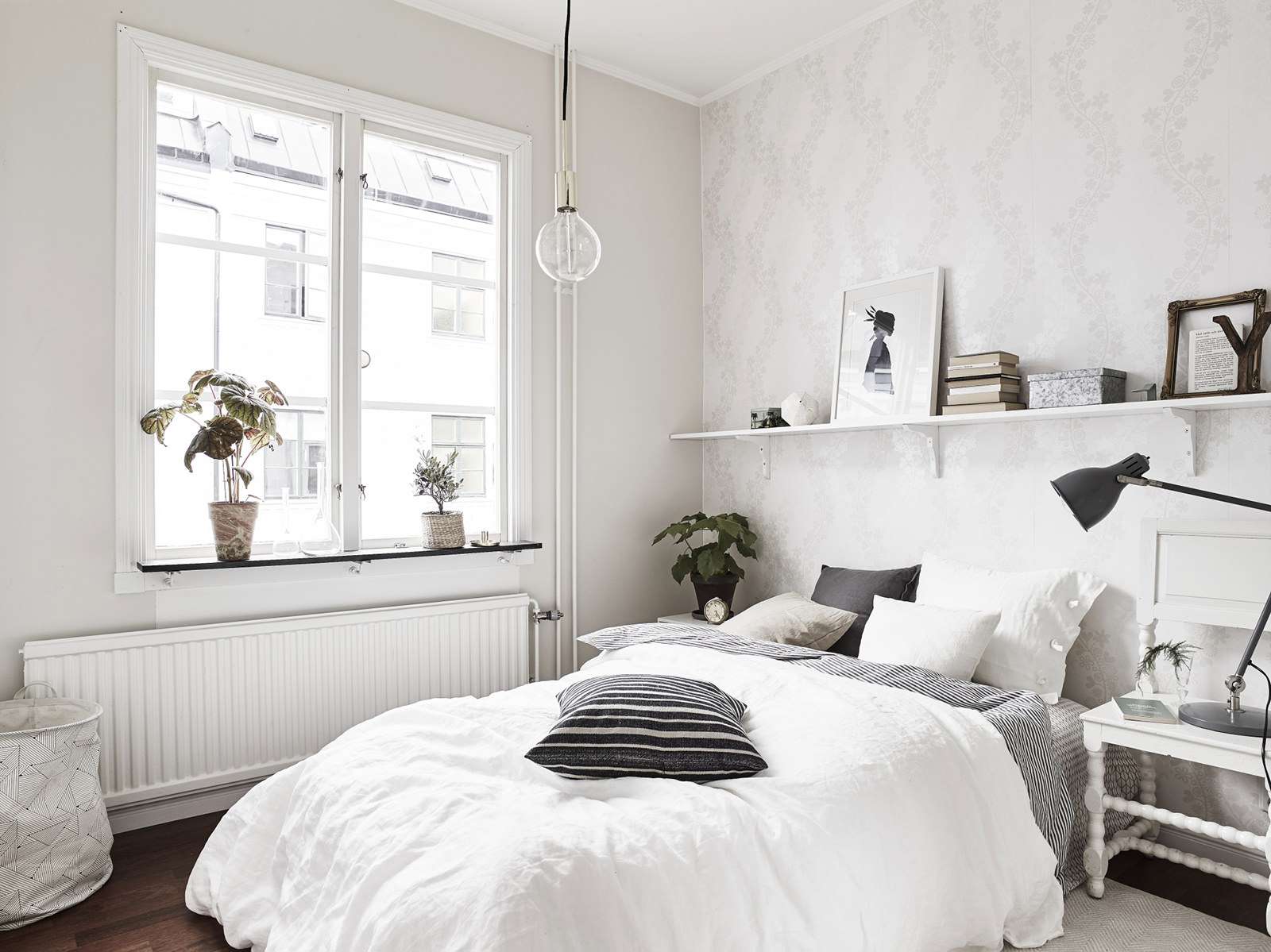 A cor branca domina os interiores escandinavos. Portanto, os quartos são claros e espaçosos. Este é um tom adequado para o design de uma pequena sala.. Para não perder a luz, as lâmpadas são montadas com persianas abertas, apontando para os lados ou para baixo.